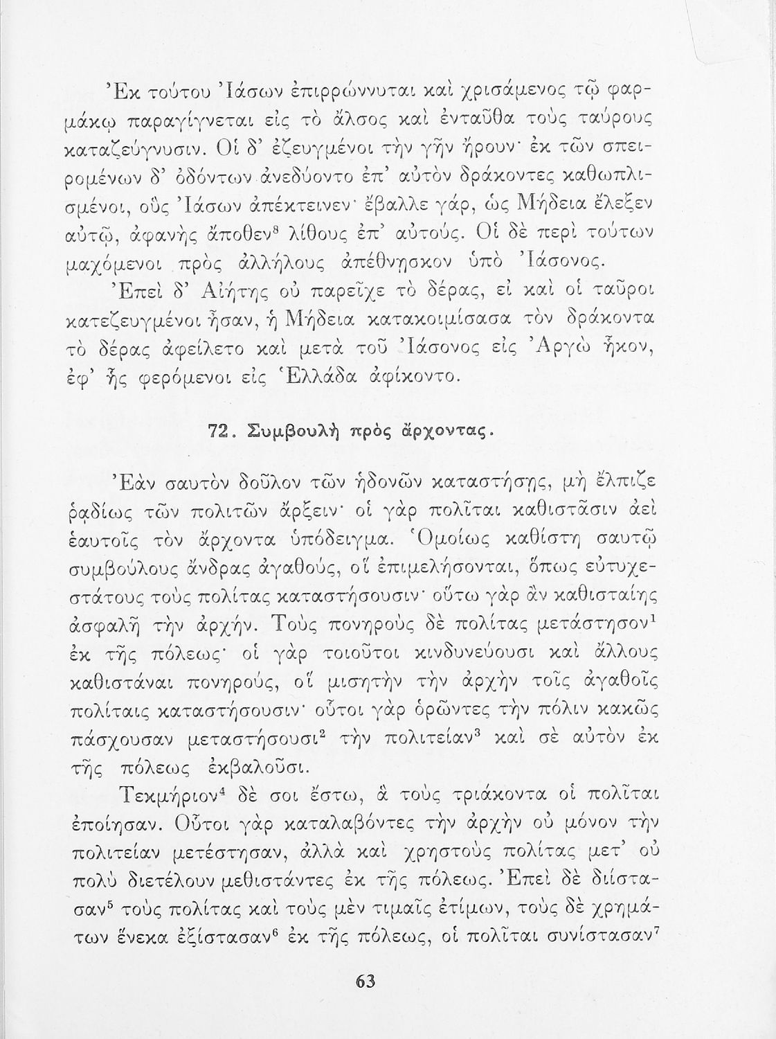 Σχολικό Εγχειρίδιο Αρχαίων Ελληνικών που περιλαμβάνει κείμενα προσαρμοσμένα στη διδασκαλία των γραμματικών και συντακτικών φαινομένων, και ερμηνευτικές και λεξιλογικές σημειώσεις.