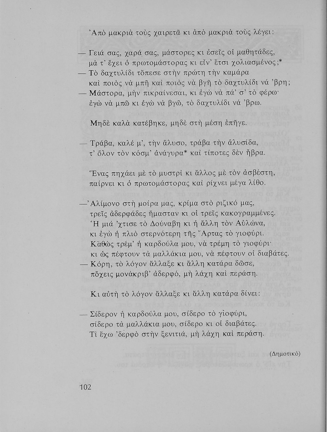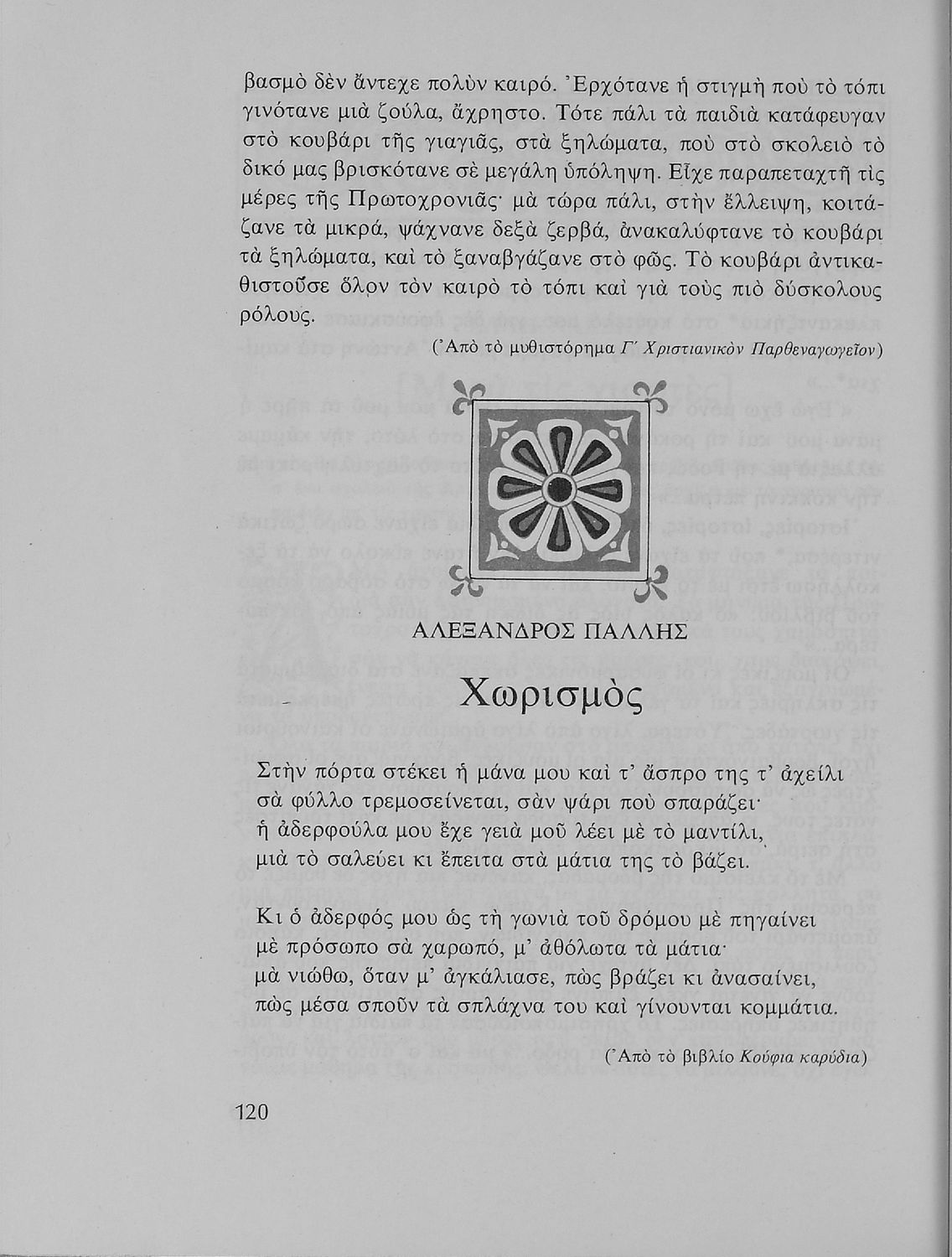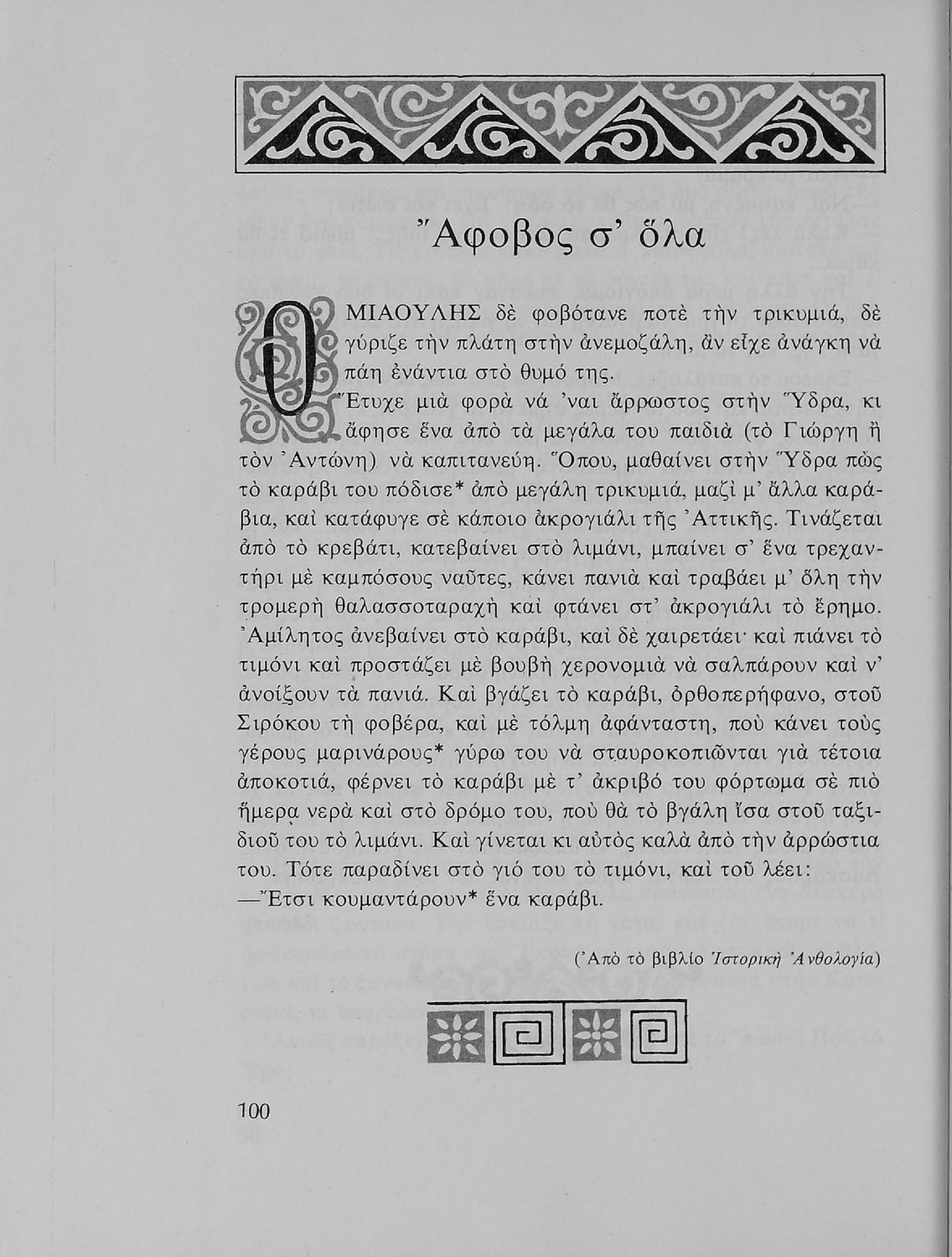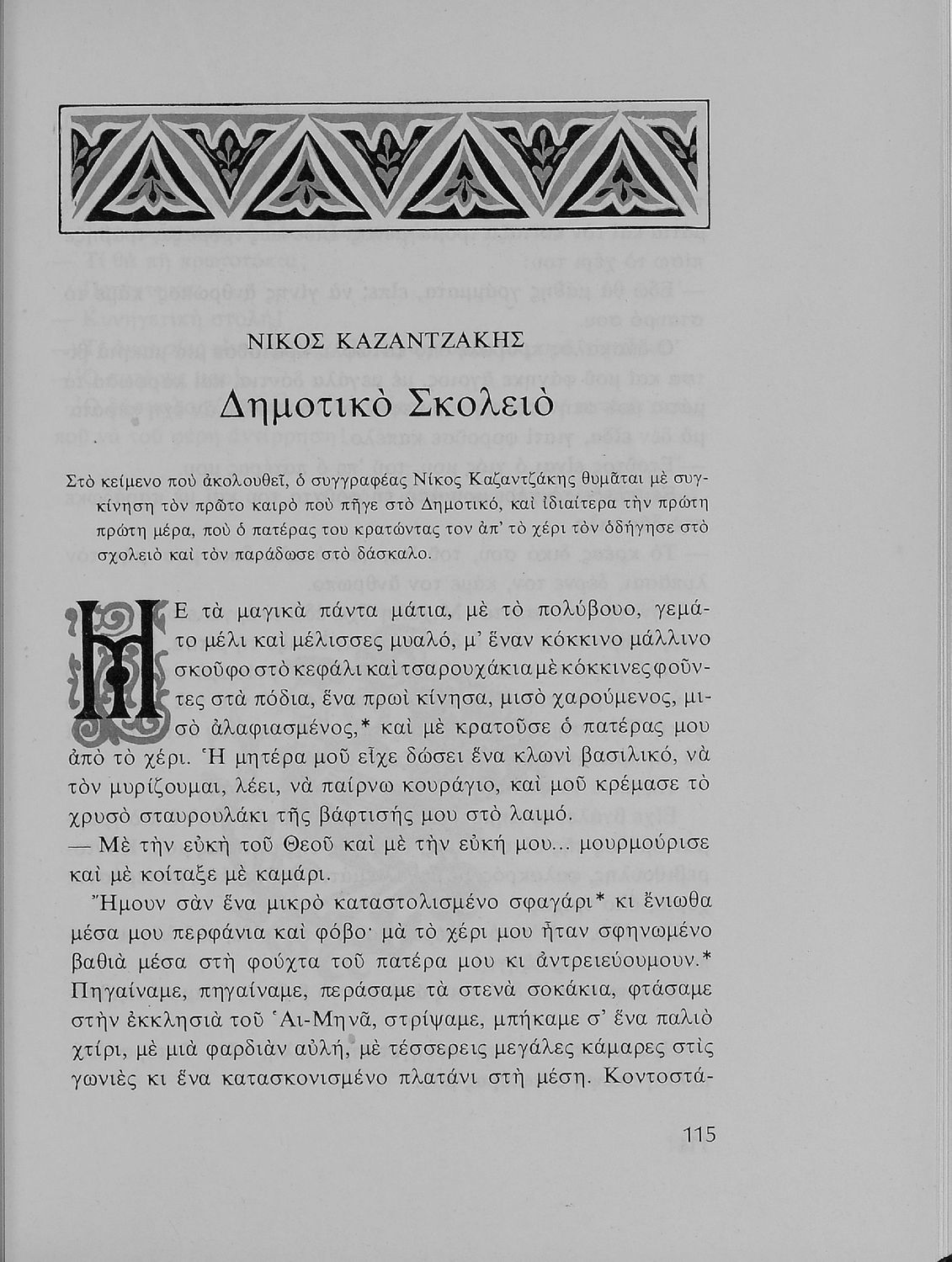 Αναγνωστικό για τις Ε' και ΣΤ΄ Δημοτικού που περιλαμβάνει πεζά και ποιήματα της Νέας Ελληνικής Λογοτεχνίας εμπνευσμένα από την καθημερινότητα των παιδιών και των οικογενειών τους, την ελληνική ιστορία, τις οικογενειακές στιγμές και εορτές, το παιχνίδι και την εθνική παράδοση, και τα δημοτικά και ακριτικά τραγούδια. Περιέχει και 5 κείμενα γραμμένα στην καθαρεύουσα με θέματα από τον κοινωνικό και εθνικό βίο, και ερμηνευτικό λεξιλόγιο.. Το βιβλίο είναι αφιερωμένο στη μνήμη της Πηνελόπης Δέλτα.