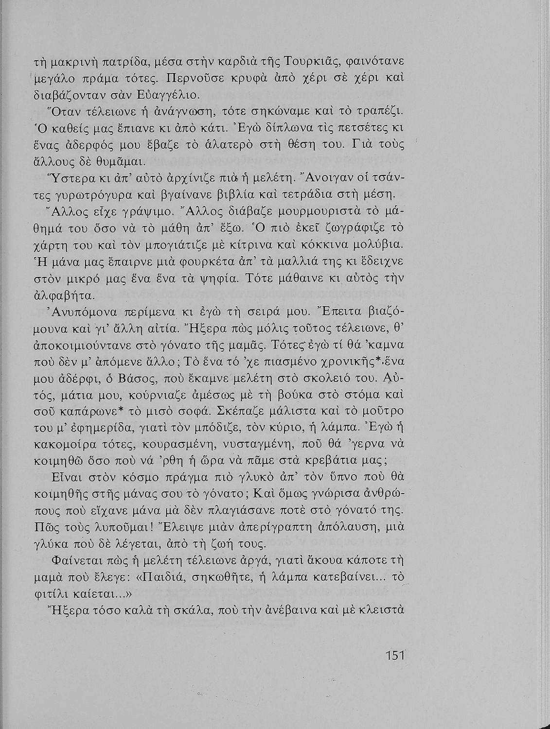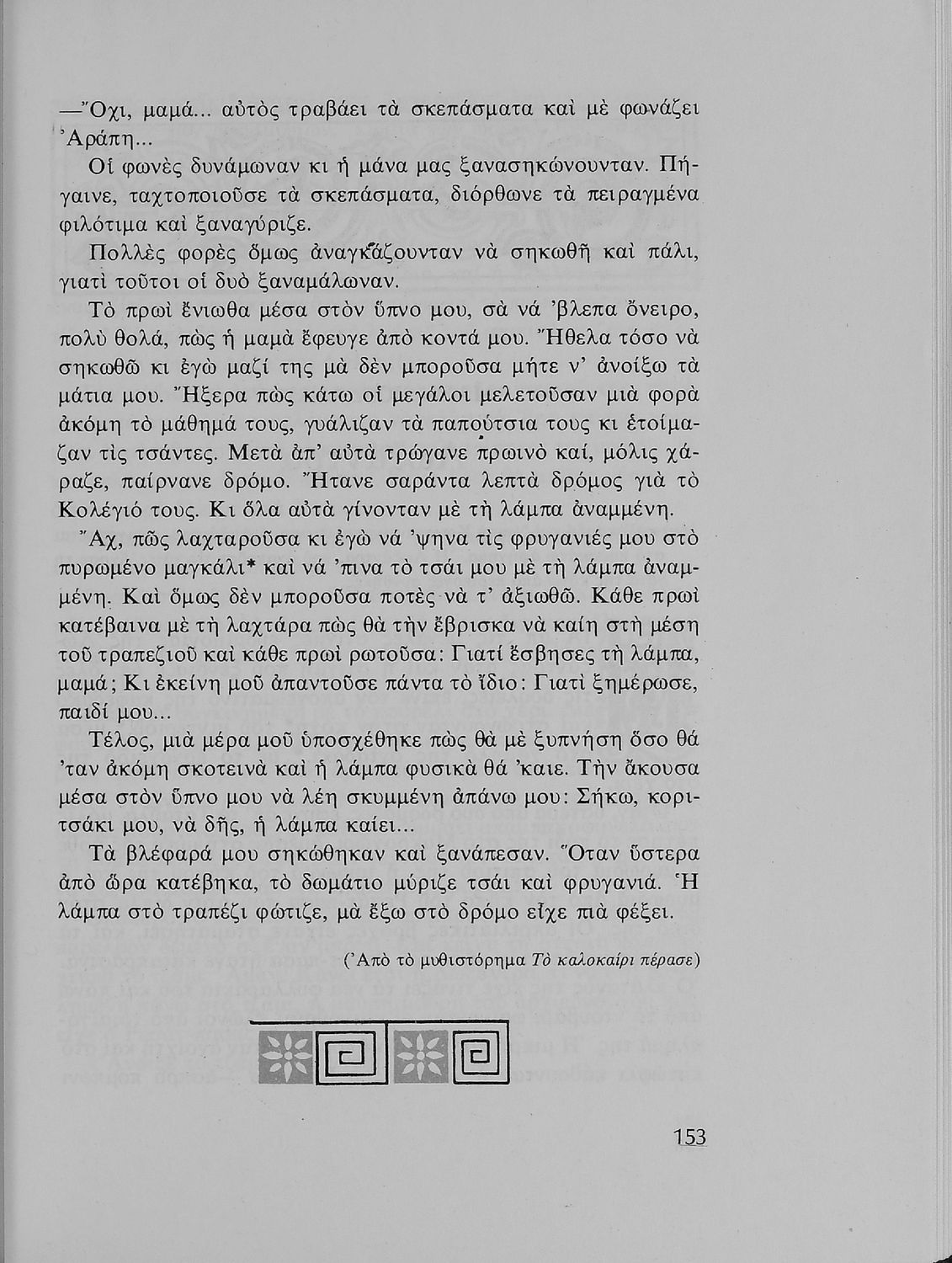Αναγνωστικό για τις Ε' και ΣΤ΄ Δημοτικού που περιλαμβάνει πεζά και ποιήματα της Νέας Ελληνικής Λογοτεχνίας εμπνευσμένα από την καθημερινότητα των παιδιών και των οικογενειών τους, την ελληνική ιστορία, τις οικογενειακές στιγμές και εορτές, το παιχνίδι και την εθνική παράδοση, και τα δημοτικά και ακριτικά τραγούδια. Περιέχει και 5 κείμενα γραμμένα στην καθαρεύουσα με θέματα από τον κοινωνικό και εθνικό βίο, και ερμηνευτικό λεξιλόγιο.. Το βιβλίο είναι αφιερωμένο στη μνήμη της Πηνελόπης Δέλτα.