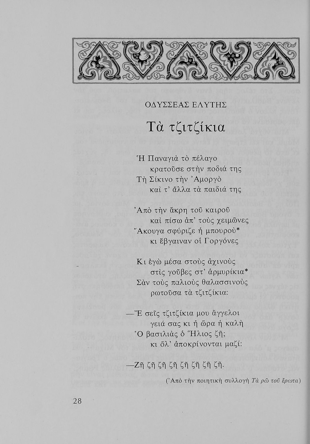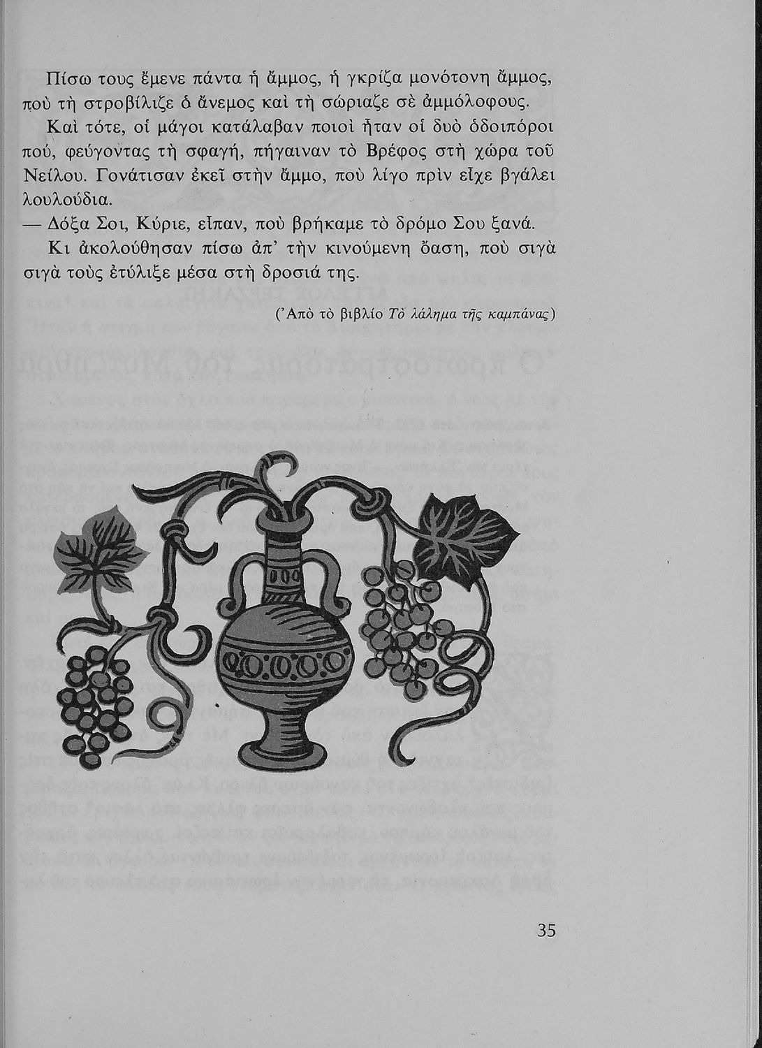 Αναγνωστικό για τις Ε' και ΣΤ΄ Δημοτικού που περιλαμβάνει πεζά και ποιήματα της Νέας Ελληνικής Λογοτεχνίας εμπνευσμένα από την καθημερινότητα των παιδιών και των οικογενειών τους, την ελληνική ιστορία, τις οικογενειακές στιγμές και εορτές, το παιχνίδι και την εθνική παράδοση, και τα δημοτικά και ακριτικά τραγούδια. Περιέχει και 5 κείμενα γραμμένα στην καθαρεύουσα με θέματα από τον κοινωνικό και εθνικό βίο, και ερμηνευτικό λεξιλόγιο.. Το βιβλίο είναι αφιερωμένο στη μνήμη της Πηνελόπης Δέλτα.