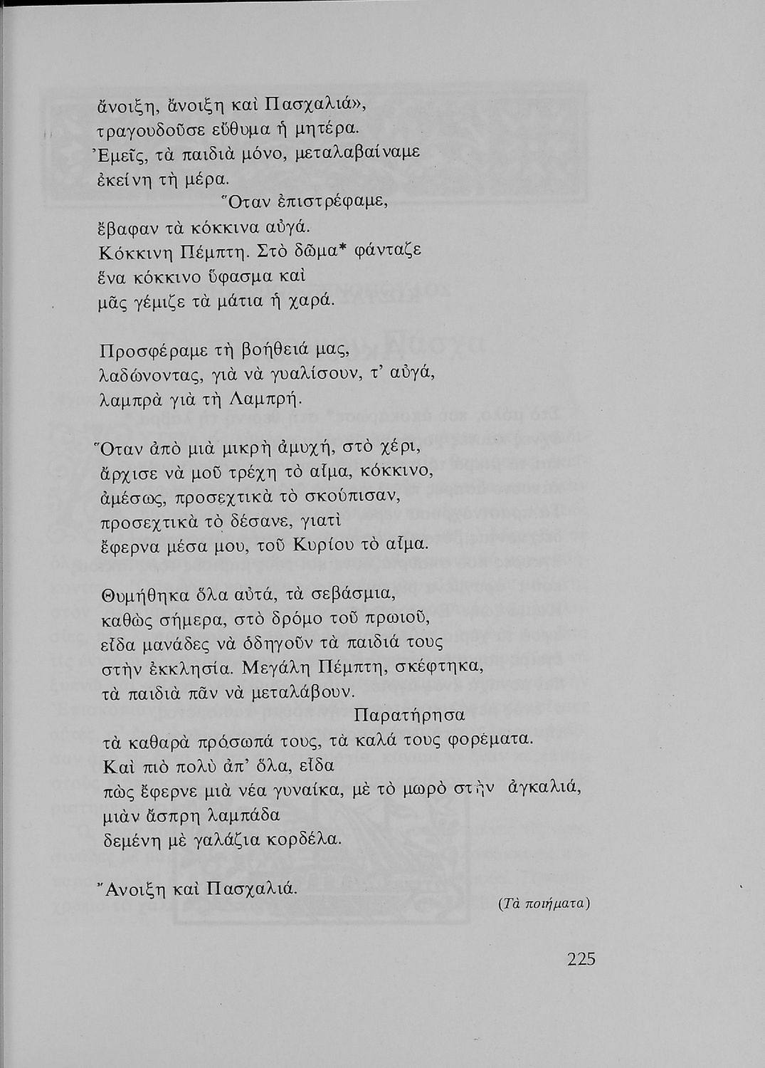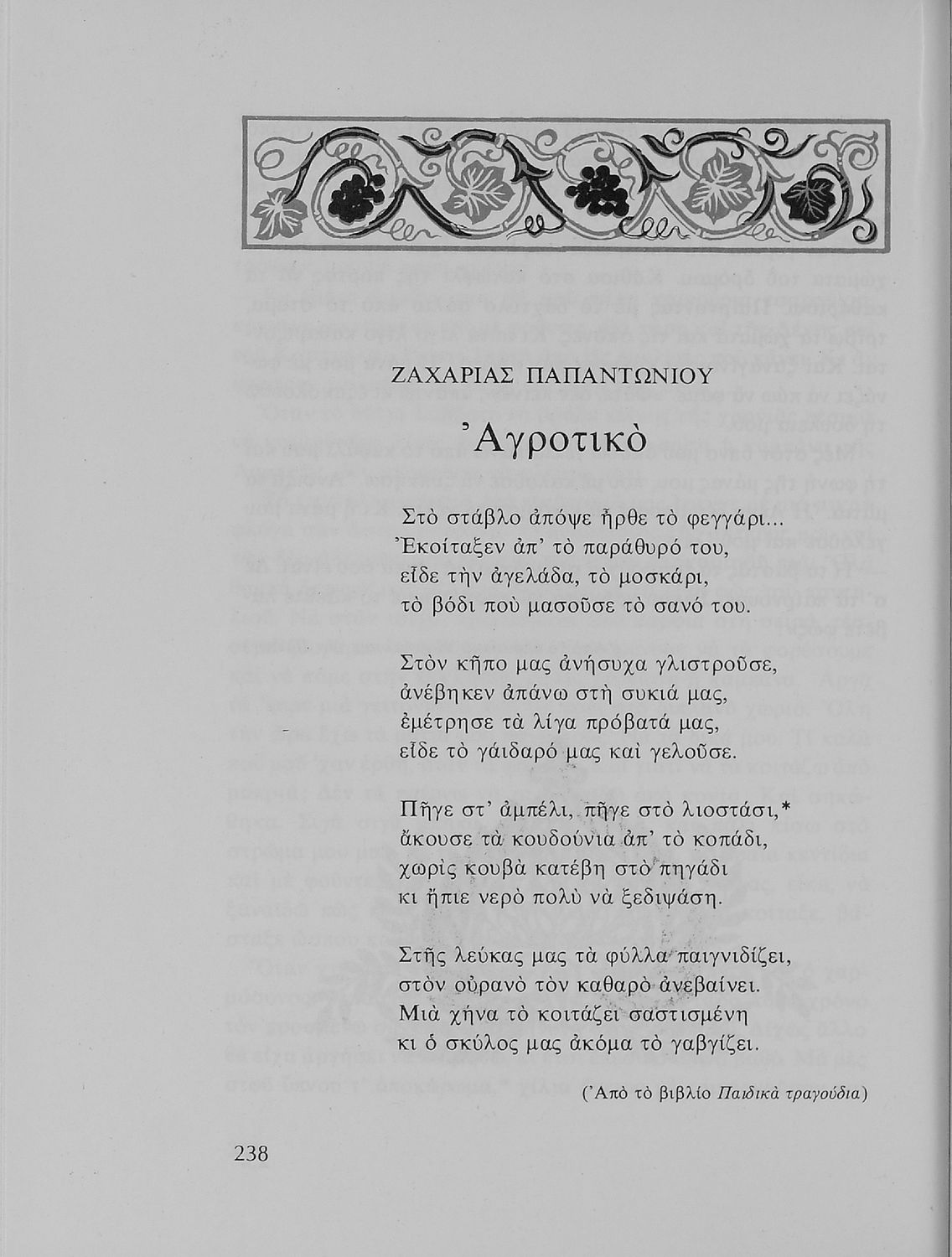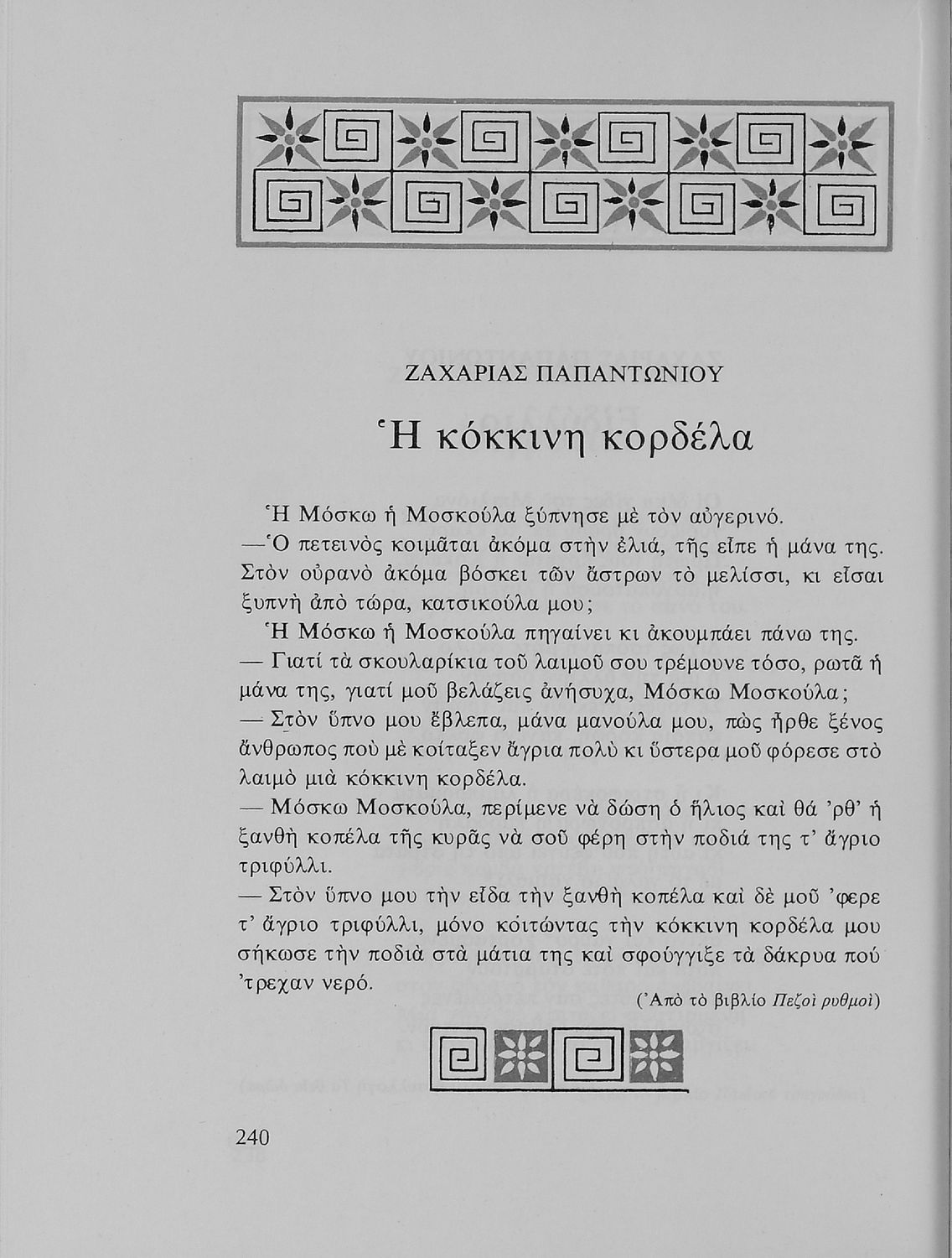 Αναγνωστικό για τις Ε' και ΣΤ΄ Δημοτικού που περιλαμβάνει πεζά και ποιήματα της Νέας Ελληνικής Λογοτεχνίας εμπνευσμένα από την καθημερινότητα των παιδιών και των οικογενειών τους, την ελληνική ιστορία, τις οικογενειακές στιγμές και εορτές, το παιχνίδι και την εθνική παράδοση, και τα δημοτικά και ακριτικά τραγούδια. Περιέχει και 5 κείμενα γραμμένα στην καθαρεύουσα με θέματα από τον κοινωνικό και εθνικό βίο, και ερμηνευτικό λεξιλόγιο.. Το βιβλίο είναι αφιερωμένο στη μνήμη της Πηνελόπης Δέλτα.