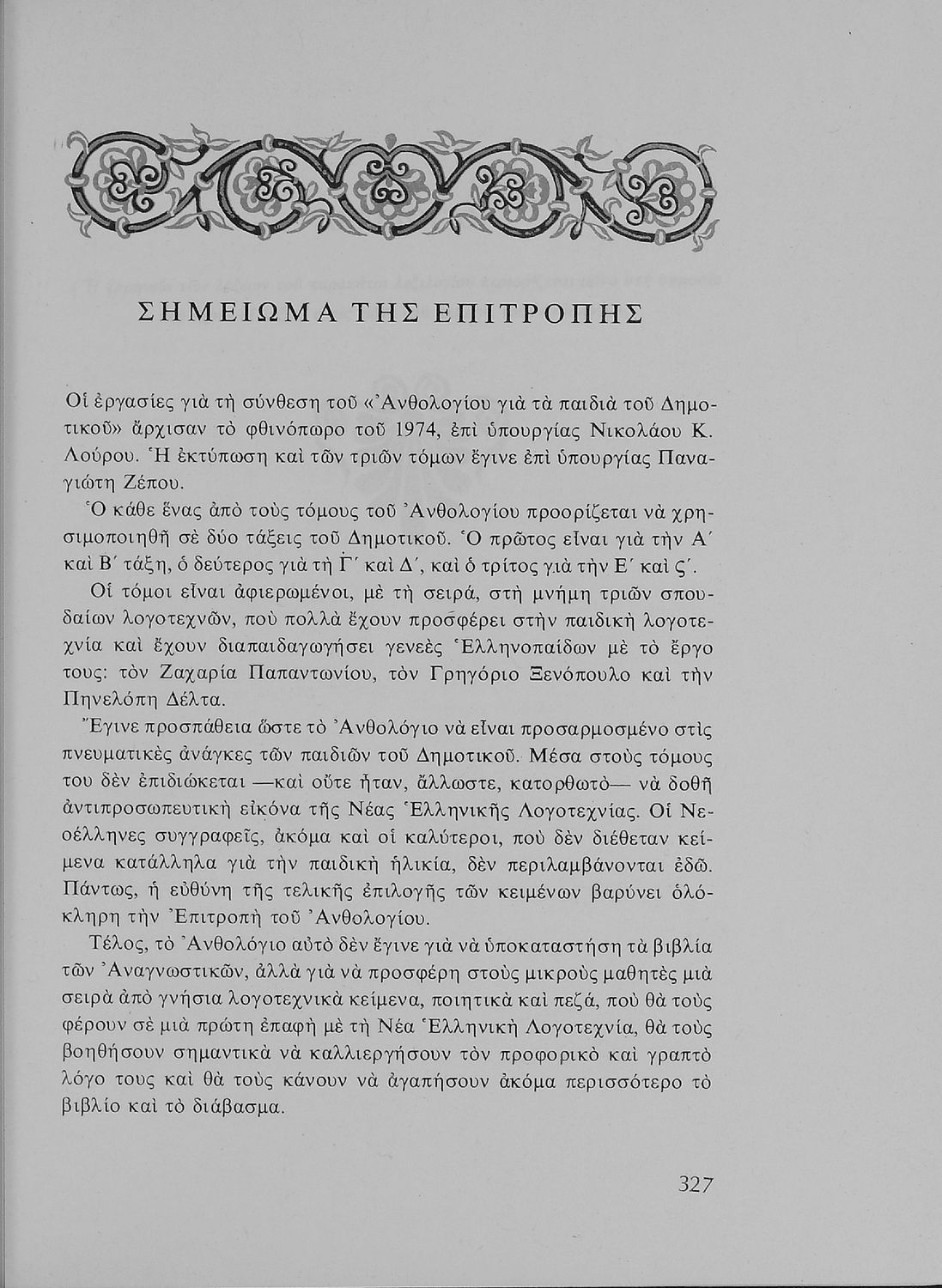 Αναγνωστικό για τις Ε' και ΣΤ΄ Δημοτικού που περιλαμβάνει πεζά και ποιήματα της Νέας Ελληνικής Λογοτεχνίας εμπνευσμένα από την καθημερινότητα των παιδιών και των οικογενειών τους, την ελληνική ιστορία, τις οικογενειακές στιγμές και εορτές, το παιχνίδι και την εθνική παράδοση, και τα δημοτικά και ακριτικά τραγούδια. Περιέχει και 5 κείμενα γραμμένα στην καθαρεύουσα με θέματα από τον κοινωνικό και εθνικό βίο, και ερμηνευτικό λεξιλόγιο.. Το βιβλίο είναι αφιερωμένο στη μνήμη της Πηνελόπης Δέλτα.