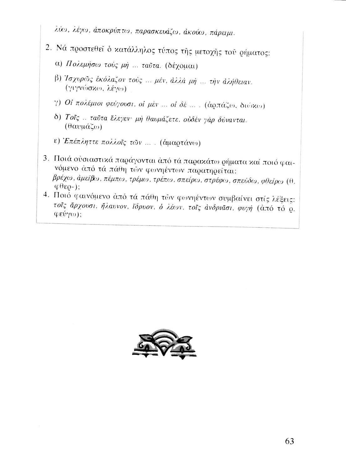 Σχολικό εγχειρίδιο Αρχαίων Ελληνικών για τις Α΄, Β΄ και Γ΄ Λυκείου που εξετάζει τα μέρη του λόγου και την σύνταξή τους.