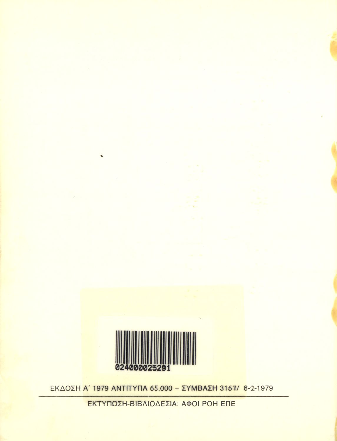 Εκδότης: Οργανισμός Εκδόσεως Διδακτικών Βιβλίων Έτος έκδοσης: 1979 Τόπος έκδοσης: Αθήνα Έκδοση: 1η Υπουργική απόφαση / Σύμβαση: 3167/8-2-1979 Έτος έγκρισης: 1979 |