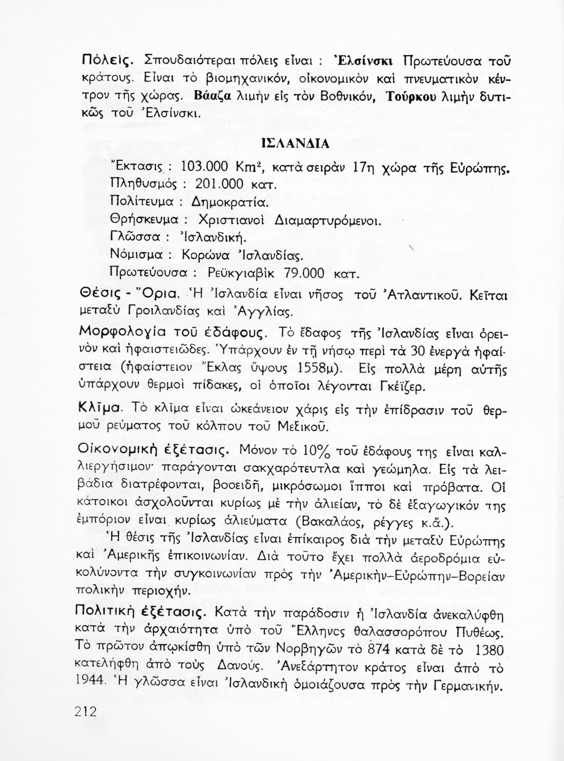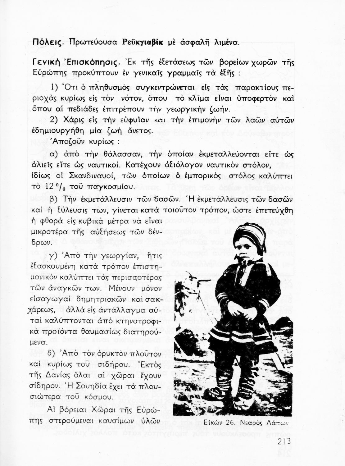 Βαθμίδα εκπαίδευσης: Δευτεροβάθμια Τάξη: Β' Γυμνασίου Μάθημα: Γεωγραφία Γλώσσα: Καθαρεύουσα Παρουσίαση περιεχομένου: Σχολικό εγχειρίδιο Γεωγραφίας Β' Γυμνασίου που περιλαμβάνει εισαγωγή στη φυσική και μαθηματική γεωγραφία και παρουσιάζει τις χώρες της Ευρώπης από γεωμορφολογική, πολιτική, πολιτισμική και οικονομική άποψη. Περιέχει και αναφορά στις οικονομικές σχέσεις της Ελλάδας με τα ευρωπαϊκά κράτη. Φέρει το σύμβολο της δικτατορίας. |