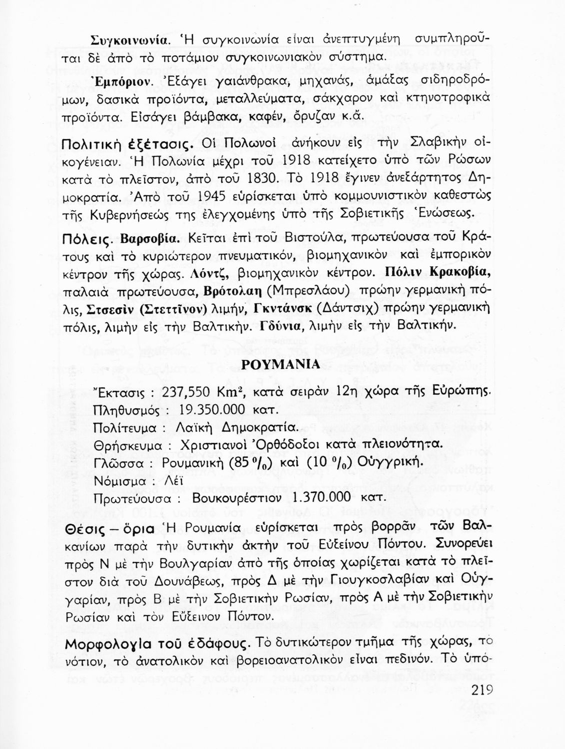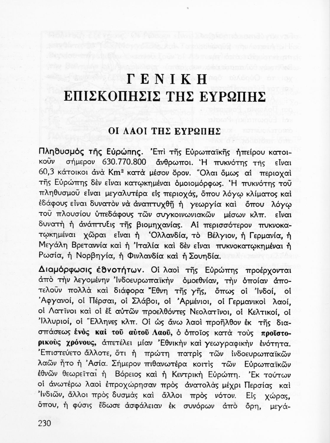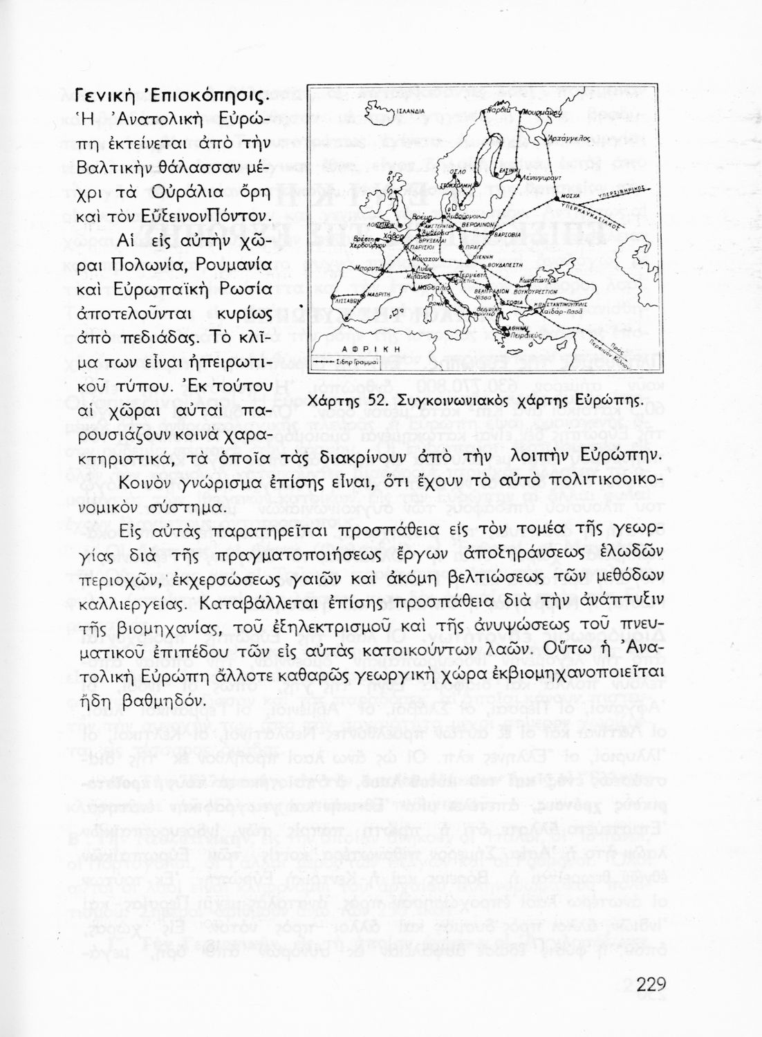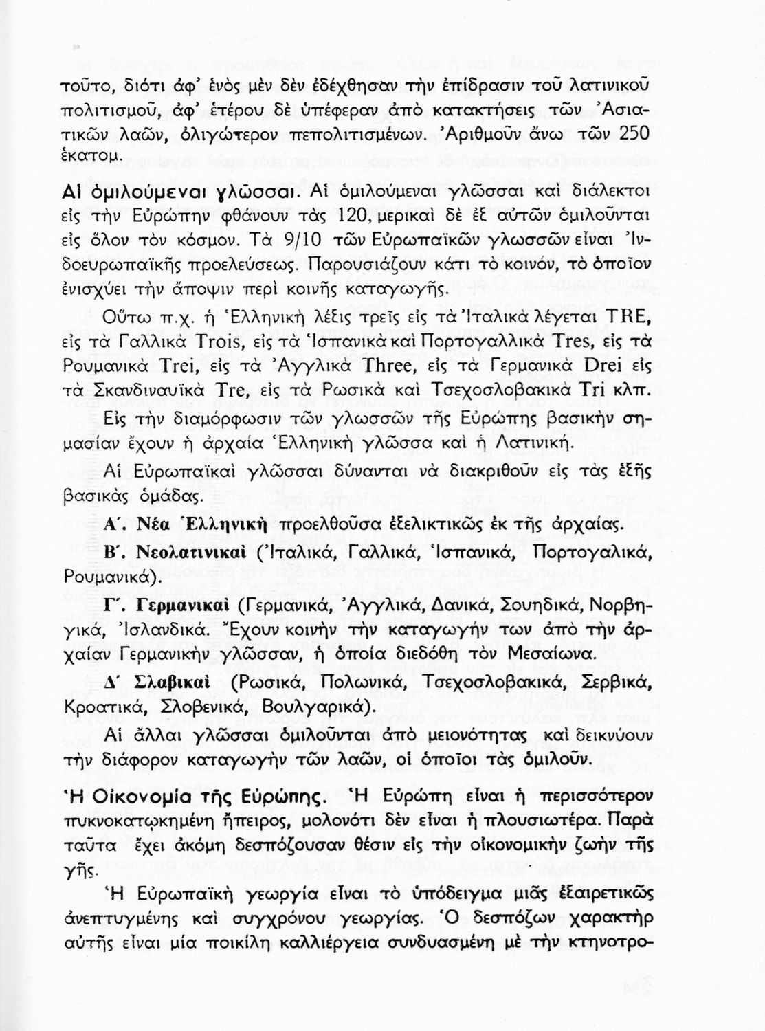 Σχολικό εγχειρίδιο Γεωγραφίας Β' Γυμνασίου που περιλαμβάνει εισαγωγή στη φυσική και μαθηματική γεωγραφία και παρουσιάζει τις χώρες της Ευρώπης από γεωμορφολογική, πολιτική, πολιτισμική και οικονομική άποψη. Περιέχει και αναφορά στις οικονομικές σχέσεις της Ελλάδας με τα ευρωπαϊκά κράτη. Φέρει το σύμβολο της δικτατορίας.