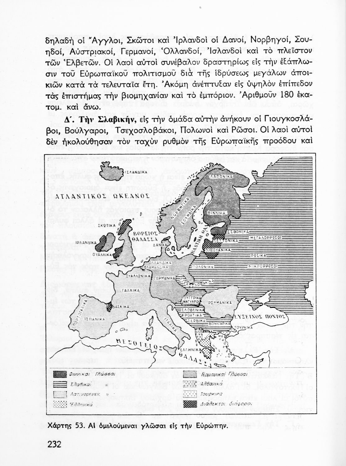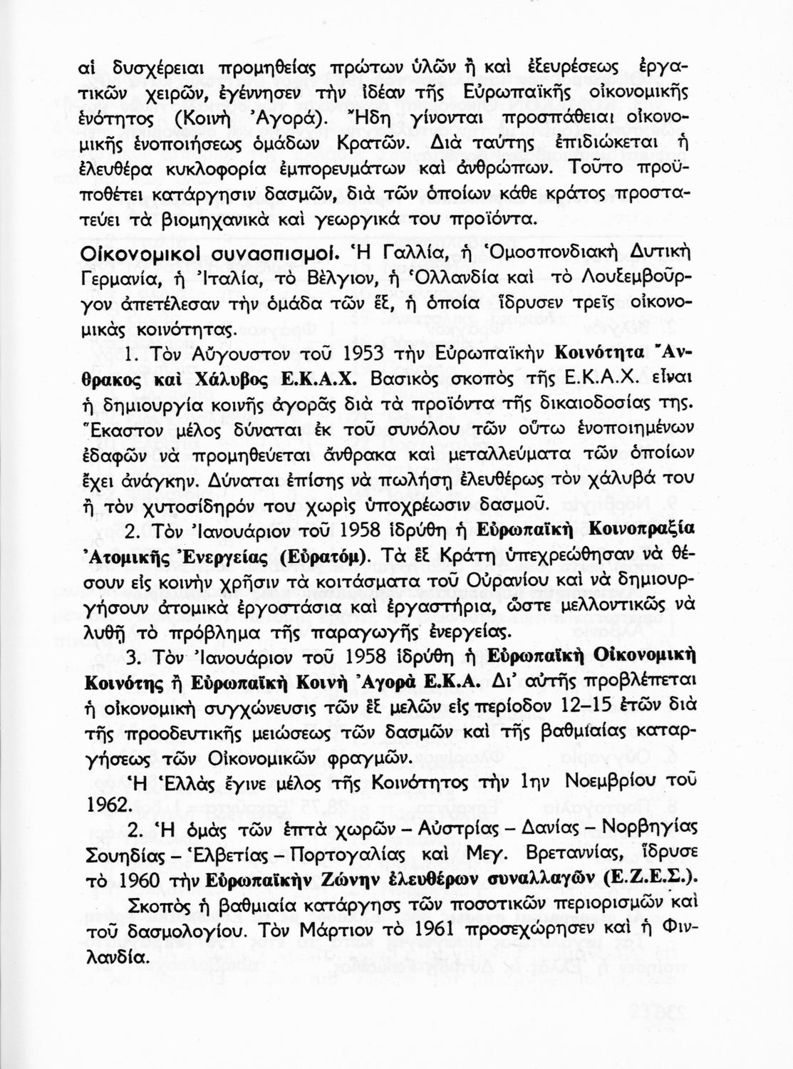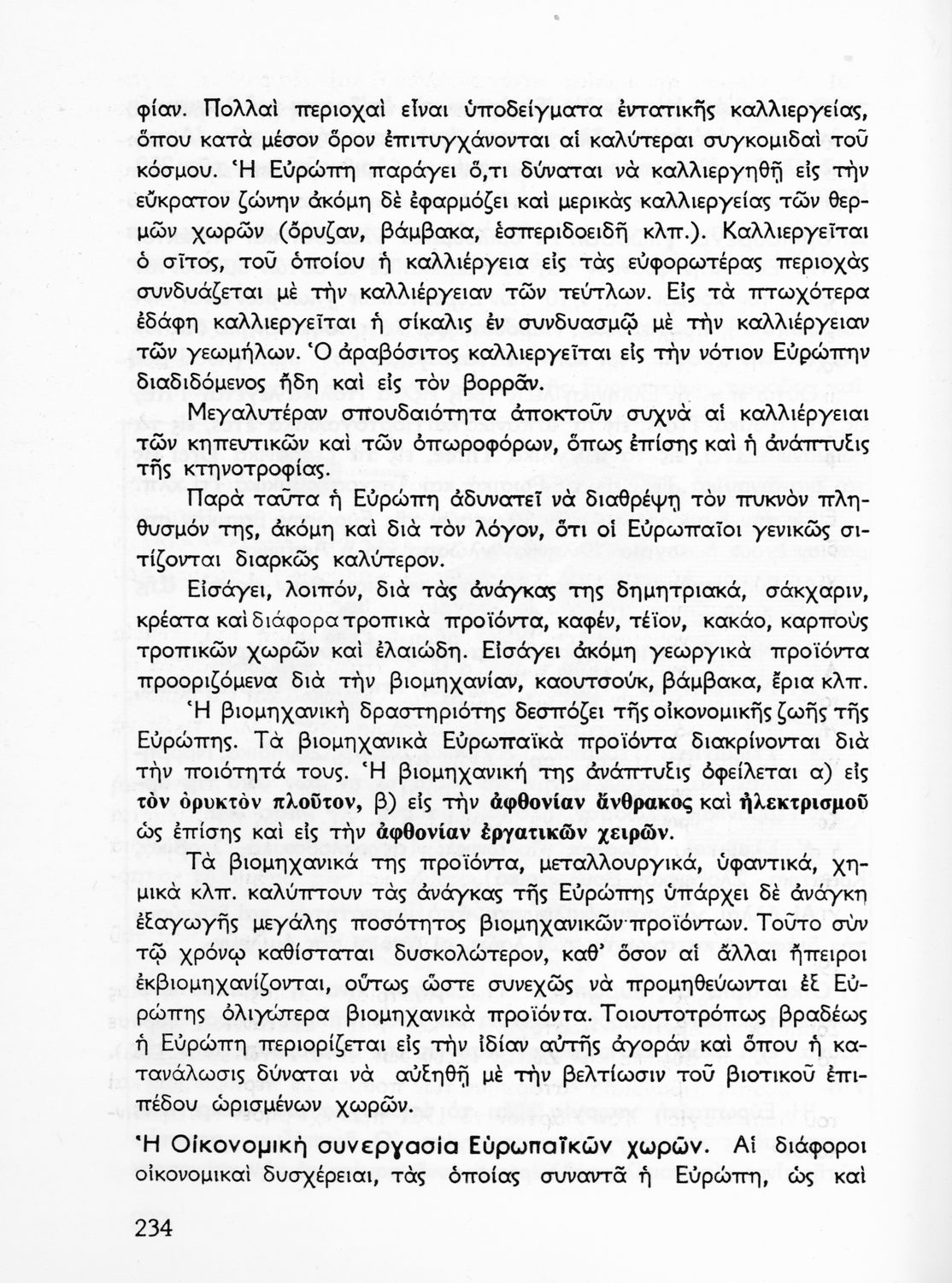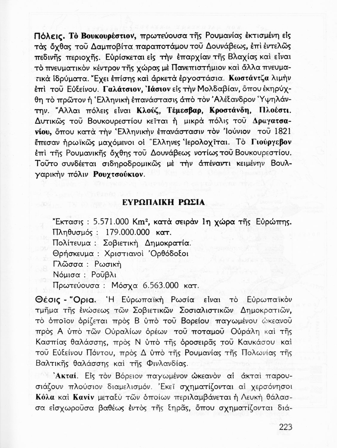 Σχολικό εγχειρίδιο Γεωγραφίας Β' Γυμνασίου που περιλαμβάνει εισαγωγή στη φυσική και μαθηματική γεωγραφία και παρουσιάζει τις χώρες της Ευρώπης από γεωμορφολογική, πολιτική, πολιτισμική και οικονομική άποψη. Περιέχει και αναφορά στις οικονομικές σχέσεις της Ελλάδας με τα ευρωπαϊκά κράτη. Φέρει το σύμβολο της δικτατορίας.