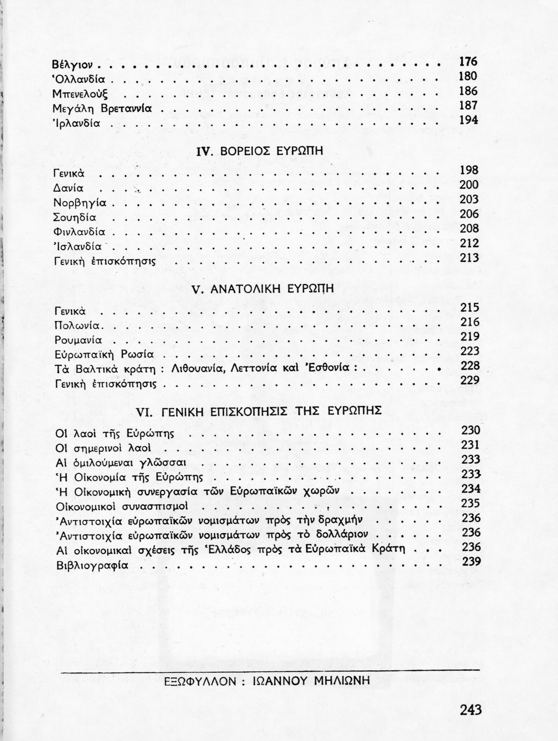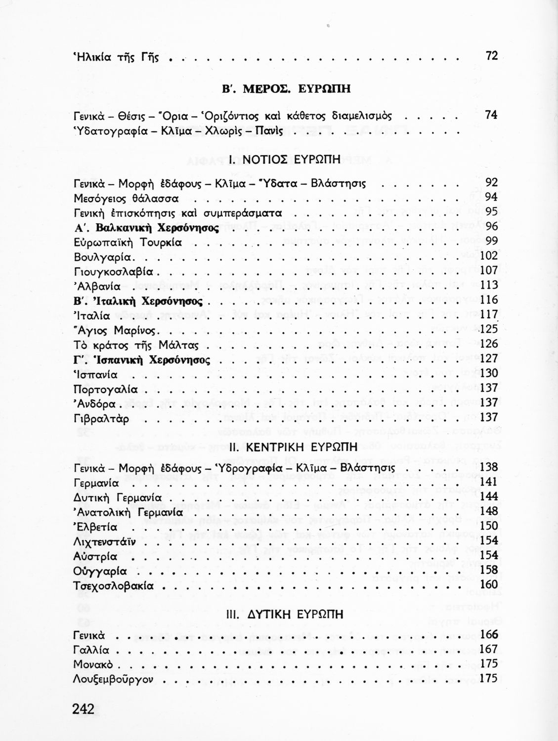 Σχολικό εγχειρίδιο Γεωγραφίας Β' Γυμνασίου που περιλαμβάνει εισαγωγή στη φυσική και μαθηματική γεωγραφία και παρουσιάζει τις χώρες της Ευρώπης από γεωμορφολογική, πολιτική, πολιτισμική και οικονομική άποψη. Περιέχει και αναφορά στις οικονομικές σχέσεις της Ελλάδας με τα ευρωπαϊκά κράτη. Φέρει το σύμβολο της δικτατορίας.
