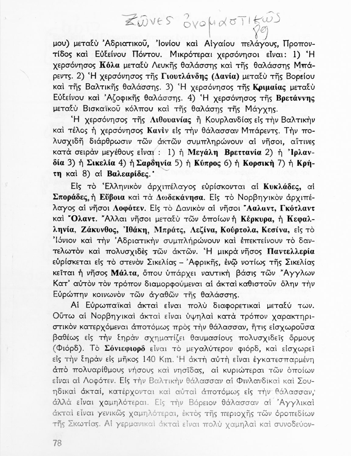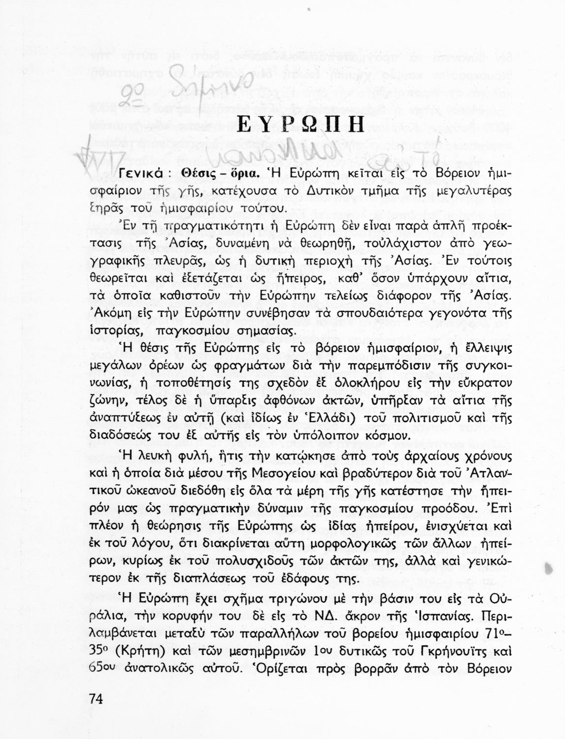 Παρουσίαση περιεχομένου: Σχολικό εγχειρίδιο Γεωγραφίας Β' Γυμνασίου που περιλαμβάνει εισαγωγή στη φυσική και μαθηματική γεωγραφία και παρουσιάζει τις χώρες της Ευρώπης από γεωμορφολογική, πολιτική, πολιτισμική και οικονομική άποψη. Περιέχει και αναφορά στις οικονομικές σχέσεις της Ελλάδας με τα ευρωπαϊκά κράτη. Φέρει το σύμβολο της δικτατορίας.