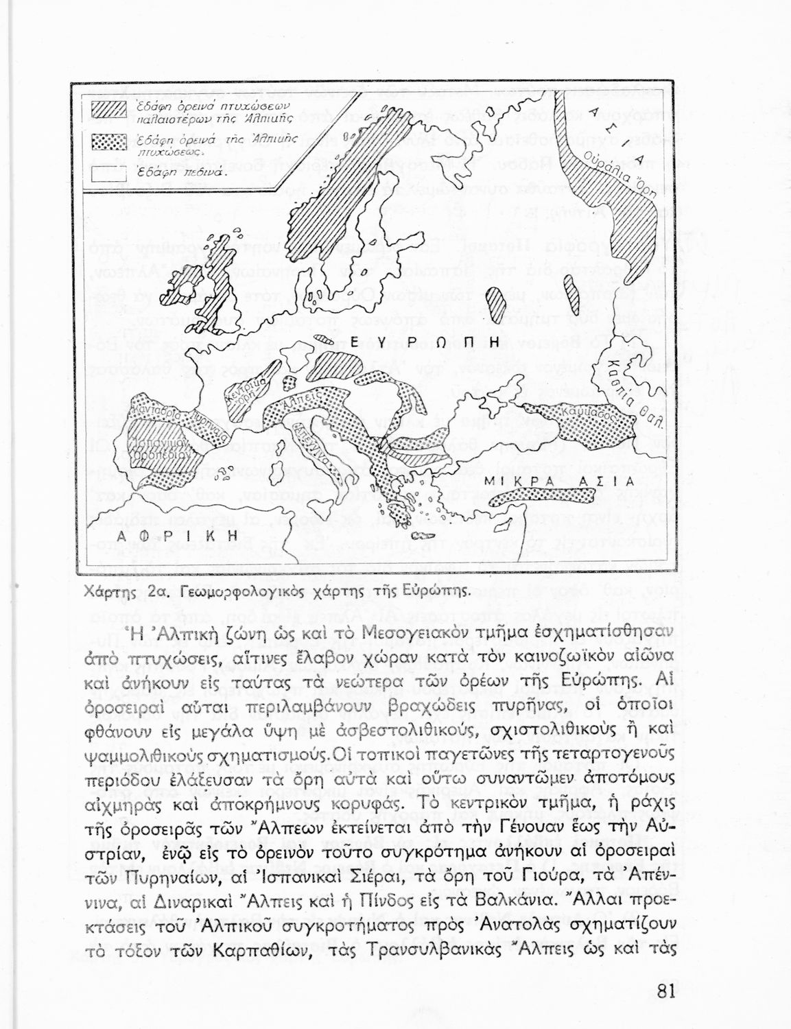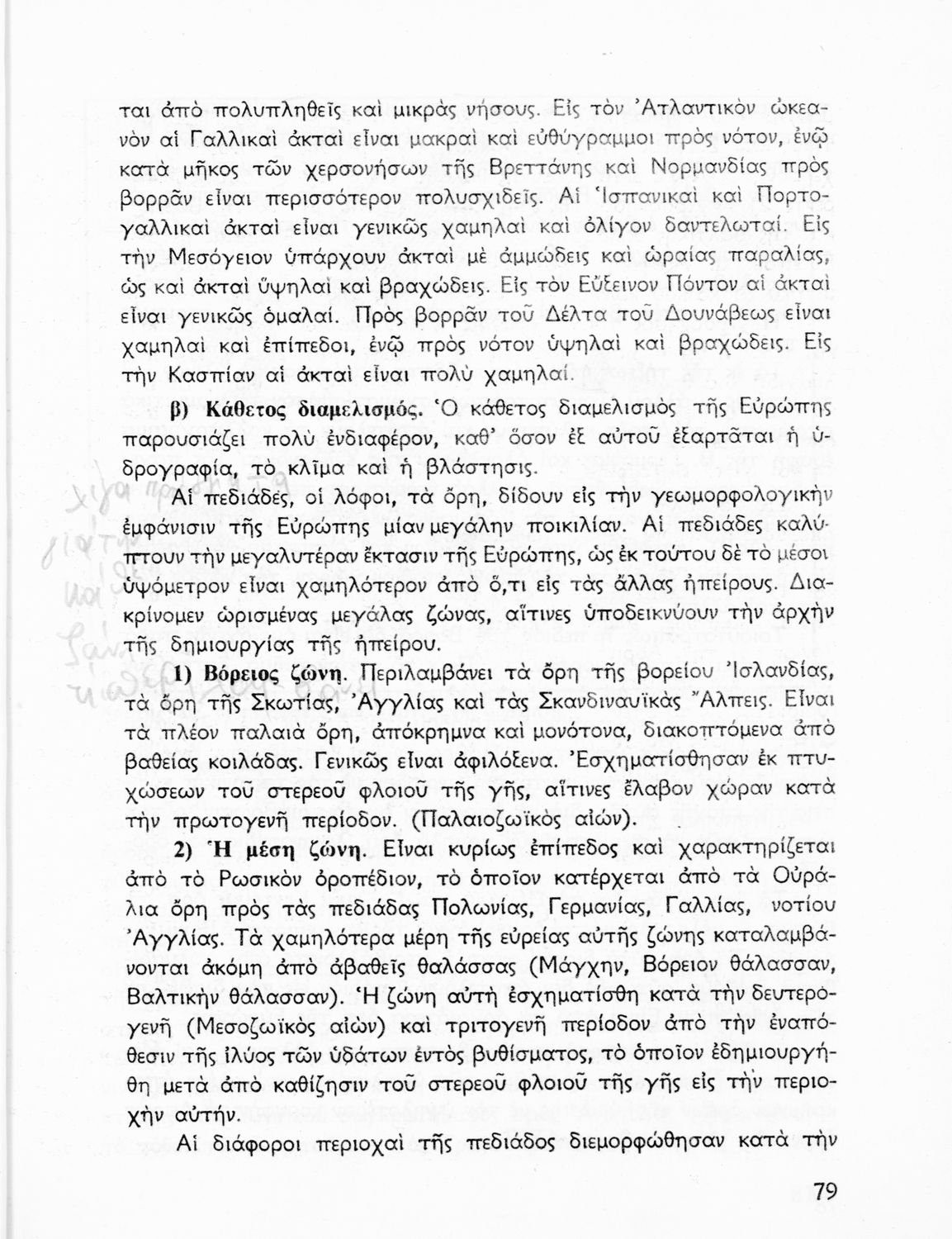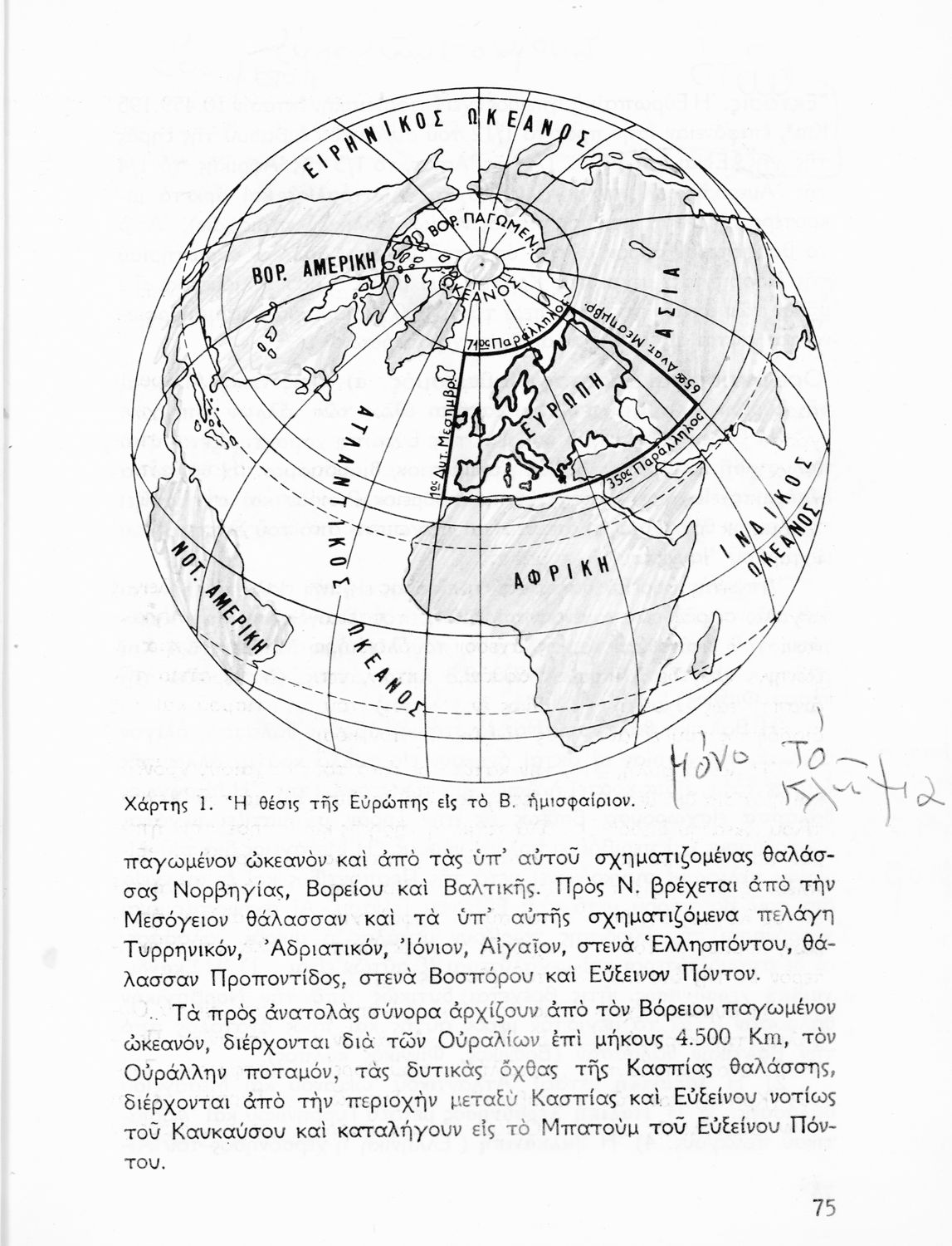 Σχολικό εγχειρίδιο Γεωγραφίας Β' Γυμνασίου που περιλαμβάνει εισαγωγή στη φυσική και μαθηματική γεωγραφία και παρουσιάζει τις χώρες της Ευρώπης από γεωμορφολογική, πολιτική, πολιτισμική και οικονομική άποψη. Περιέχει και αναφορά στις οικονομικές σχέσεις της Ελλάδας με τα ευρωπαϊκά κράτη. Φέρει το σύμβολο της δικτατορίας.