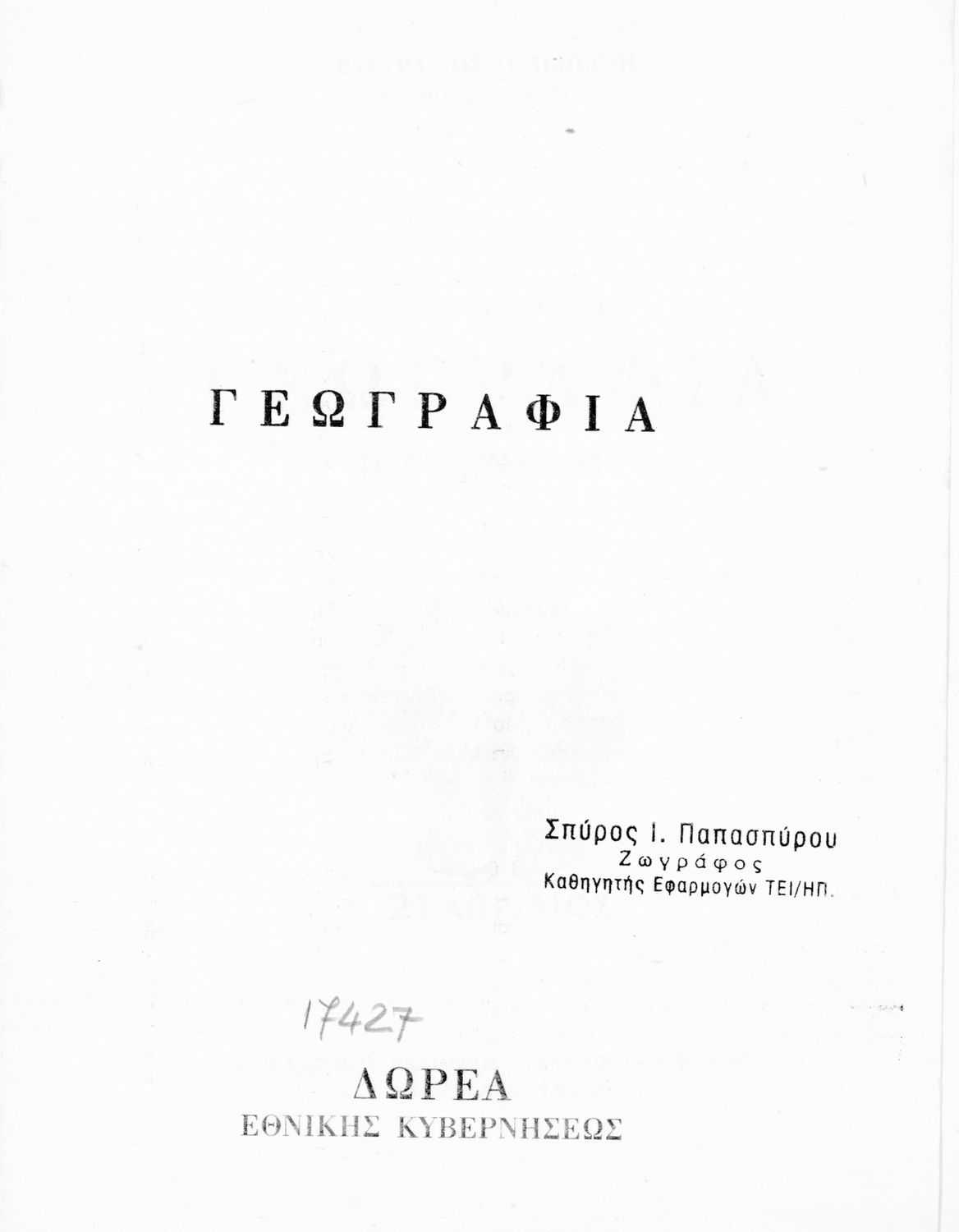 Κωδικός αναγνώρισης: 01-17427 Τίτλος: Γεωγραφία Β΄ Γυμνασίου Συγγραφέας: Ευστράτιος Π. Παπάνης Μέγεθος και υπόστρωμα: Σχολικό εγχειρίδιο, 20εκ., μαλακό εξώφυλλο, 243 σελίδες. Φωτογραφίες (ασπρόμαυρες), χάρτες. |