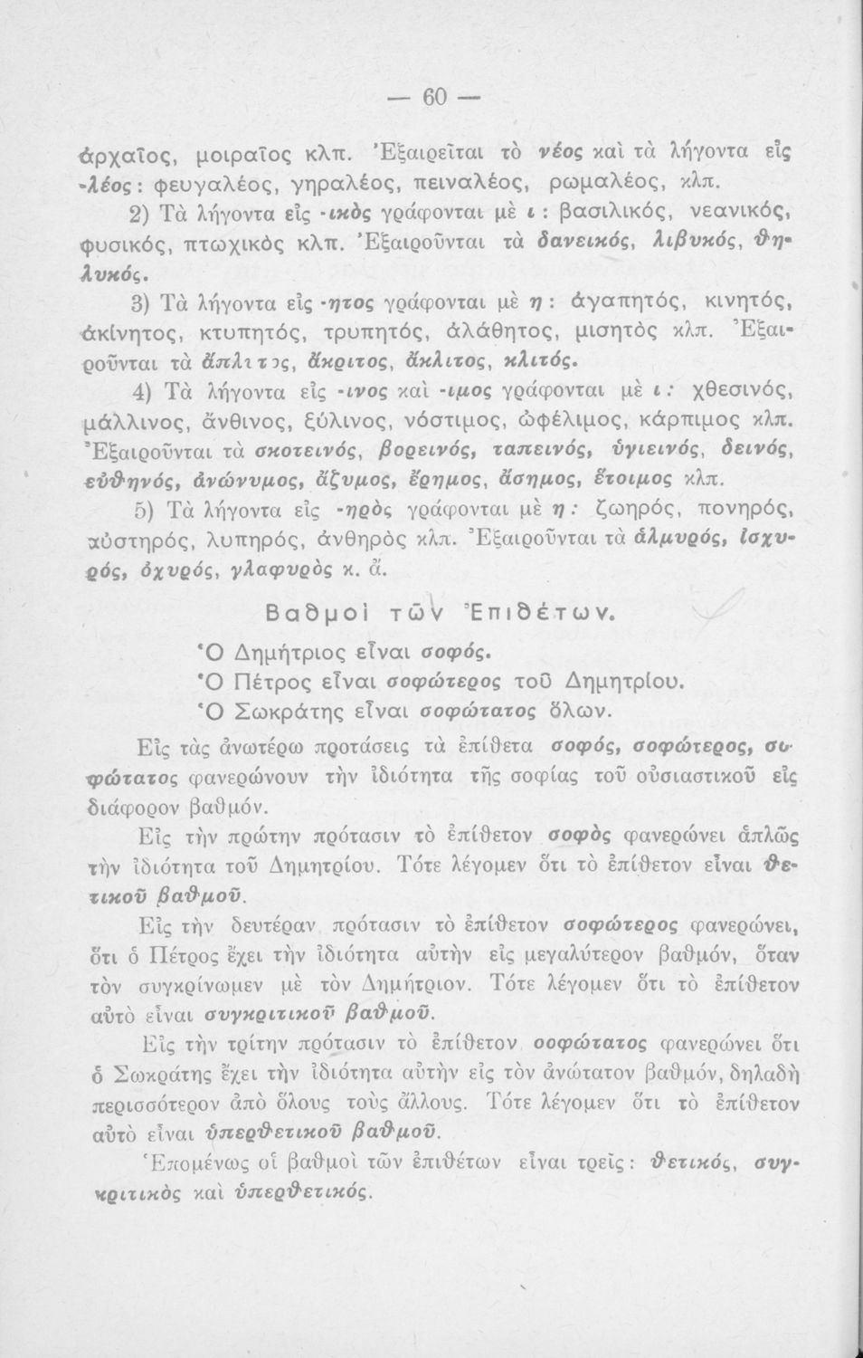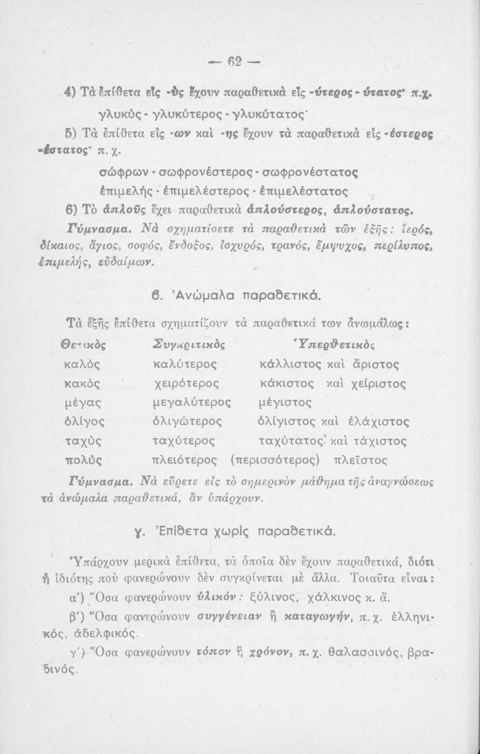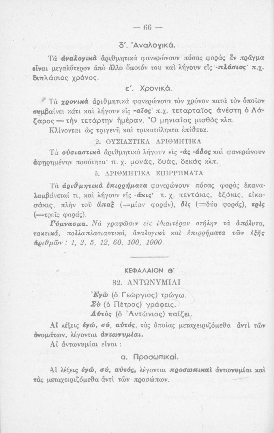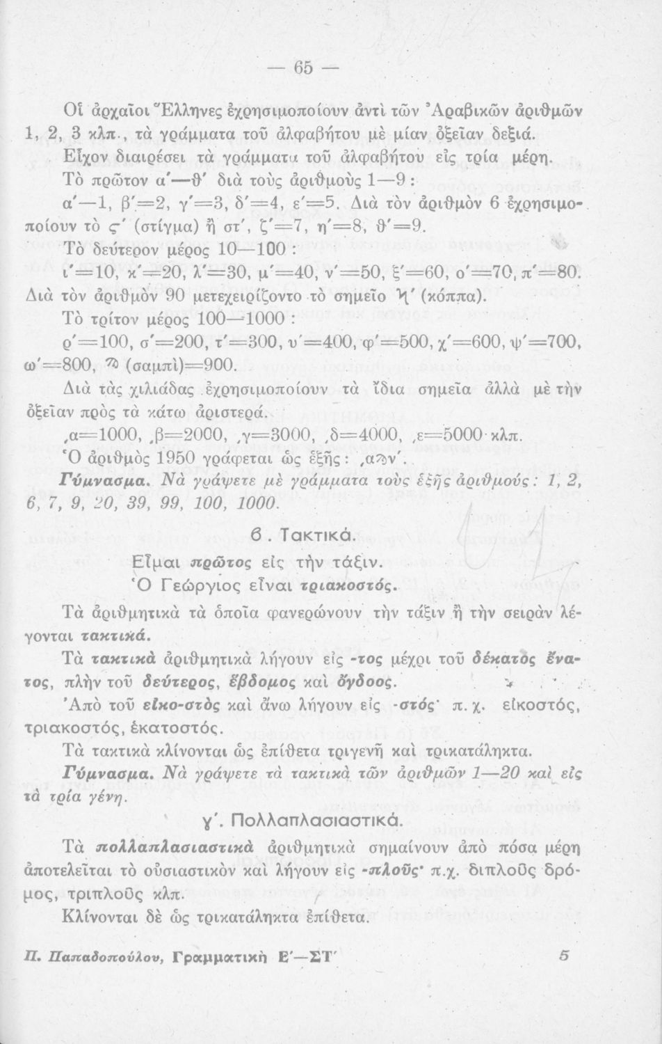 Σχολικό εγχειρίδιο γραμματικής για τους μαθητές της Ε΄ και ΣΤ΄ τάξης του Δημοτικού. Περιέχει τη διδασκαλία της γραμματικής της καθαρεύουσας με κανόνες και παραδείγματα.