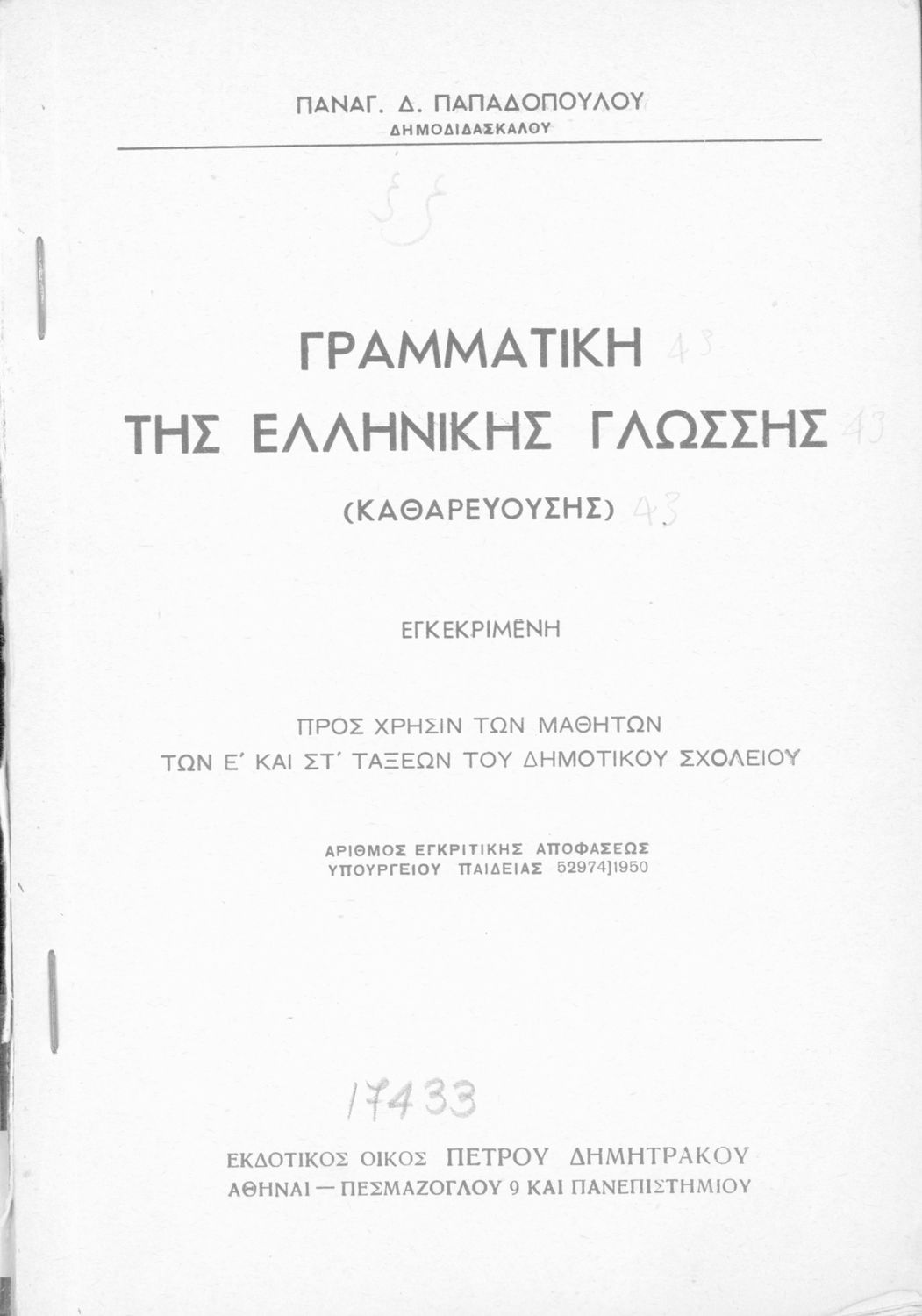 Εκδότης: Εκδοτικός οίκος Π. Δημητράκου Τόπος έκδοσης: Αθήνα Υπουργική απόφαση / Σύμβαση: 52974/1950 Έτος έγκρισης: 1950 |