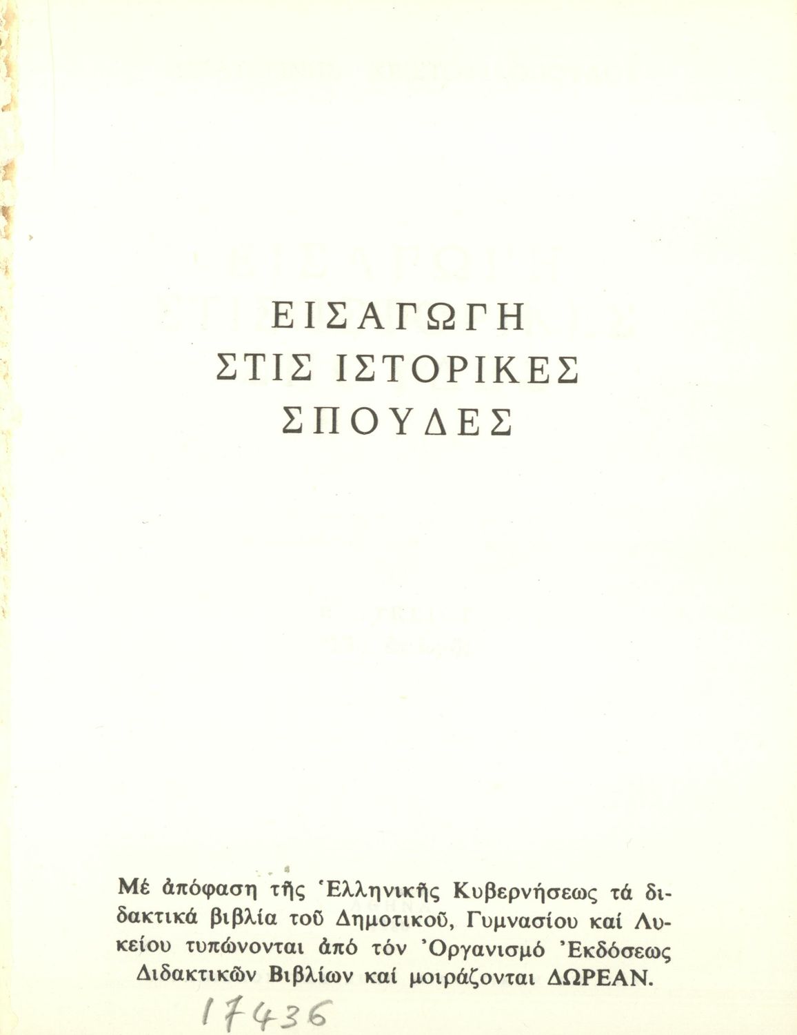 Κωδικός αναγνώρισης: 01-17436 Τίτλος: Εισαγωγή στις Ιστορικές σπουδές Β΄ Λυκείου ύλη επιλογής Συγγραφέας: Αικ. Χριστοφιλοπούλου Μέγεθος και υπόστρωμα: Σχολικό εγχειρίδιο, μαλακό εξώφυλλο, 128 σελίδες. Σκίτσα, εικόνες χάρτης (έγχρωμα). |