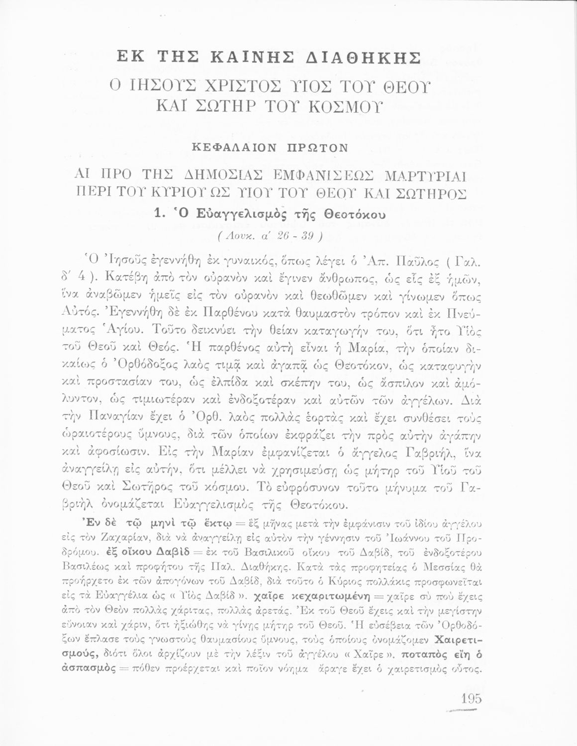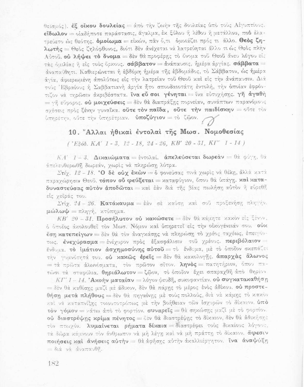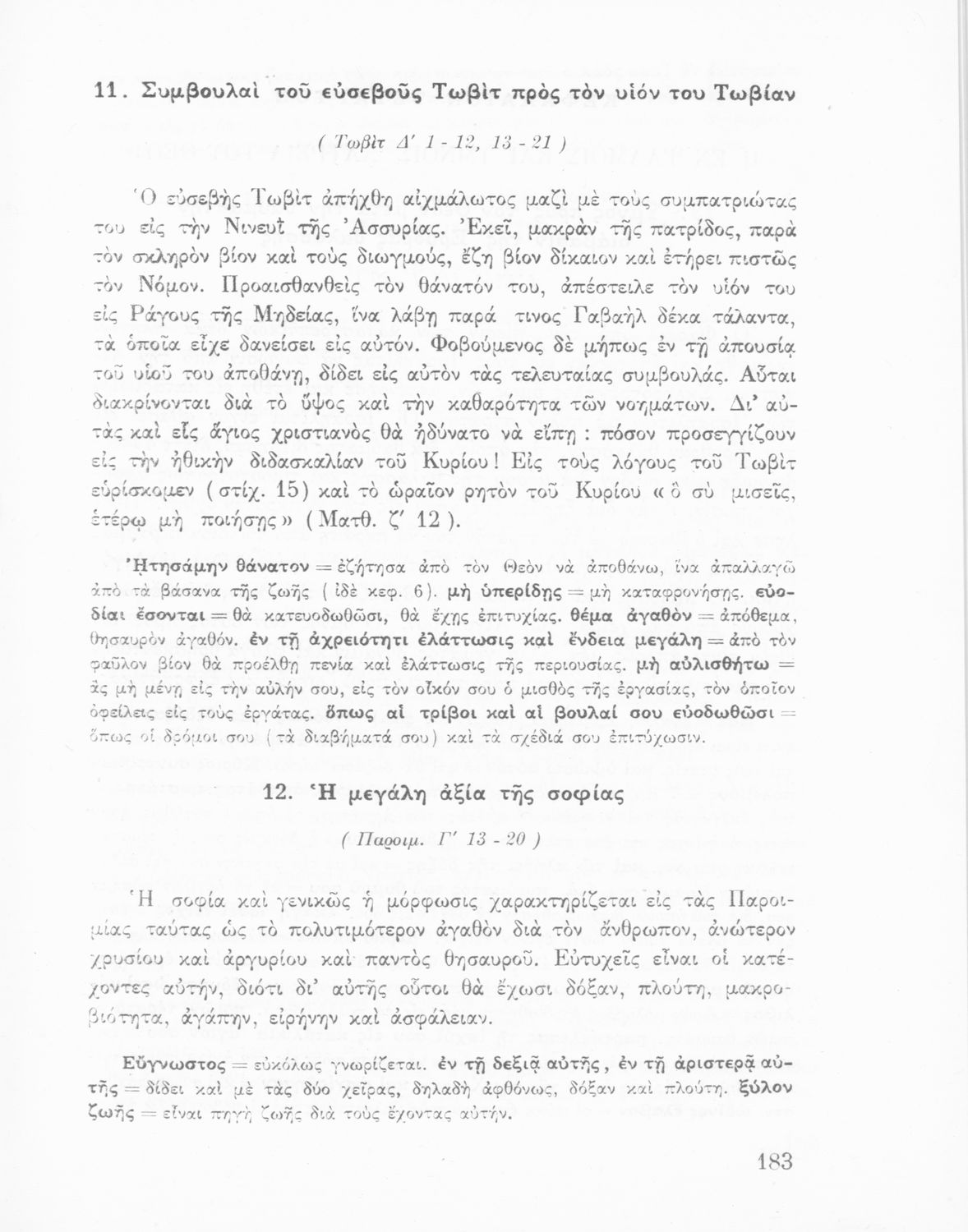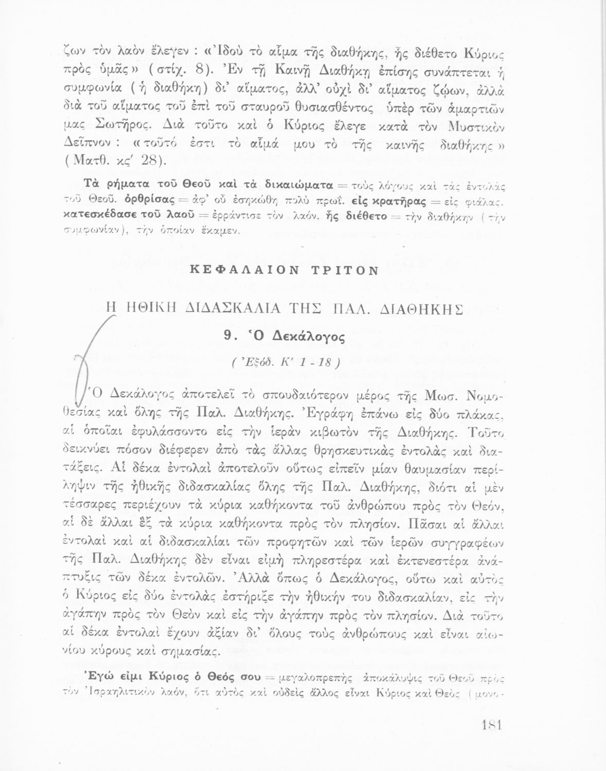 Σχολικό εγχειρίδιο Θρησκευτικών που περιλαμβάνει εισαγωγικά σχόλια στα βιβλία της Παλαιάς και Καινής Διαθήκης, περικοπές, ερμηνευτικές και πραγματολογικές σημειώσεις και πίνακα με τα κυριότερα ονόματα.