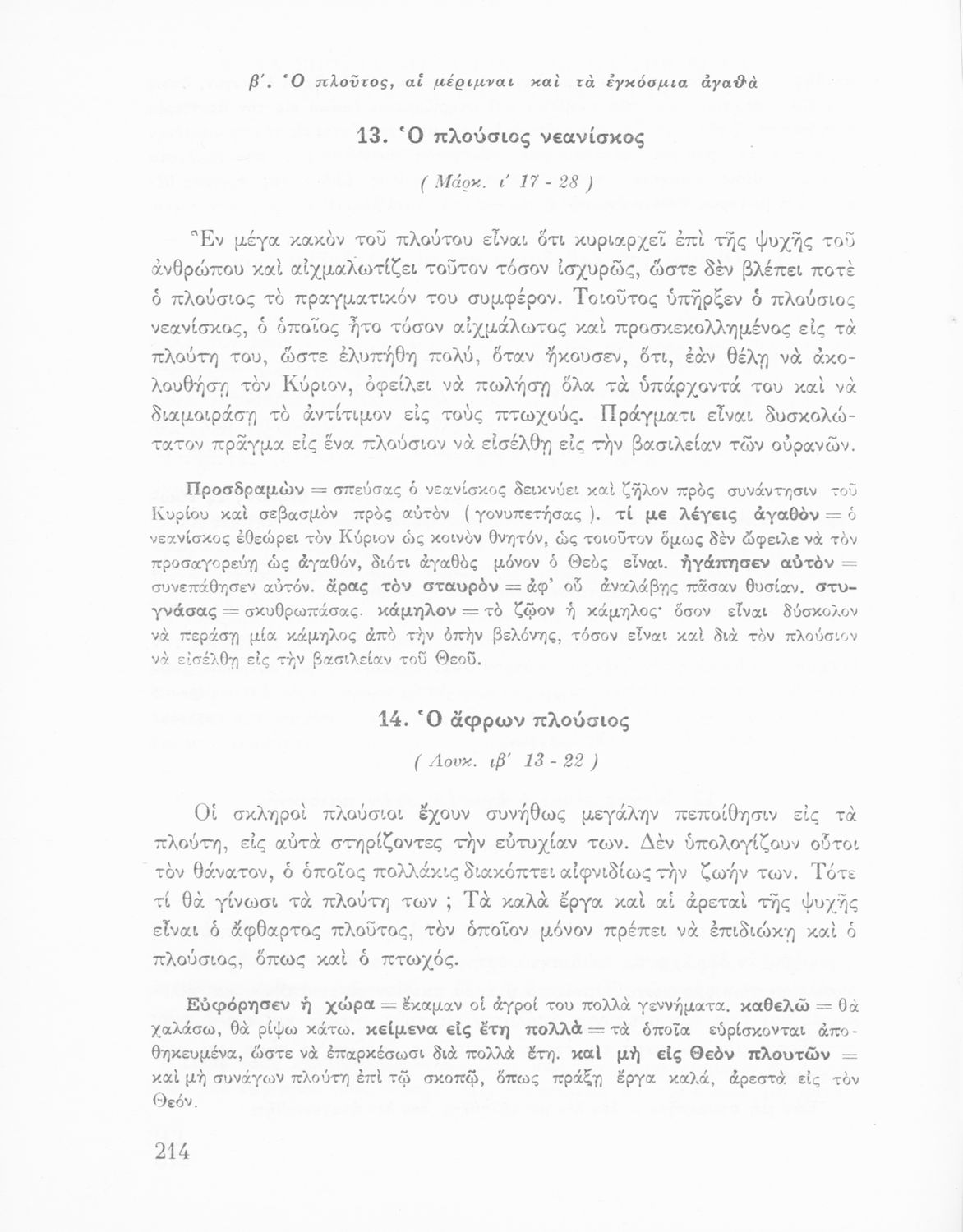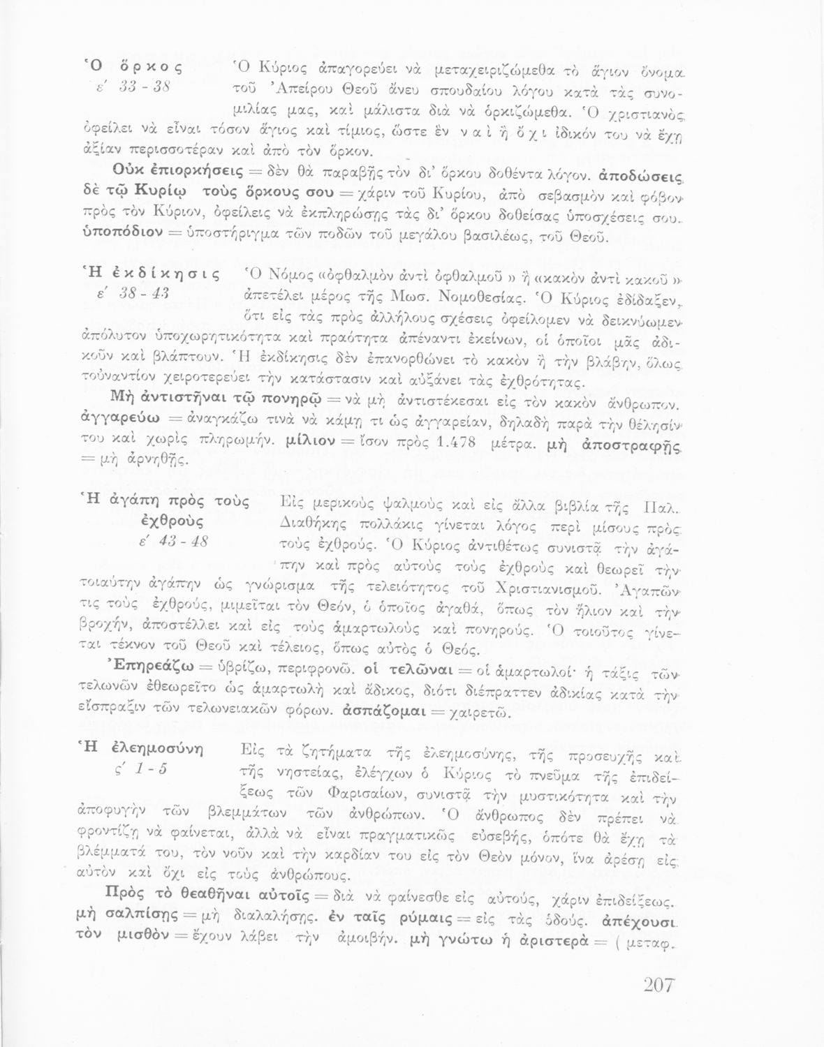 Σχολικό εγχειρίδιο Θρησκευτικών που περιλαμβάνει εισαγωγικά σχόλια στα βιβλία της Παλαιάς και Καινής Διαθήκης, περικοπές, ερμηνευτικές και πραγματολογικές σημειώσεις και πίνακα με τα κυριότερα ονόματα.