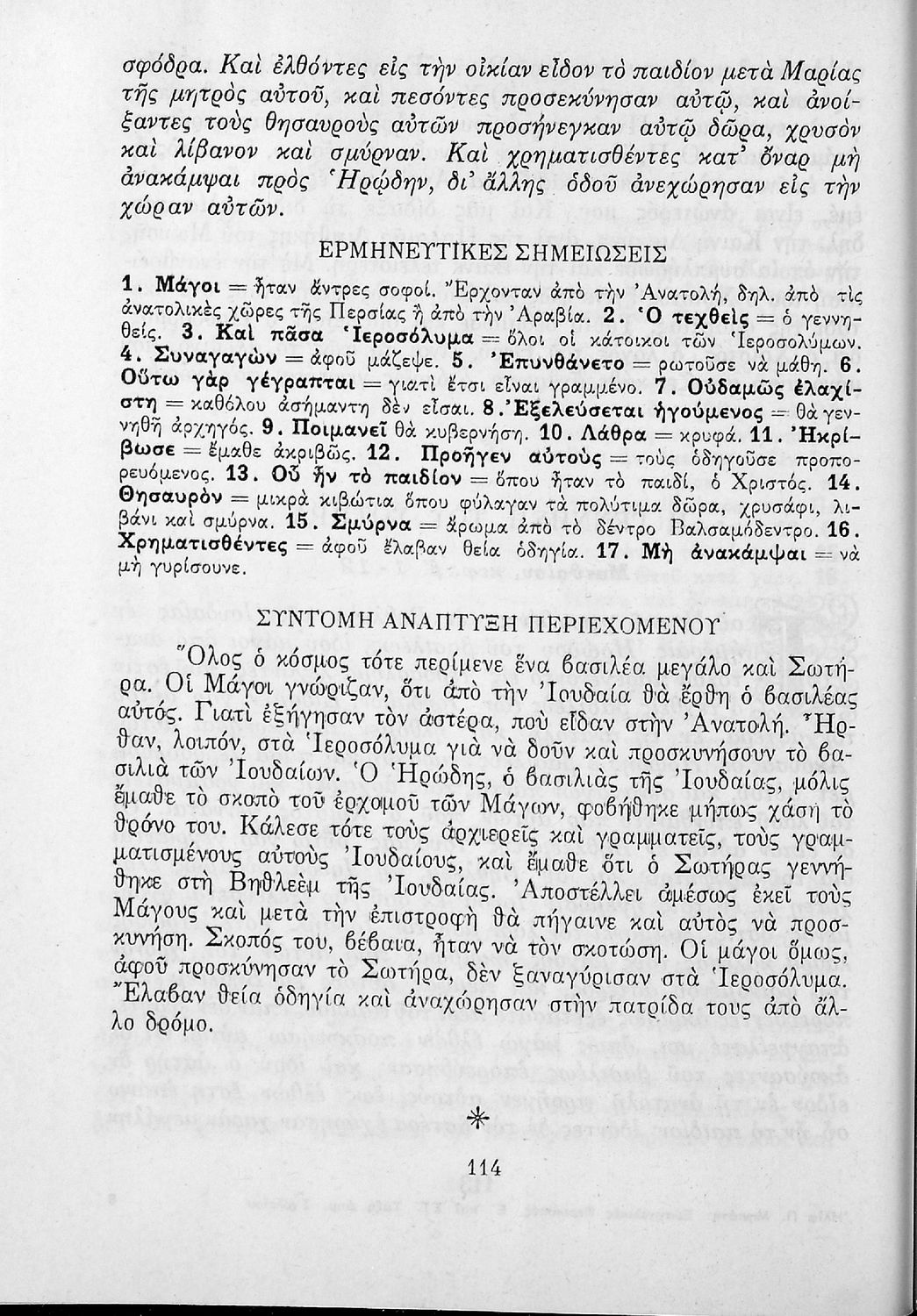 Βαθμίδα εκπαίδευσης: Πρωτοβάθμια Τάξη: Ε' Δημοτικού / ΣΤ' Δημοτικού Μάθημα: Θρησκευτικά Γλώσσα: Δημοτική Παρουσίαση περιεχομένου: Μαθητικό βοήθημα Θρησκευτικών για τις Ε΄ και ΣΤ΄ Δημοτικού που περιλαμβάνει εισαγωγικά σχόλια στα βιβλία της Παλαιάς και Καινής Διαθήκης, βιογραφικά σημειώματα των ευαγγελιστών περικοπές, και ερμηνευτικές και πραγματολογικές σημειώσεις. |