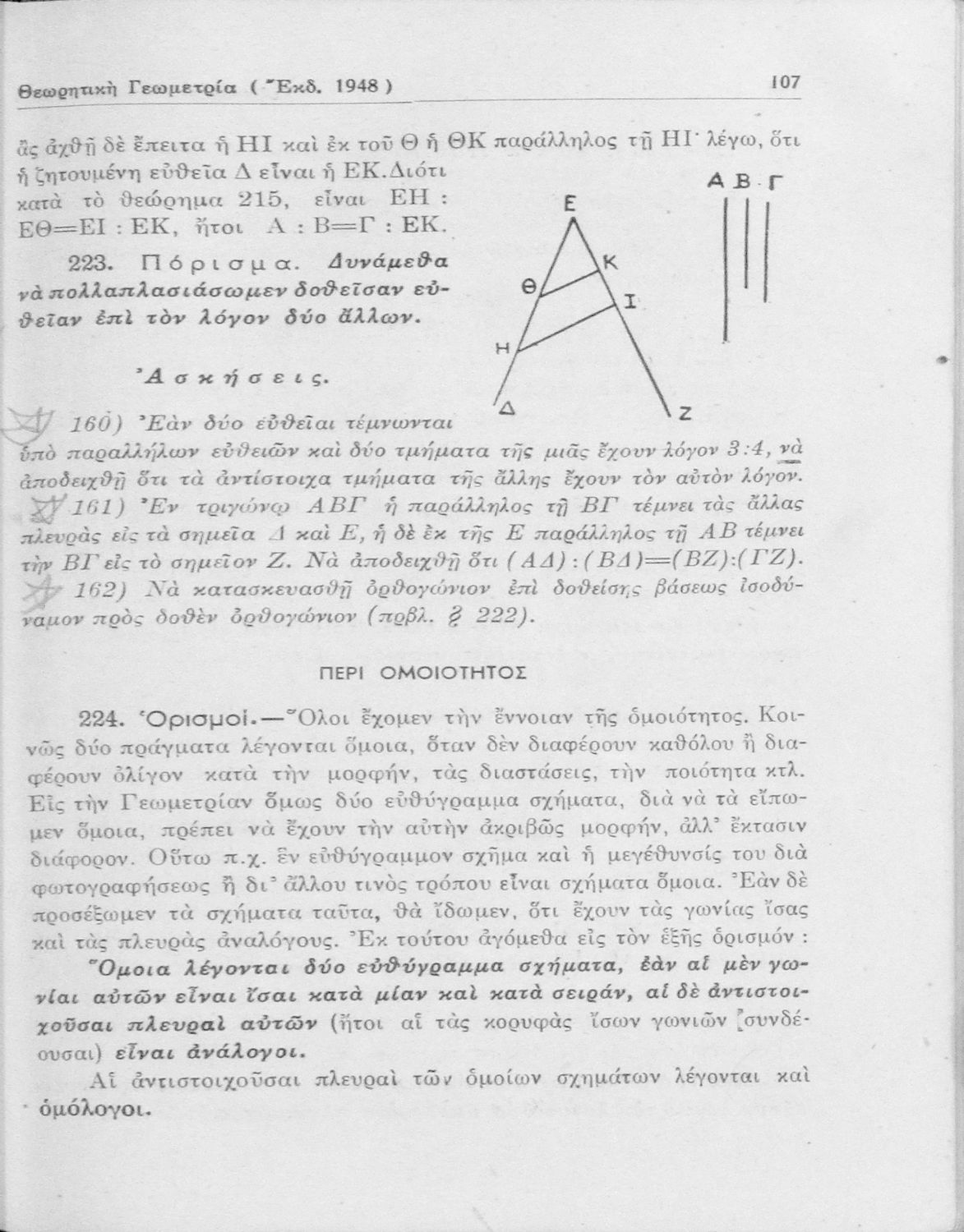 Σχολικό εγχειρίδιο Γεωμετρίας Γυμνασίου που είναι χωρισμένο σε θεωρήματα και ασκήσεις και εστιάζει στα βασικά θεωρήματα και ιδιότητες των γεωμετρικών σχημάτων. .