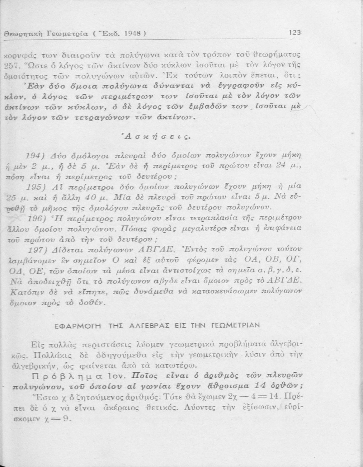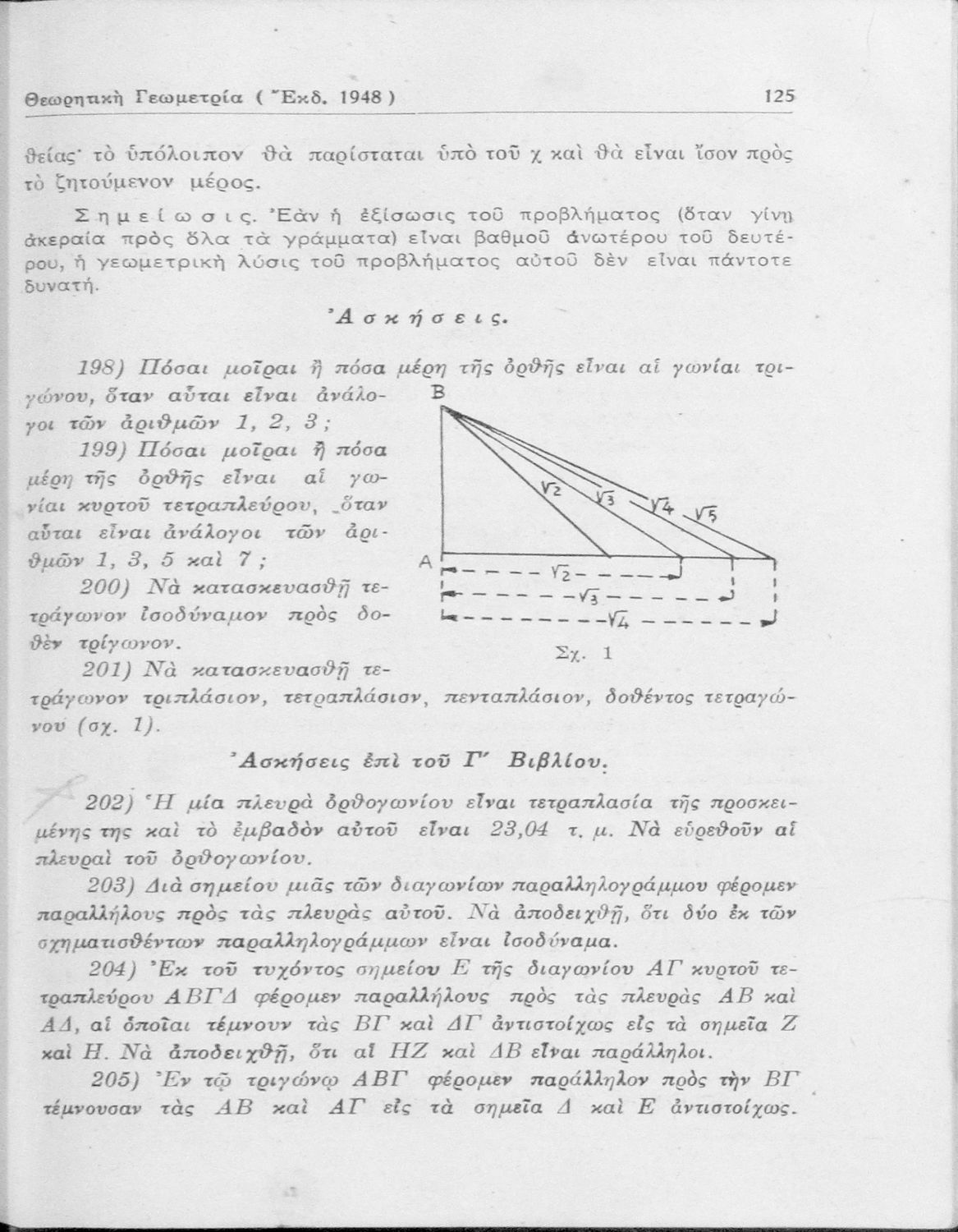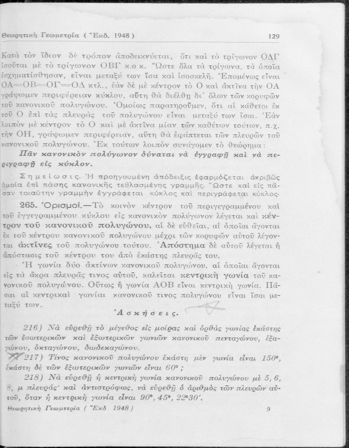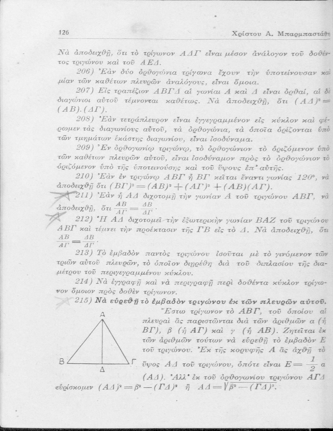 Βαθμίδα εκπαίδευσης: Δευτεροβάθμια Τάξη: Γυμνάσιο Μάθημα: Μαθηματικά Γλώσσα: Απλή καθαρεύουσα Παρουσίαση περιεχομένου: Σχολικό εγχειρίδιο Γεωμετρίας για τα Γυμνάσια νέου τύπου που είναι χωρισμένο σε Επιπεδομετρία και Στερεομετρία και περιλαμβάνει θεωρία και ασκήσεις. |