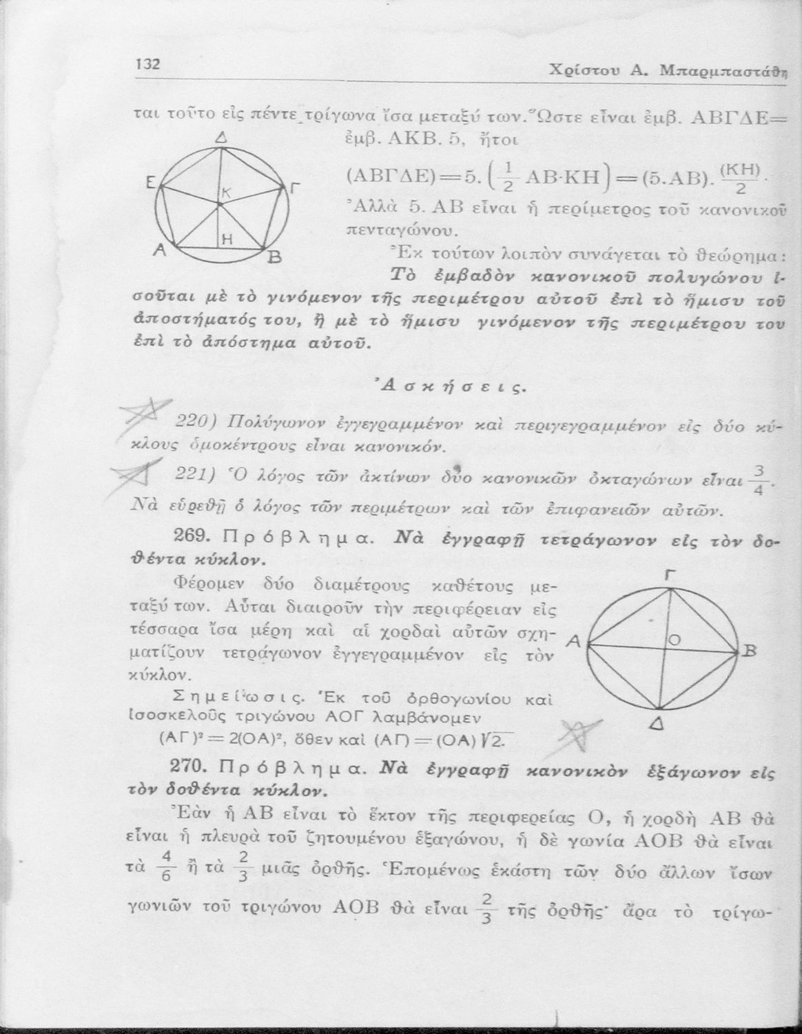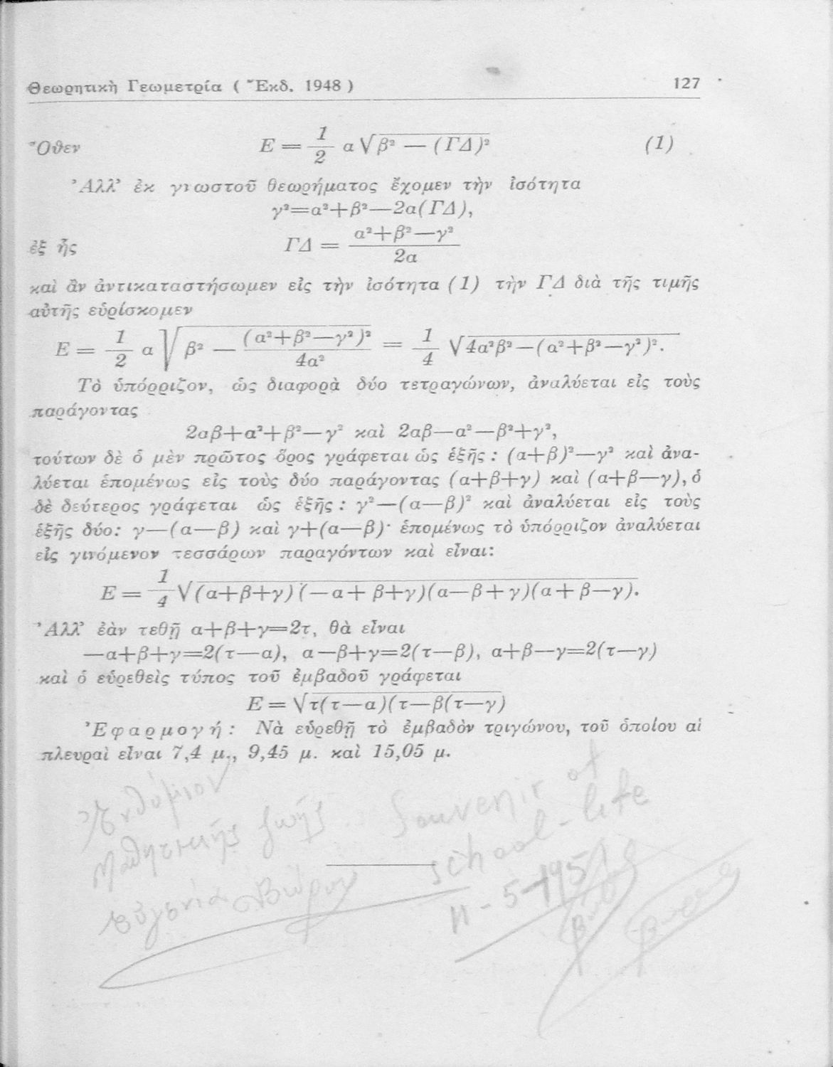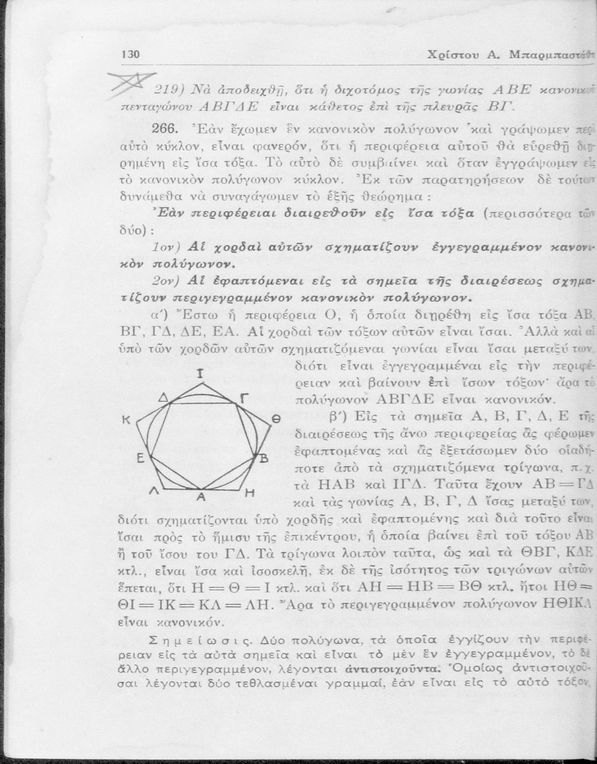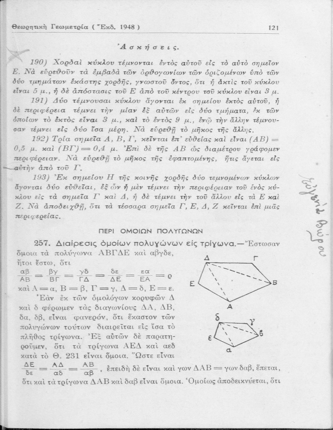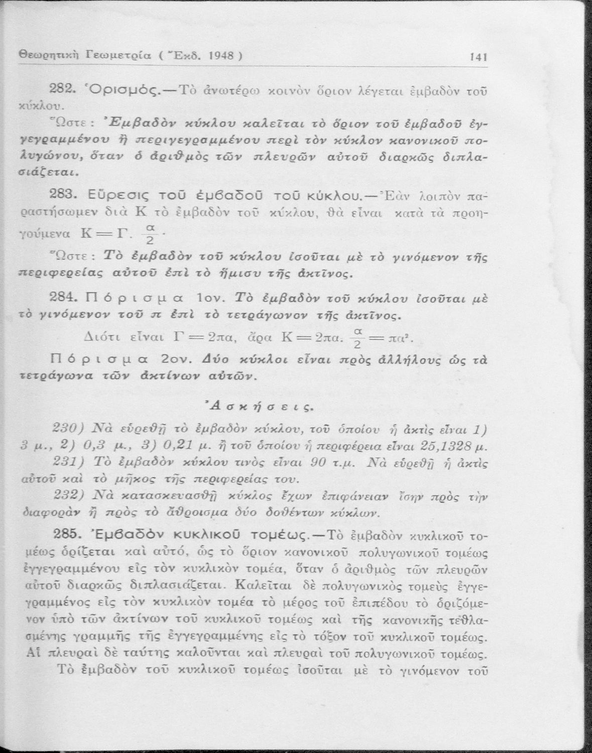 Βαθμίδα εκπαίδευσης: Δευτεροβάθμια Τάξη: Γυμνάσιο Μάθημα: Μαθηματικά Γλώσσα: Απλή καθαρεύουσα Παρουσίαση περιεχομένου: Σχολικό εγχειρίδιο Γεωμετρίας για τα Γυμνάσια νέου τύπου που είναι χωρισμένο σε Επιπεδομετρία και Στερεομετρία και περιλαμβάνει θεωρία και ασκήσεις. |