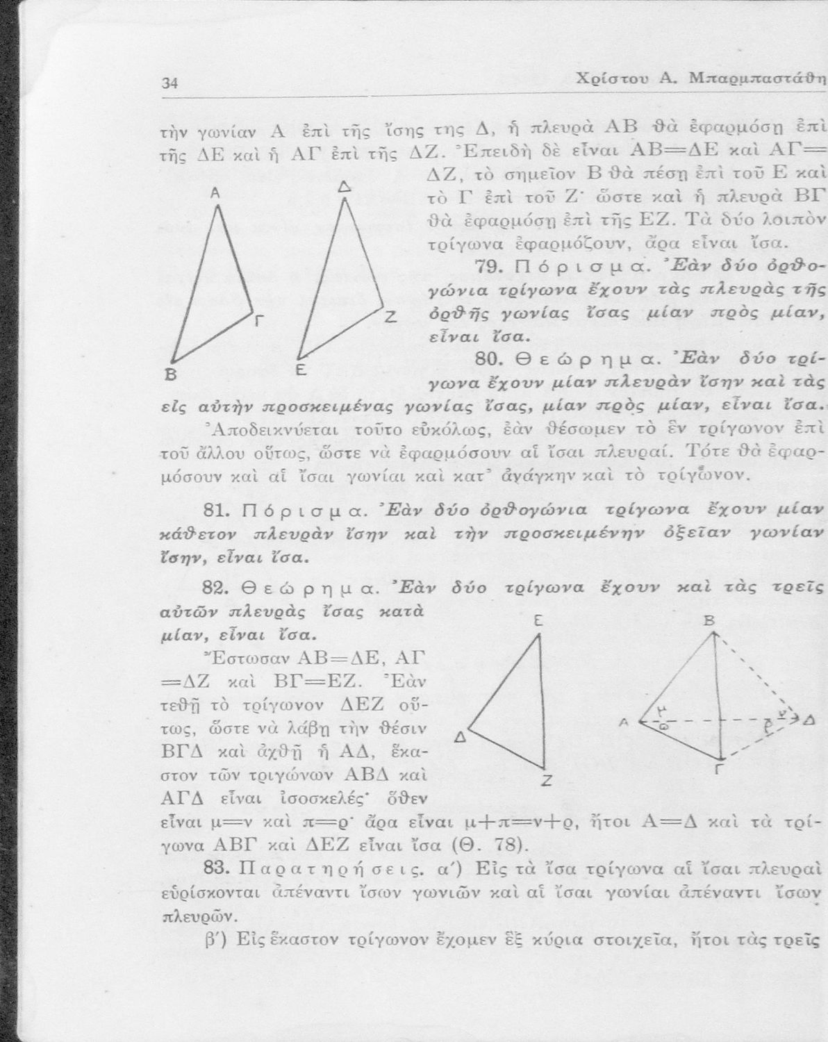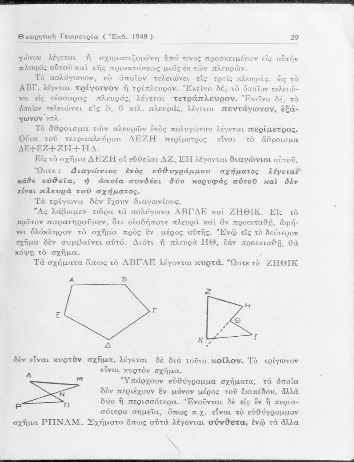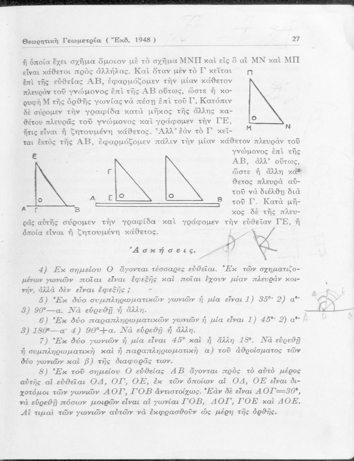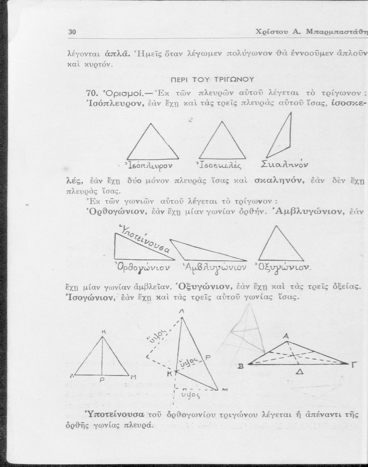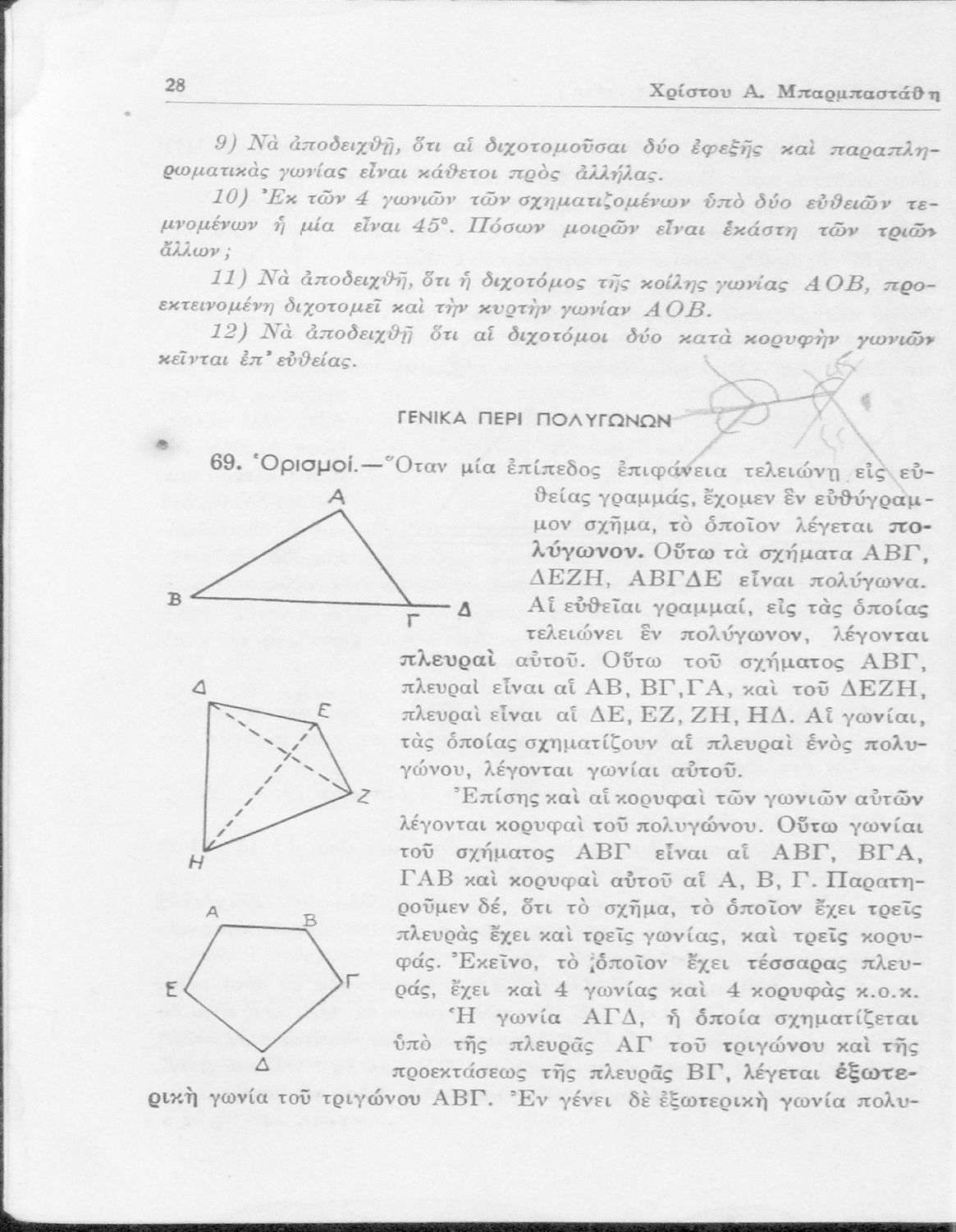 Βαθμίδα εκπαίδευσης: Δευτεροβάθμια Τάξη: Γυμνάσιο Μάθημα: Μαθηματικά Γλώσσα: Απλή καθαρεύουσα Παρουσίαση περιεχομένου: Σχολικό εγχειρίδιο Γεωμετρίας για τα Γυμνάσια νέου τύπου που είναι χωρισμένο σε Επιπεδομετρία και Στερεομετρία και περιλαμβάνει θεωρία και ασκήσεις. |