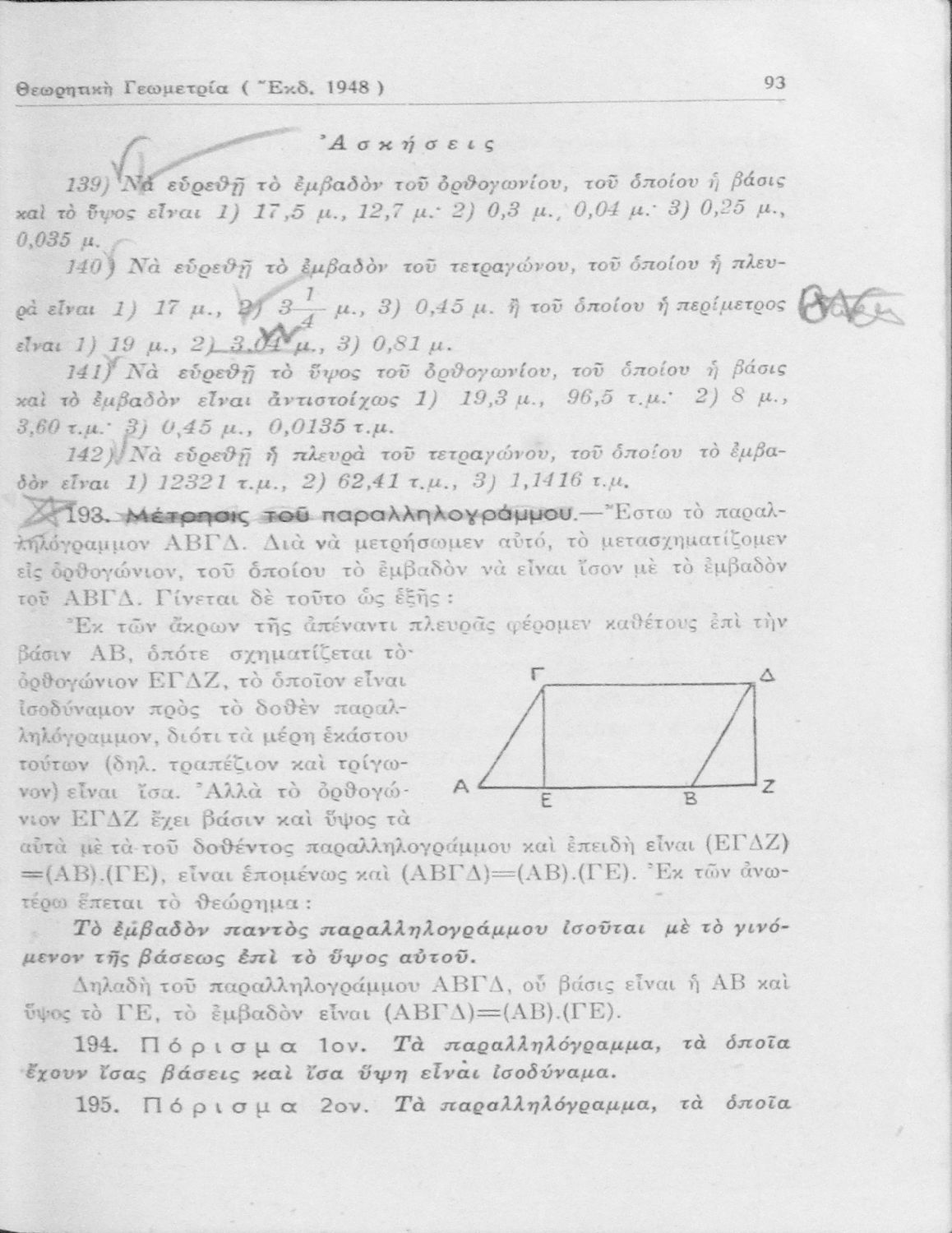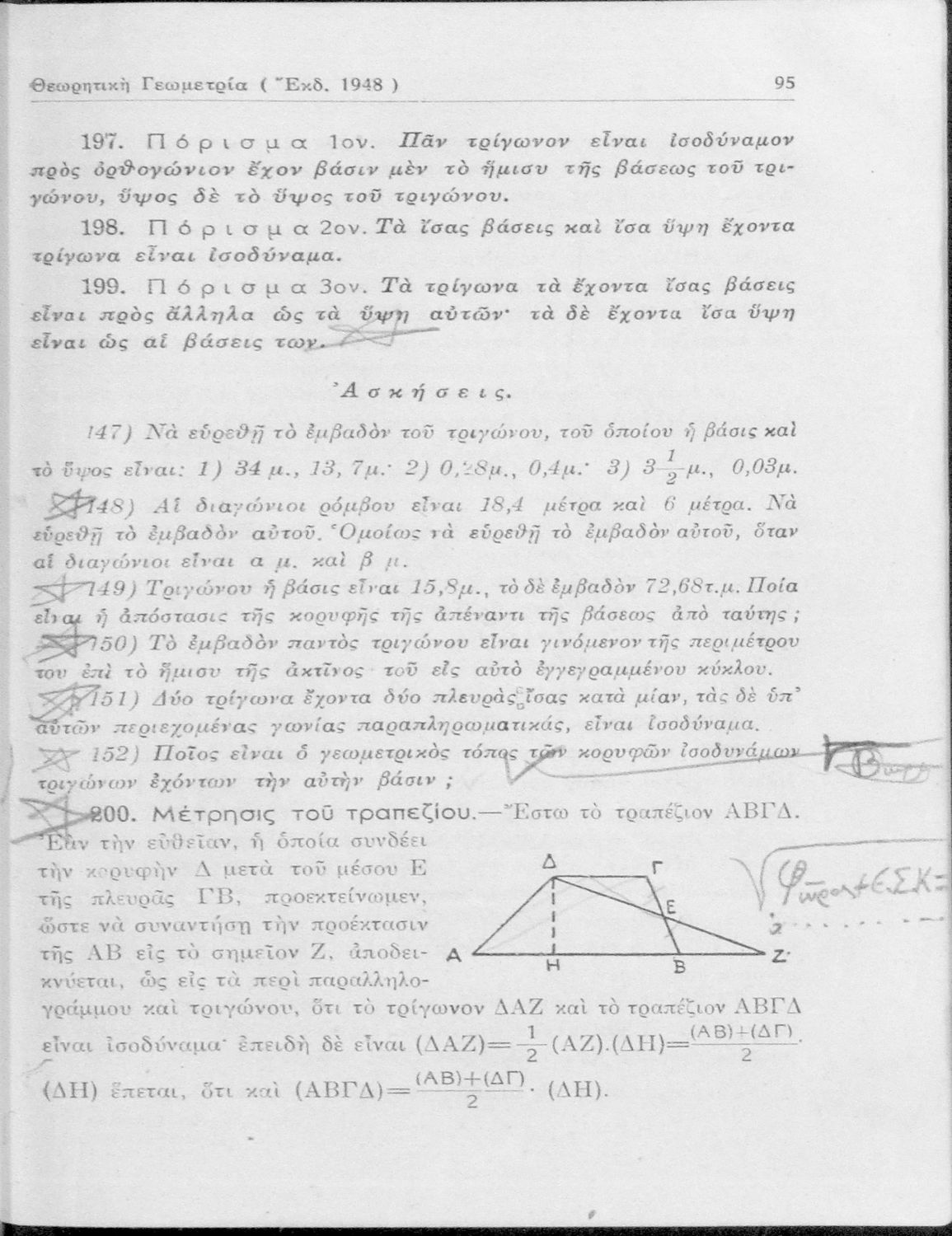 Σχολικό εγχειρίδιο Γεωμετρίας Γυμνασίου που είναι χωρισμένο σε θεωρήματα και ασκήσεις και εστιάζει στα βασικά θεωρήματα και ιδιότητες των γεωμετρικών σχημάτων. .