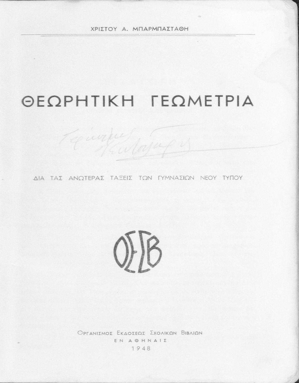 Τίτλος: Θεωρητική γεωμετρία δια τας ανωτέρας τάξεις των Γυμνασίων νέου τύπου