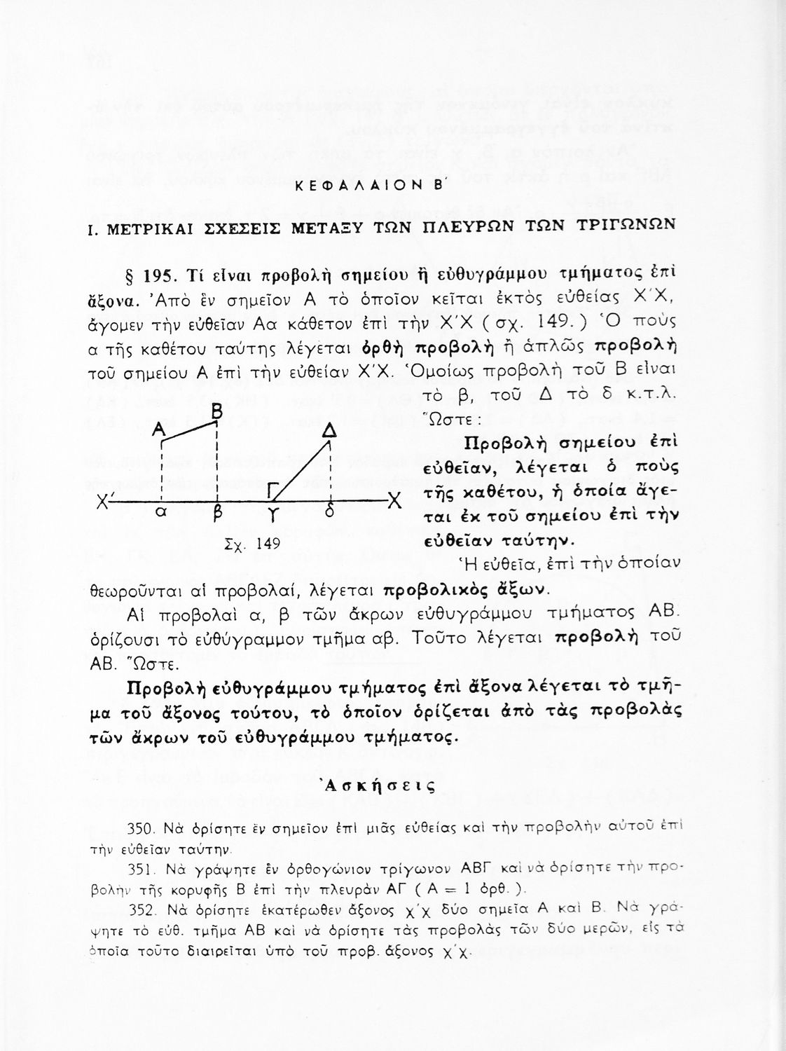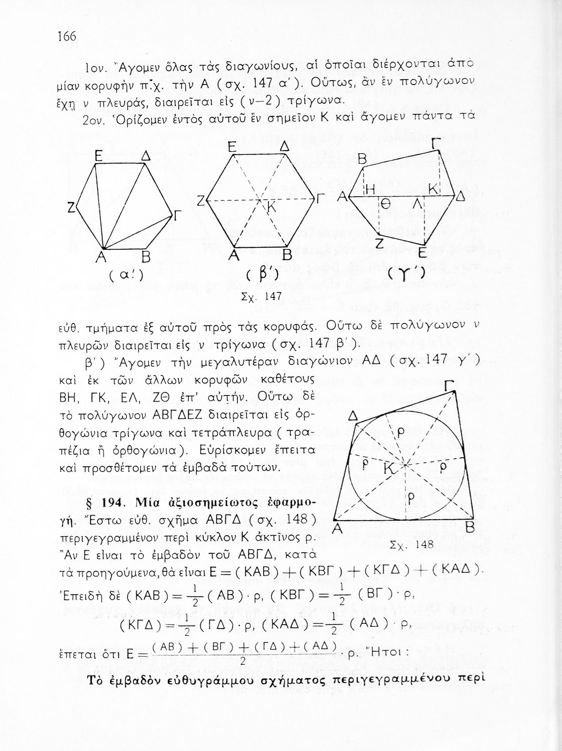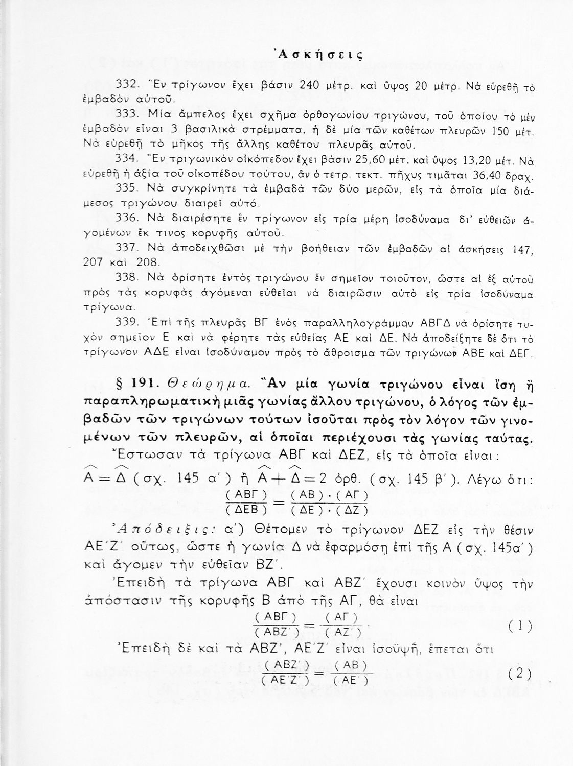 Σχολικό εγχειρίδιο Γεωμετρίας για τις Γ΄, Δ΄, Ε΄, ΣΤ΄ Γυμνασίου που περιλαμβάνει θεωρία και ασκήσεις και είναι χωρισμένο σε Επιπεδομετρία και Στερεομετρία. Φέρει το σύμβολο της δικτατορίας.