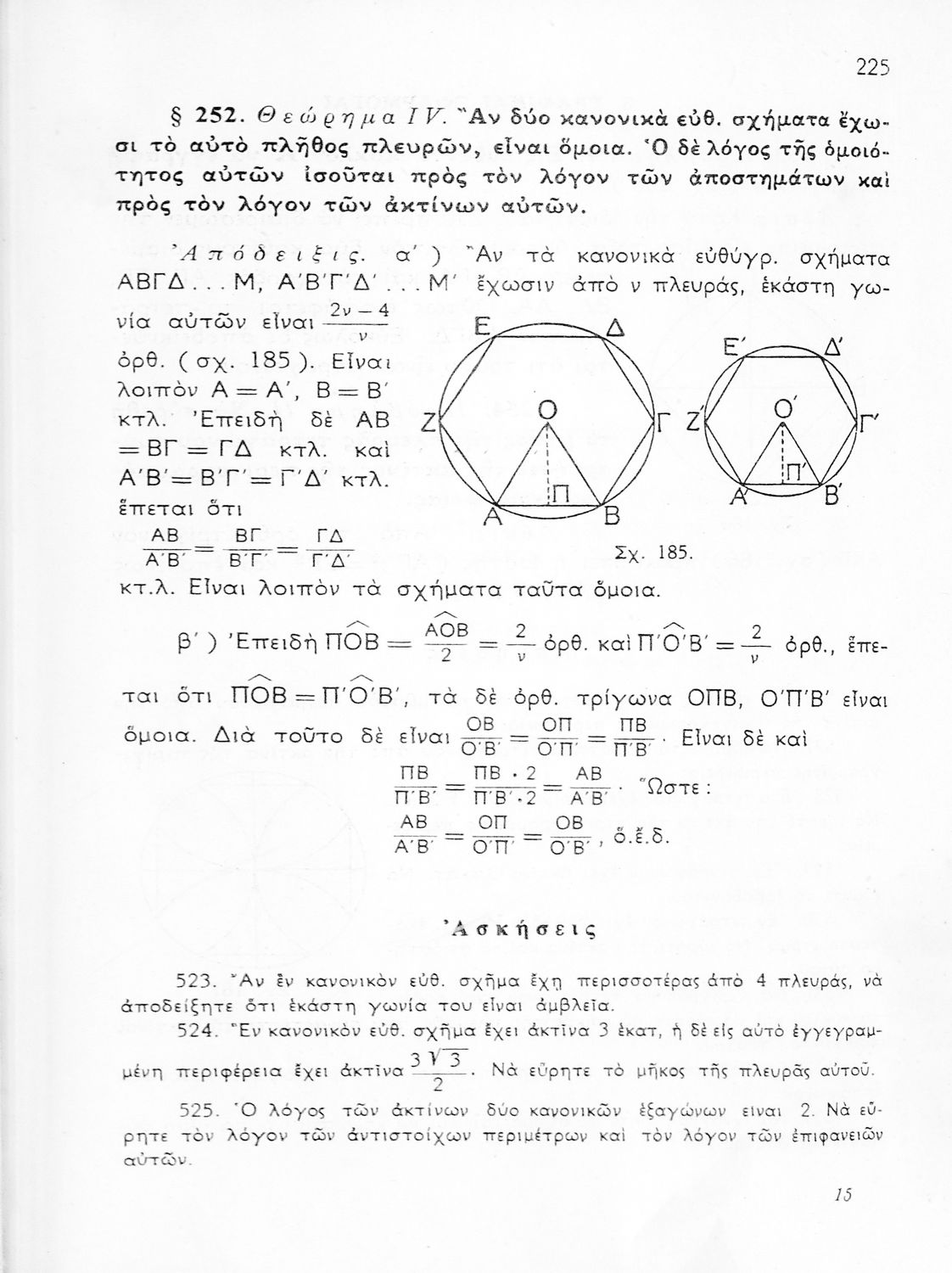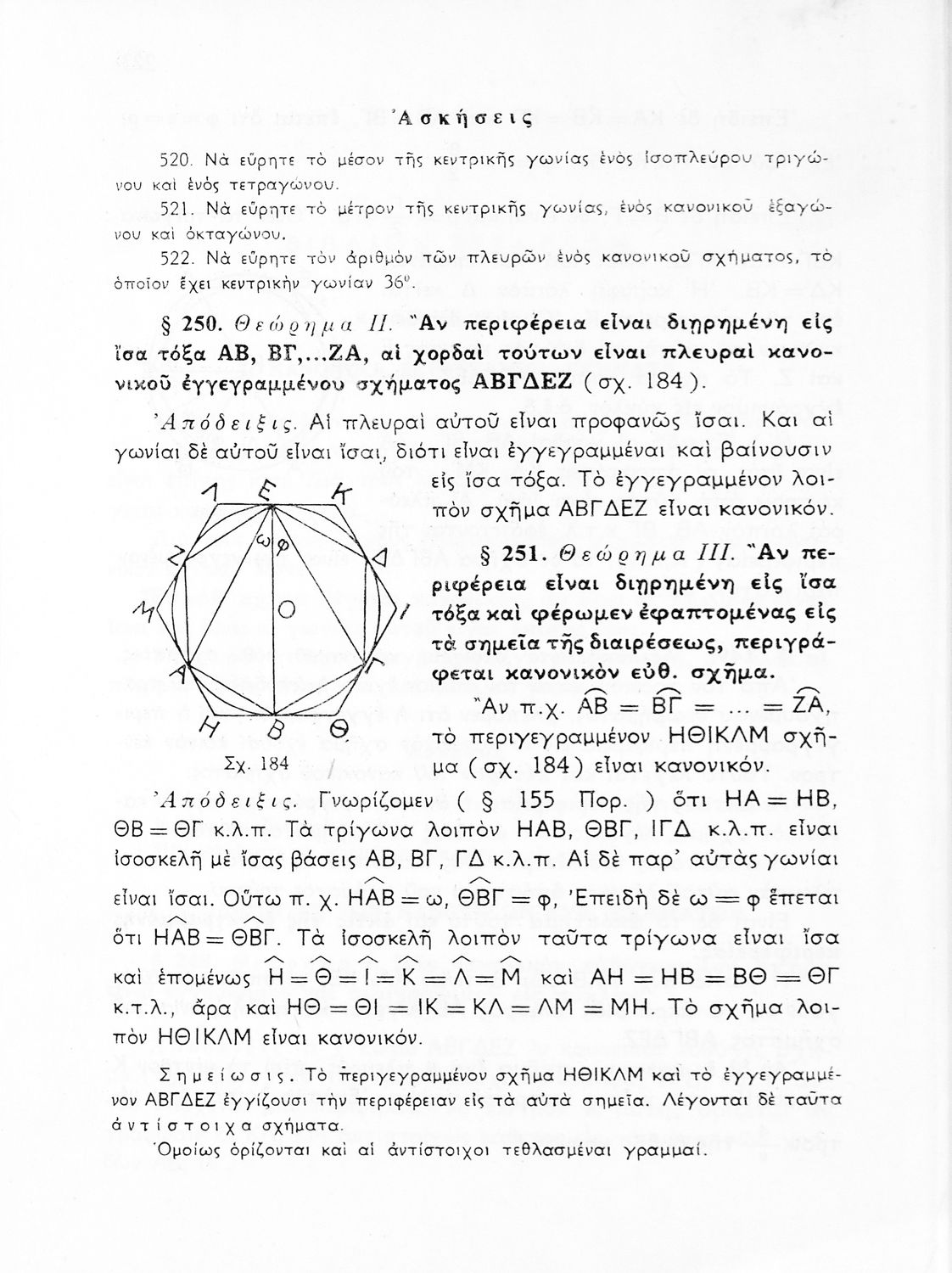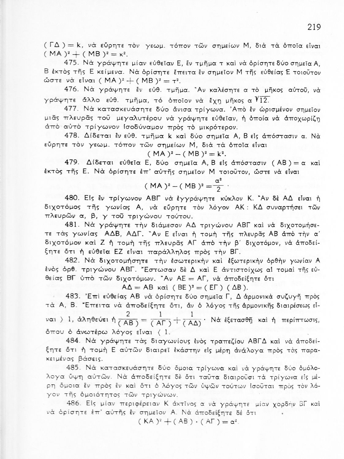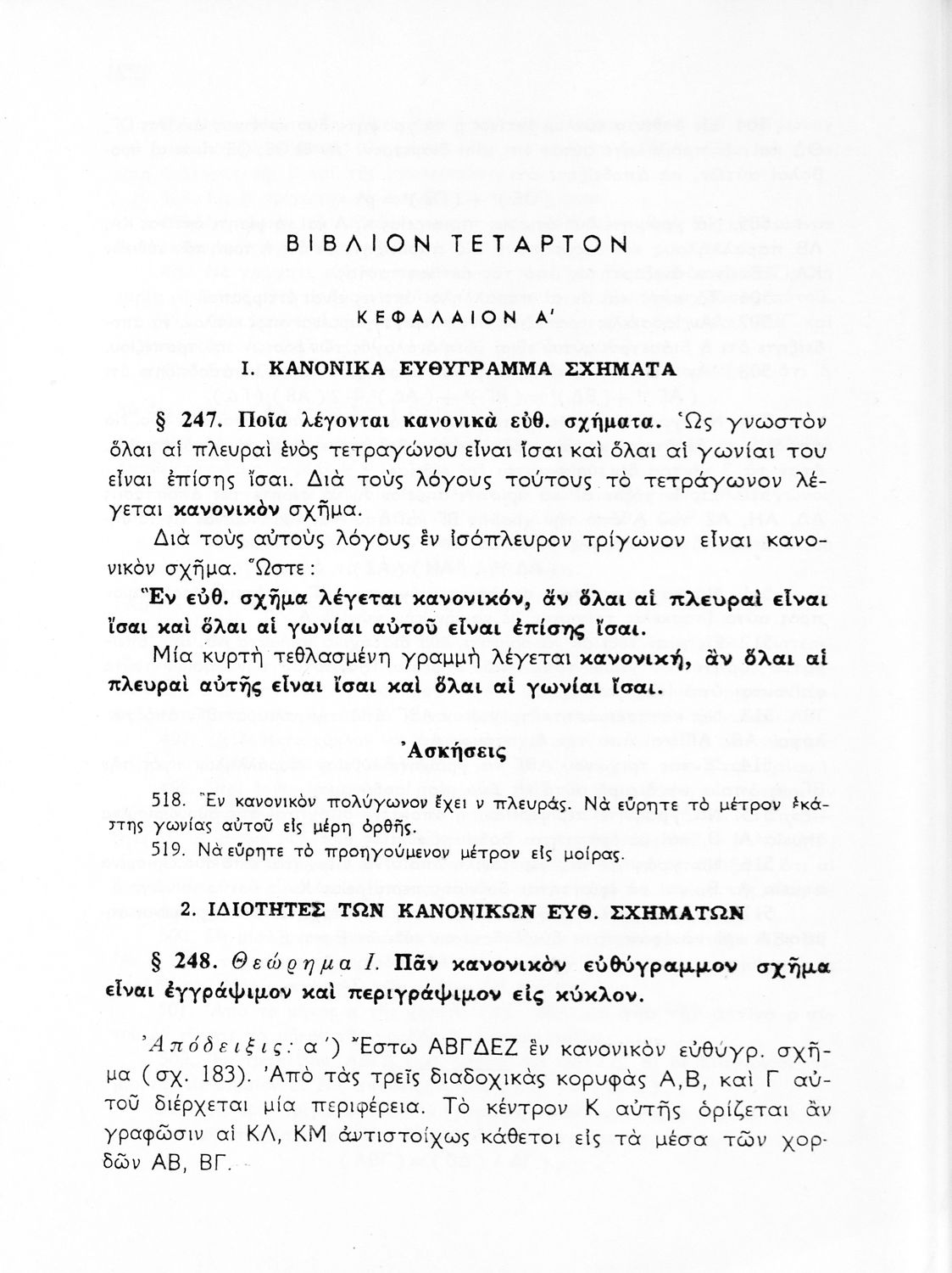 Σχολικό εγχειρίδιο Γεωμετρίας για τις Γ΄, Δ΄, Ε΄, ΣΤ΄ Γυμνασίου που εστιάζει στα βασικά θεωρήματα και ιδιότητες των γεωμετρικών σχημάτων. Φέρει το σύμβολο της δικτατορίας.