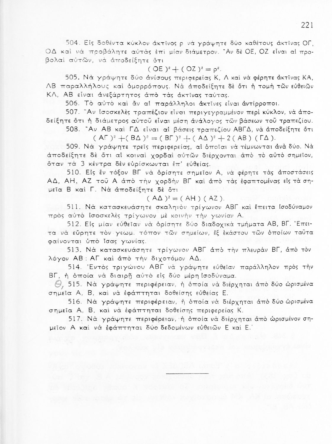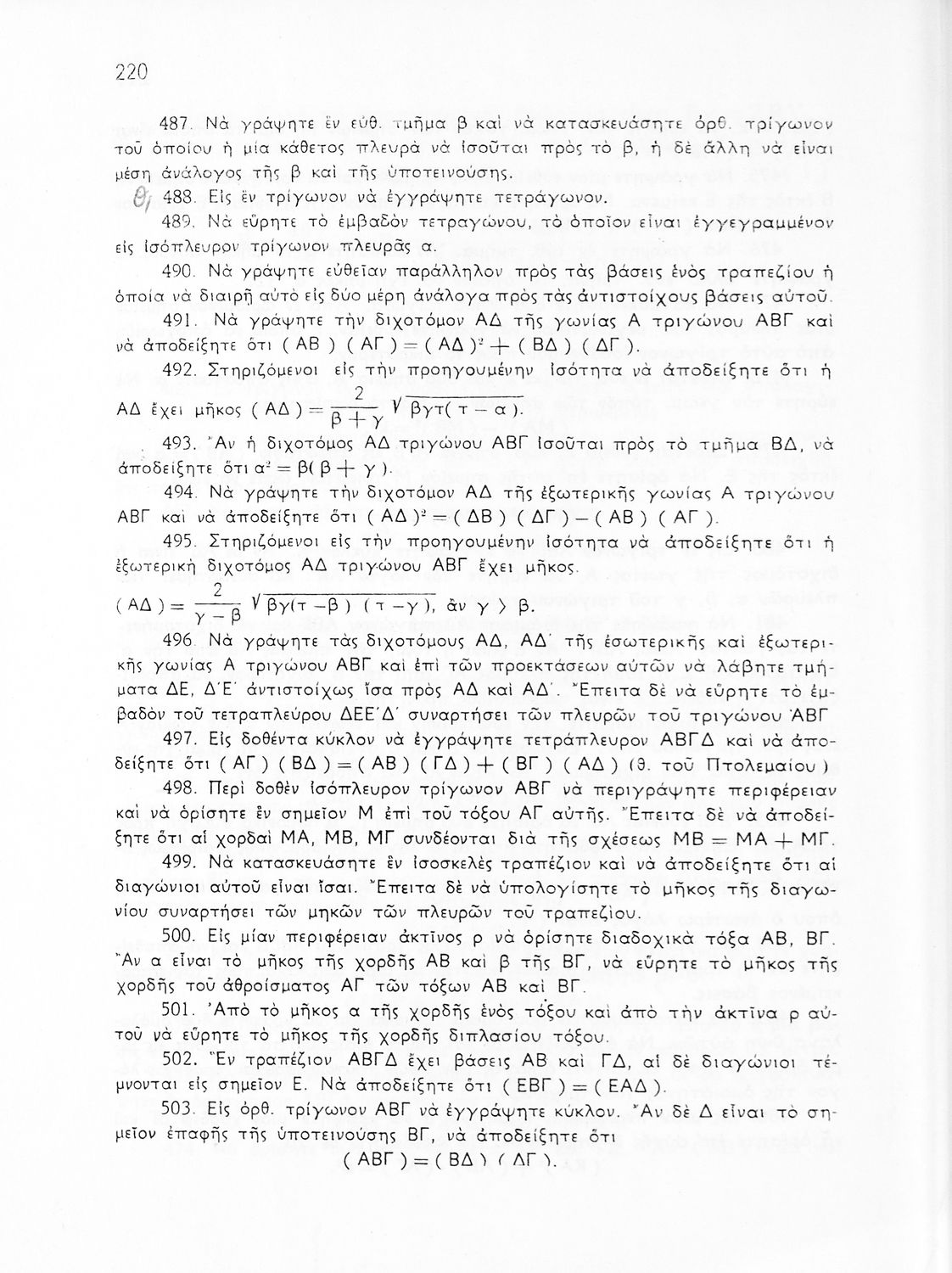 Σχολικό εγχειρίδιο Γεωμετρίας για τις Δ΄, Ε΄ και ΣΤ΄ Γυμνασίου που περιλαμβάνει αξιώματα, θεωρήματα και κατασκευές και είναι χωρισμένο σε γεωμετρία επιπέδου και γεωμετρία χώρου.