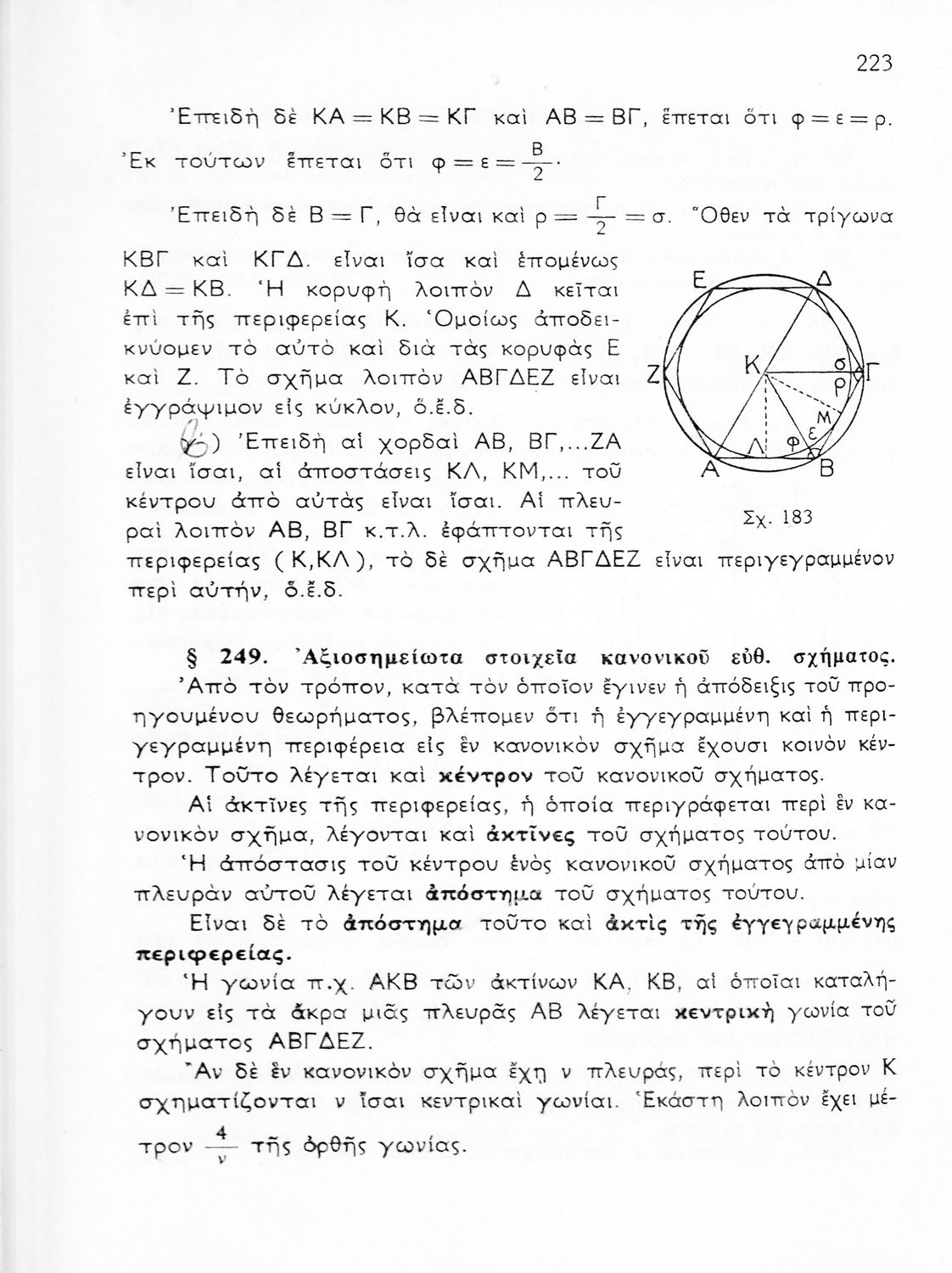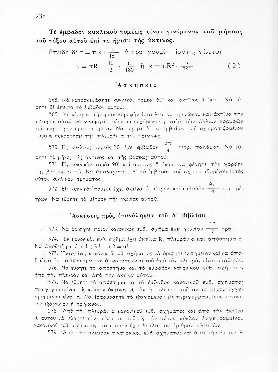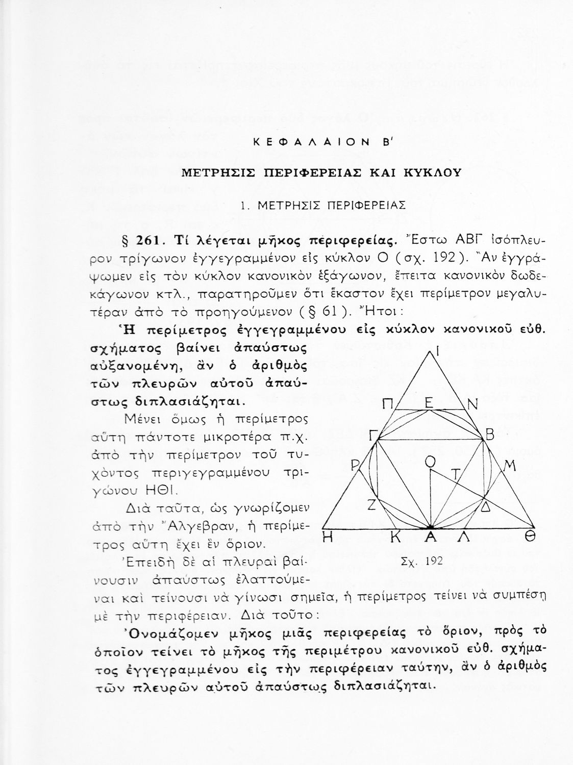 Σχολικό εγχειρίδιο Γεωμετρίας για τις Γ΄, Δ΄, Ε΄, ΣΤ΄ Γυμνασίου που περιλαμβάνει θεωρία και ασκήσεις και είναι χωρισμένο σε Επιπεδομετρία και Στερεομετρία. Φέρει το σύμβολο της δικτατορίας.