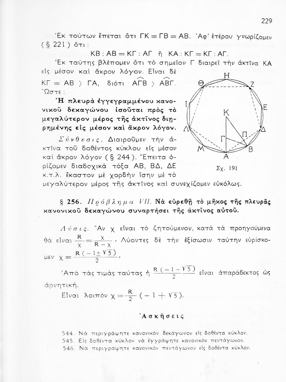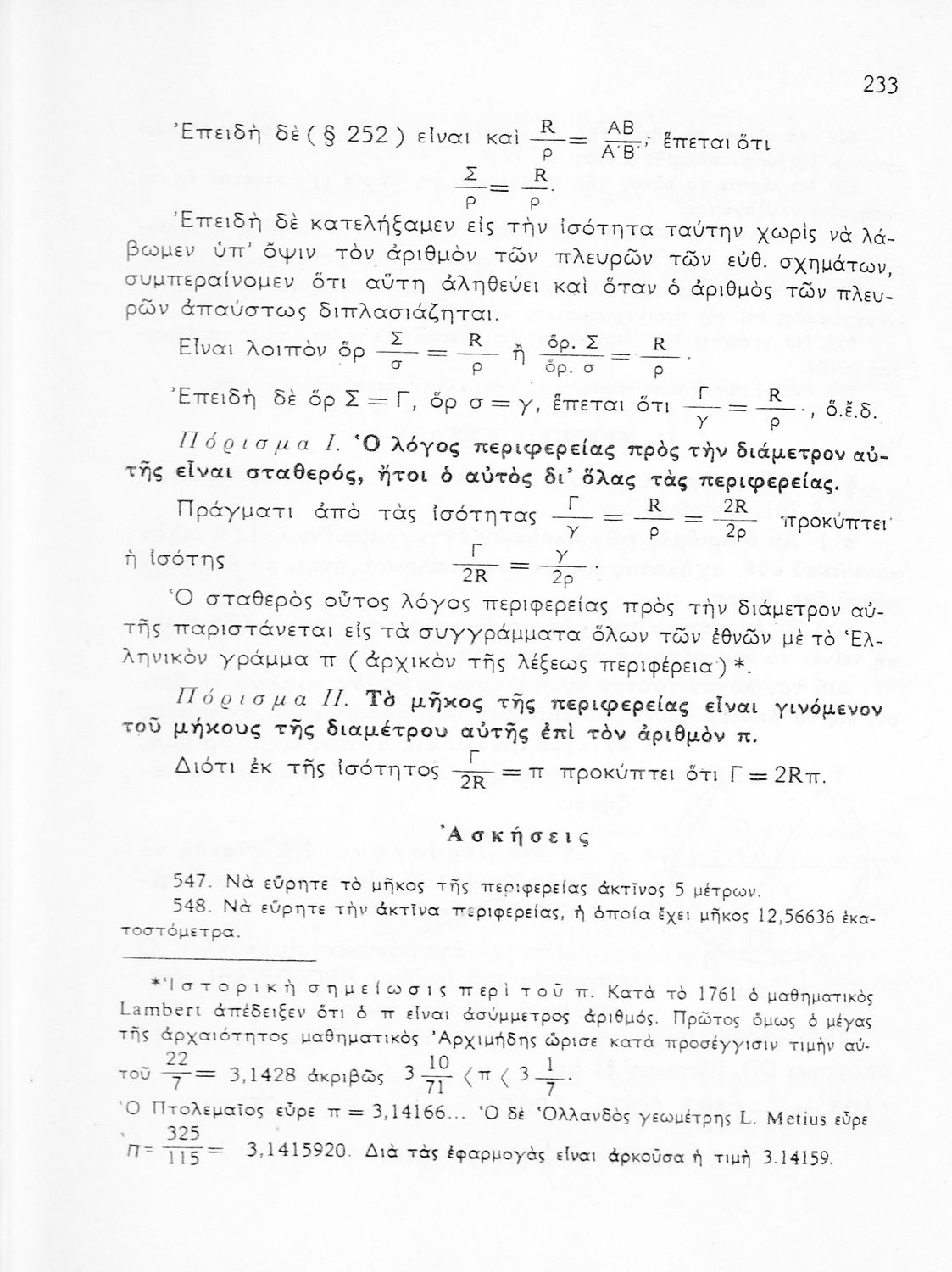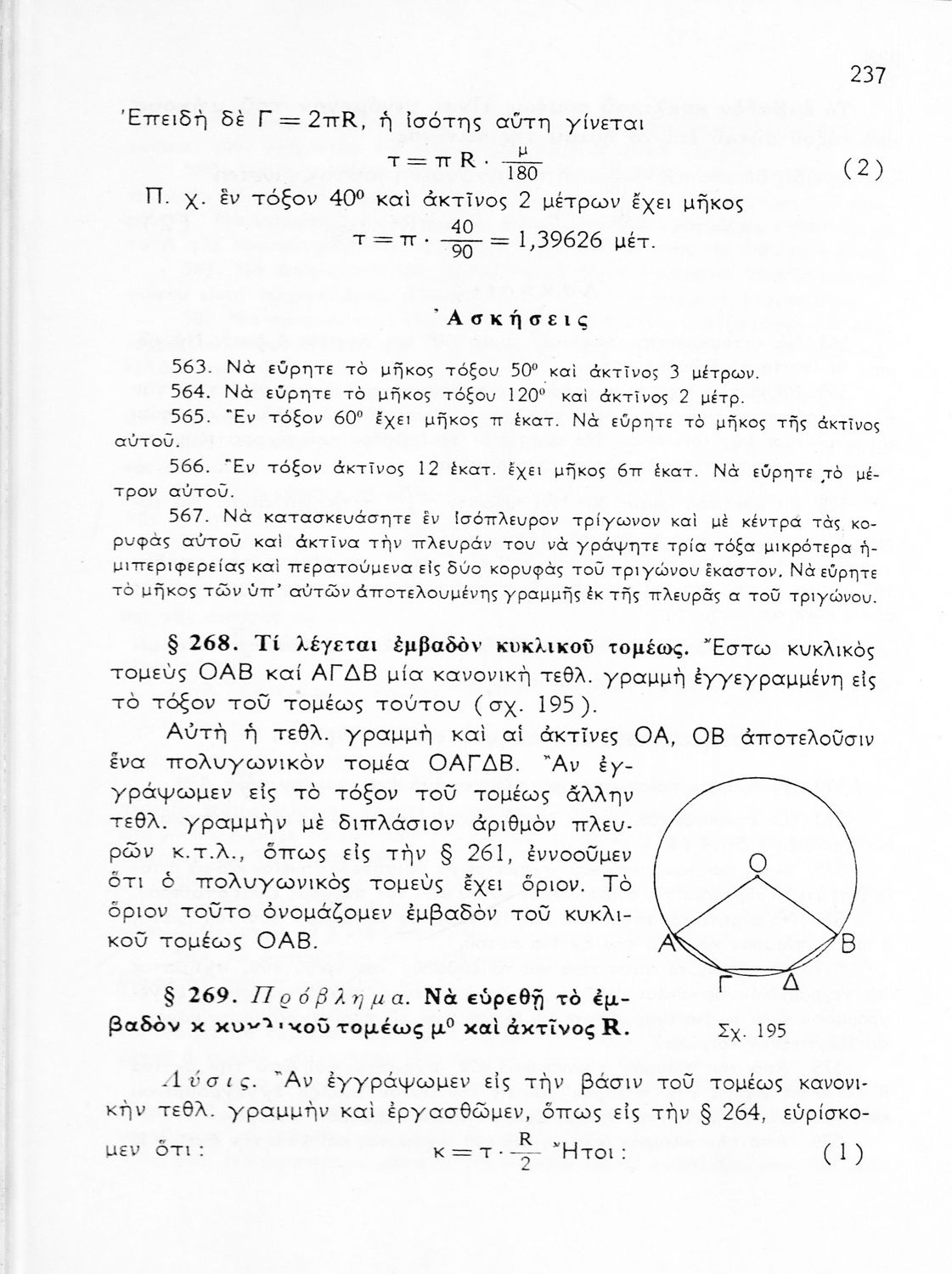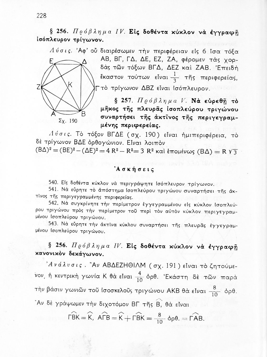 Σχολικό εγχειρίδιο Γεωμετρίας για τις Γ΄, Δ΄, Ε΄, ΣΤ΄ Γυμνασίου που περιλαμβάνει θεωρία και ασκήσεις και είναι χωρισμένο σε Επιπεδομετρία και Στερεομετρία. Φέρει το σύμβολο της δικτατορίας.