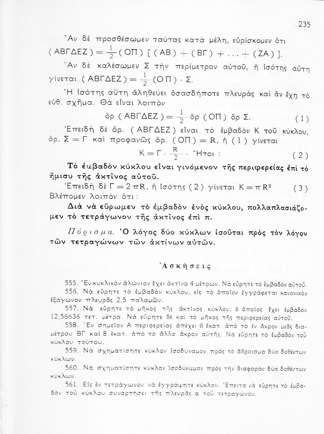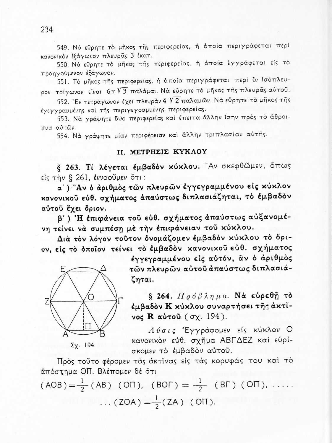 Σχολικό εγχειρίδιο Γεωμετρίας για τις Γ΄, Δ΄, Ε΄, ΣΤ΄ Γυμνασίου που περιλαμβάνει θεωρία και ασκήσεις και είναι χωρισμένο σε Επιπεδομετρία και Στερεομετρία.