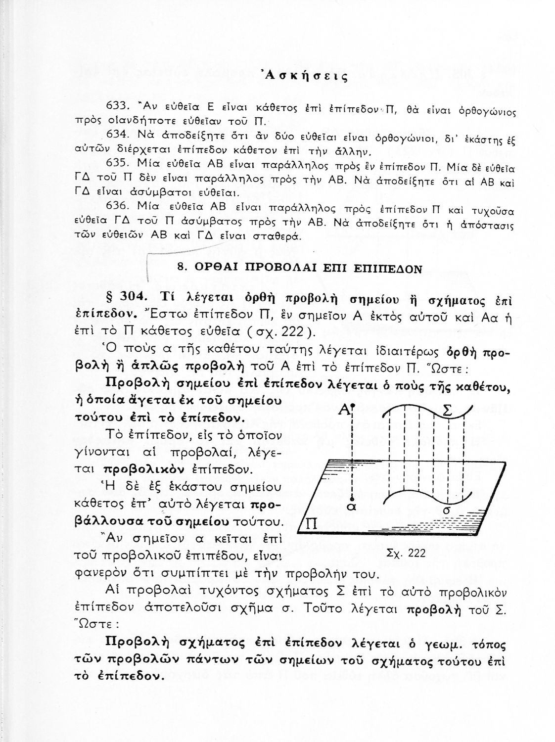 Σχολικό εγχειρίδιο Γεωμετρίας για τις Γ΄, Δ΄, Ε΄, ΣΤ΄ Γυμνασίου που περιλαμβάνει θεωρία και ασκήσεις και είναι χωρισμένο σε Επιπεδομετρία και Στερεομετρία. Φέρει το σύμβολο της δικτατορίας.