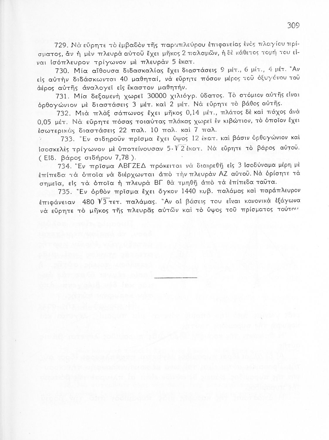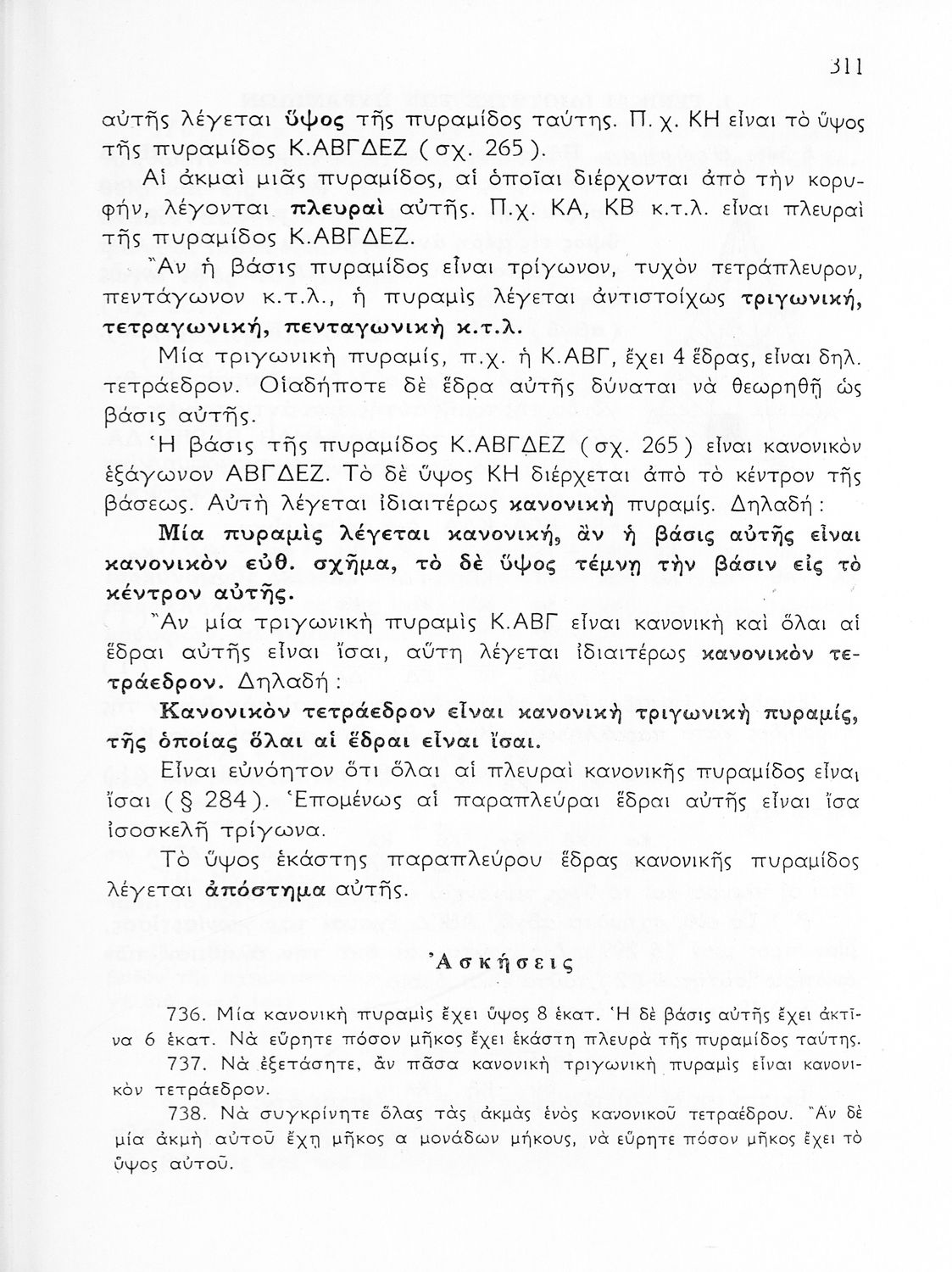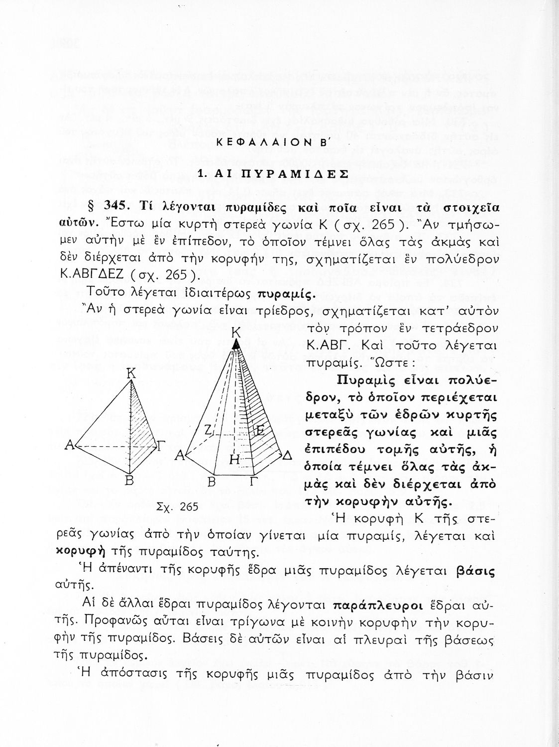 Σχολικό εγχειρίδιο Γεωμετρίας για τις Γ΄, Δ΄, Ε΄, ΣΤ΄ Γυμνασίου που περιλαμβάνει θεωρία και ασκήσεις και είναι χωρισμένο σε Επιπεδομετρία και Στερεομετρία. Φέρει το σύμβολο της δικτατορίας.