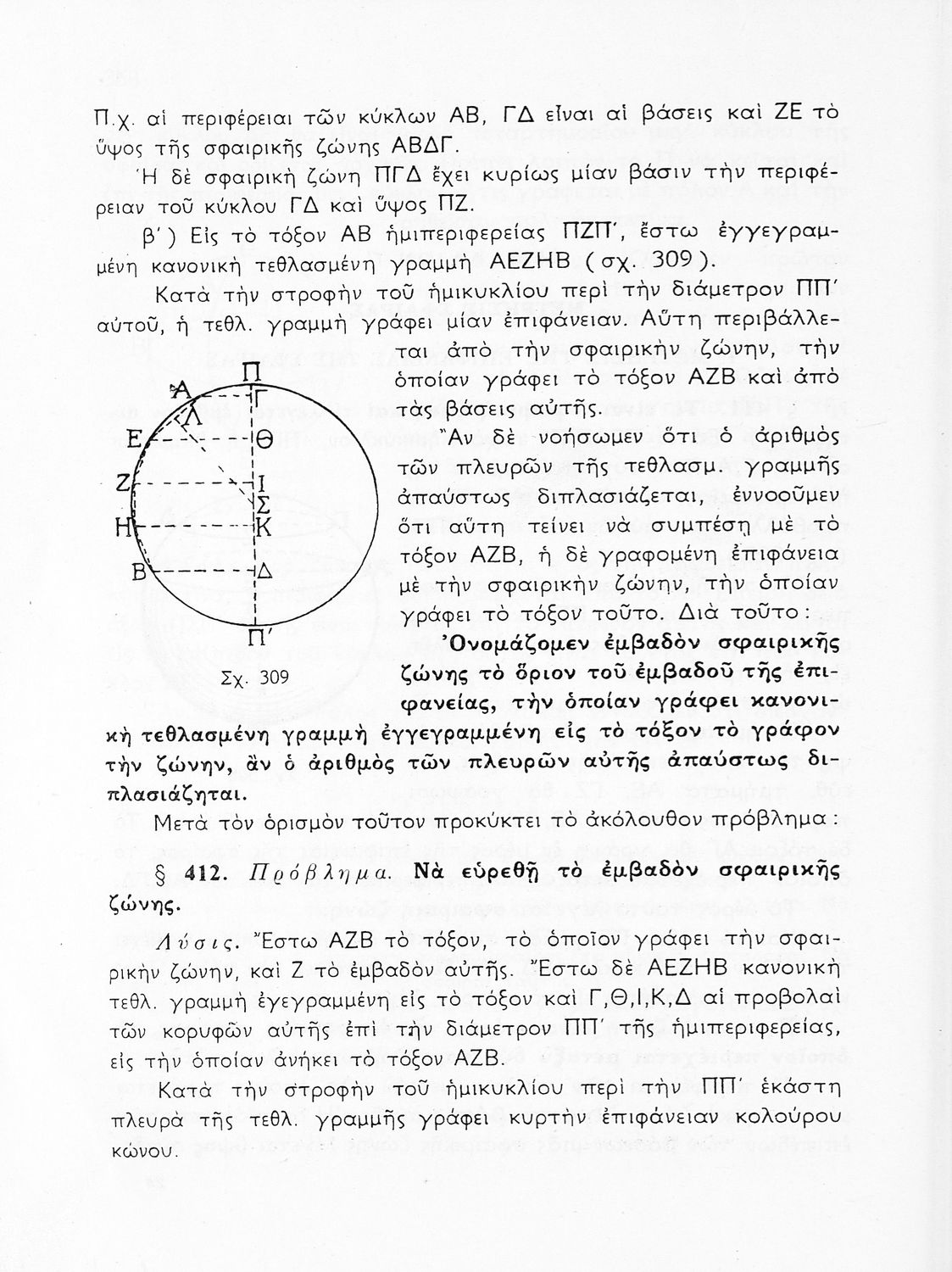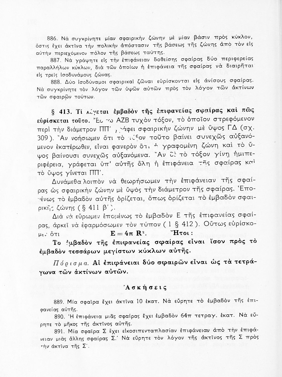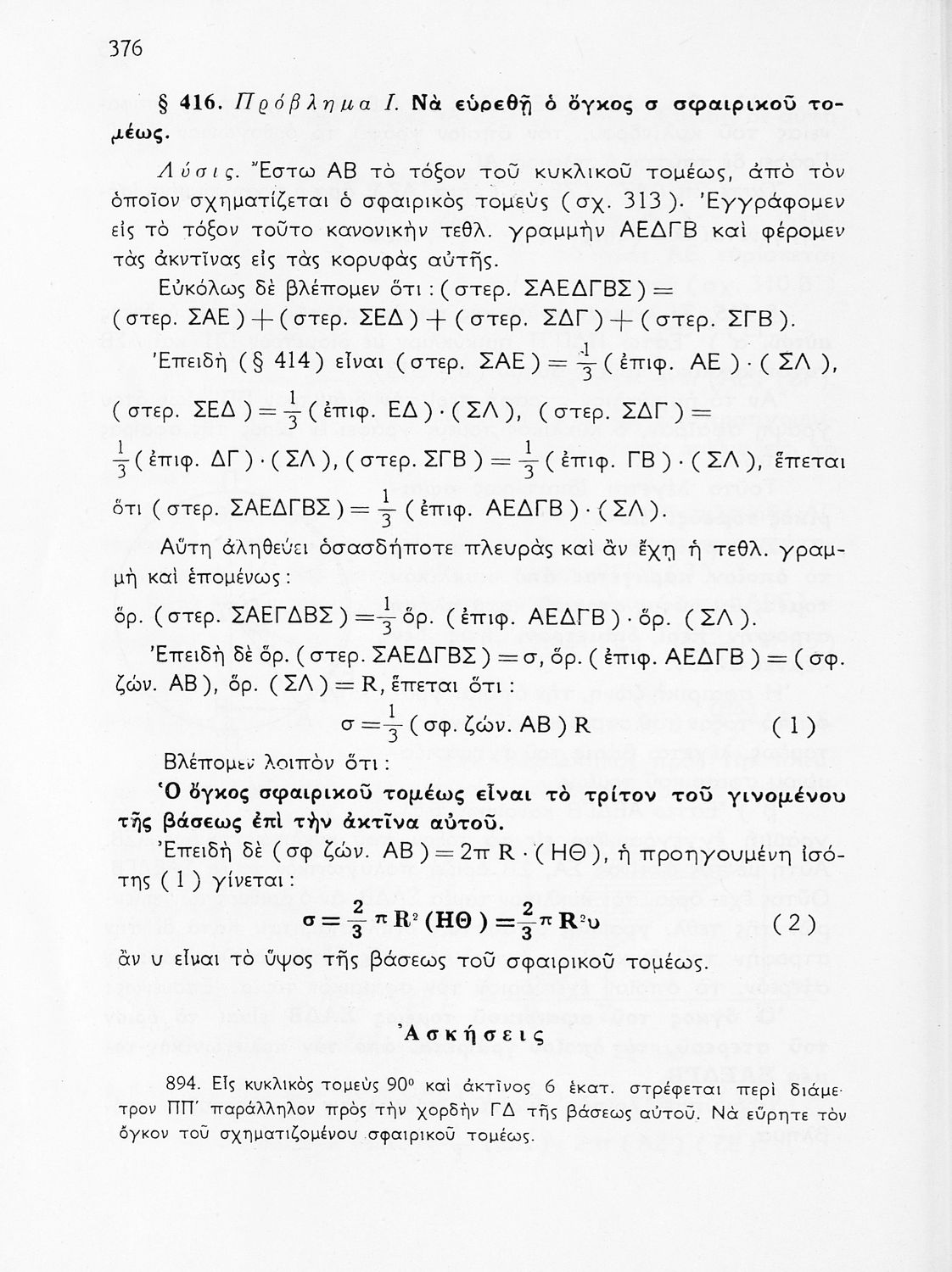 Σχολικό εγχειρίδιο Γεωμετρίας για τις Γ΄, Δ΄, Ε΄, ΣΤ΄ Γυμνασίου που περιλαμβάνει θεωρία και ασκήσεις και είναι χωρισμένο σε Επιπεδομετρία και Στερεομετρία. Φέρει το σύμβολο της δικτατορίας.