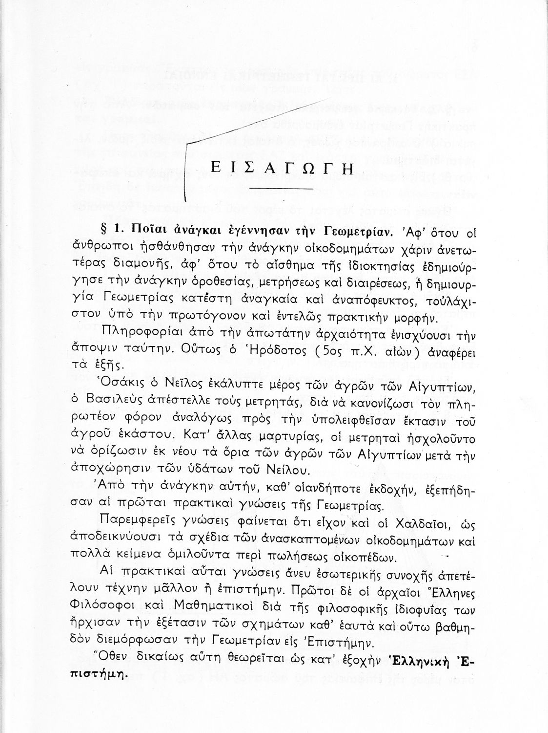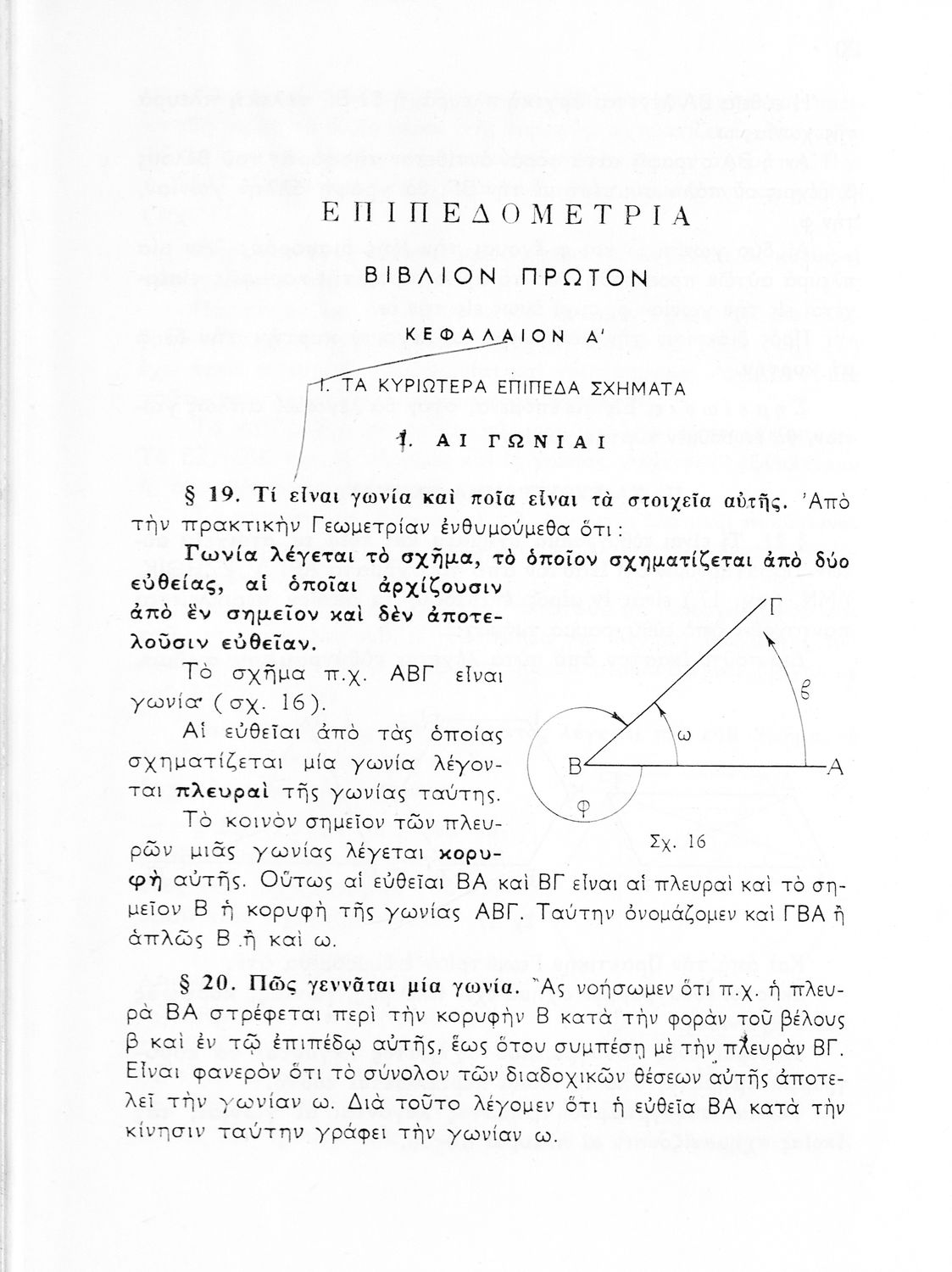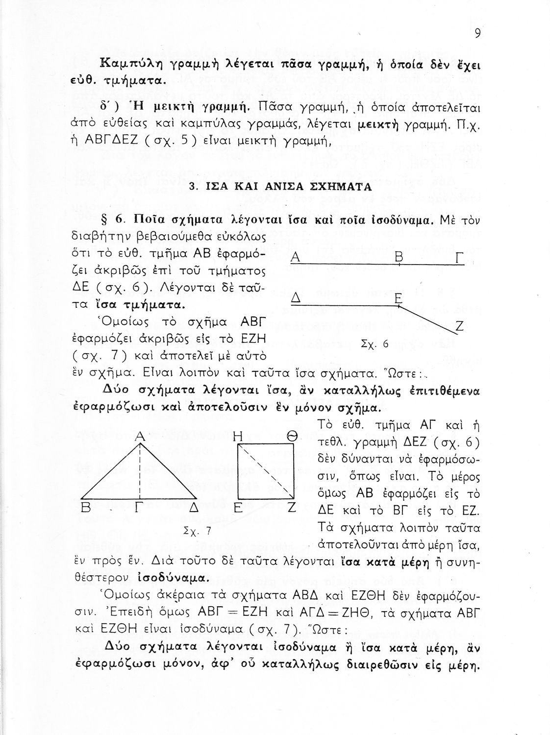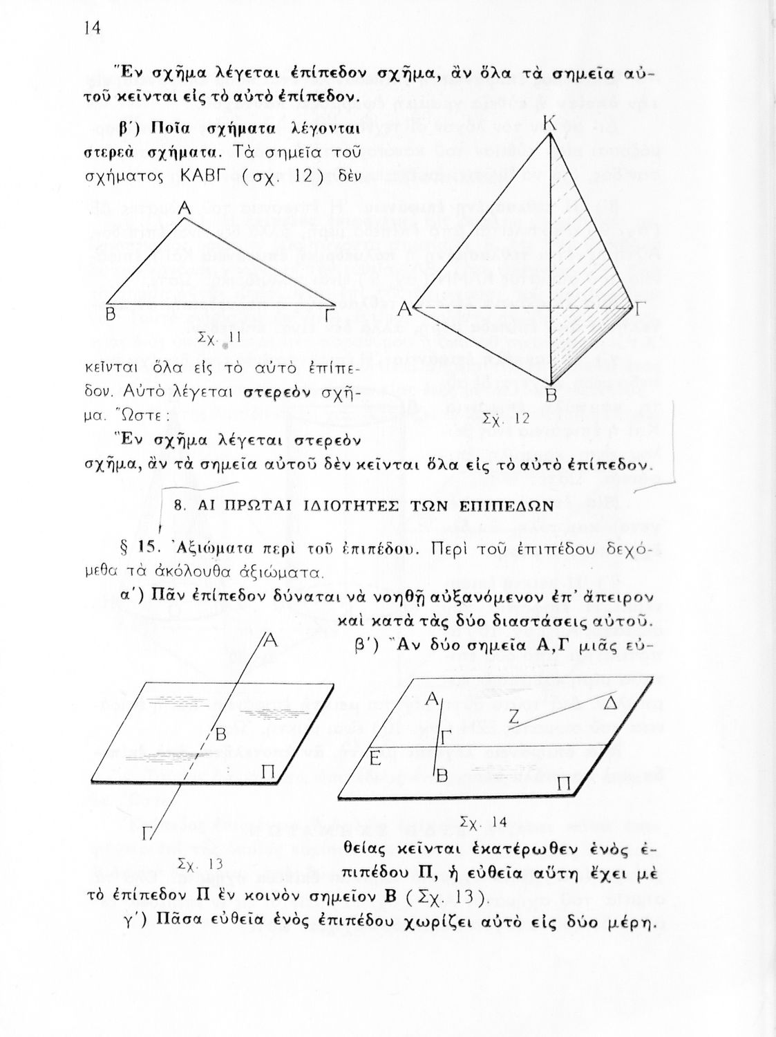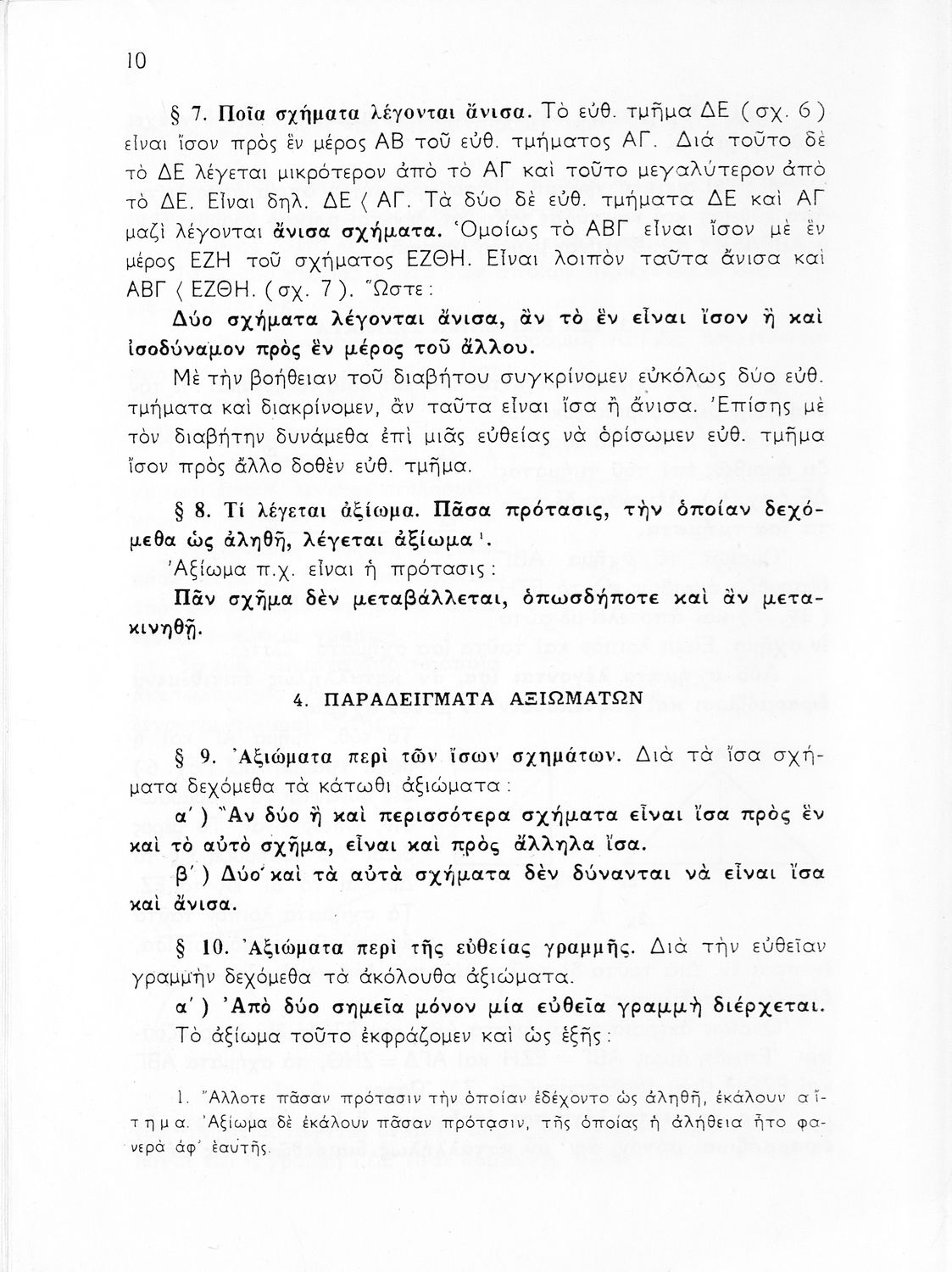 Σχολικό εγχειρίδιο Γεωμετρίας για τις Δ΄, Ε΄ και ΣΤ΄ Γυμνασίου που περιλαμβάνει αξιώματα, θεωρήματα και κατασκευές και είναι χωρισμένο σε γεωμετρία επιπέδου και γεωμετρία χώρου.