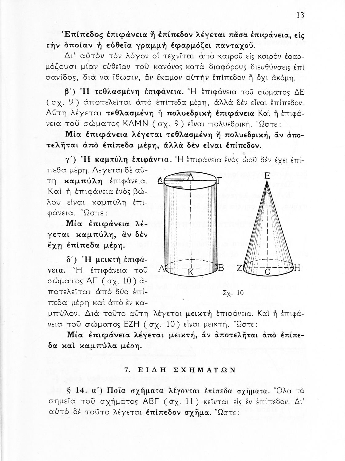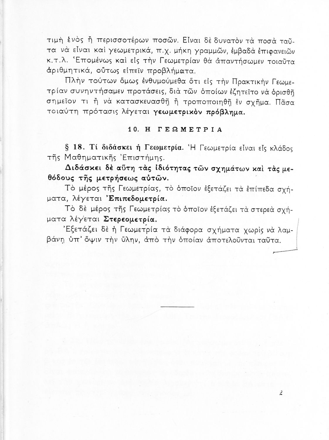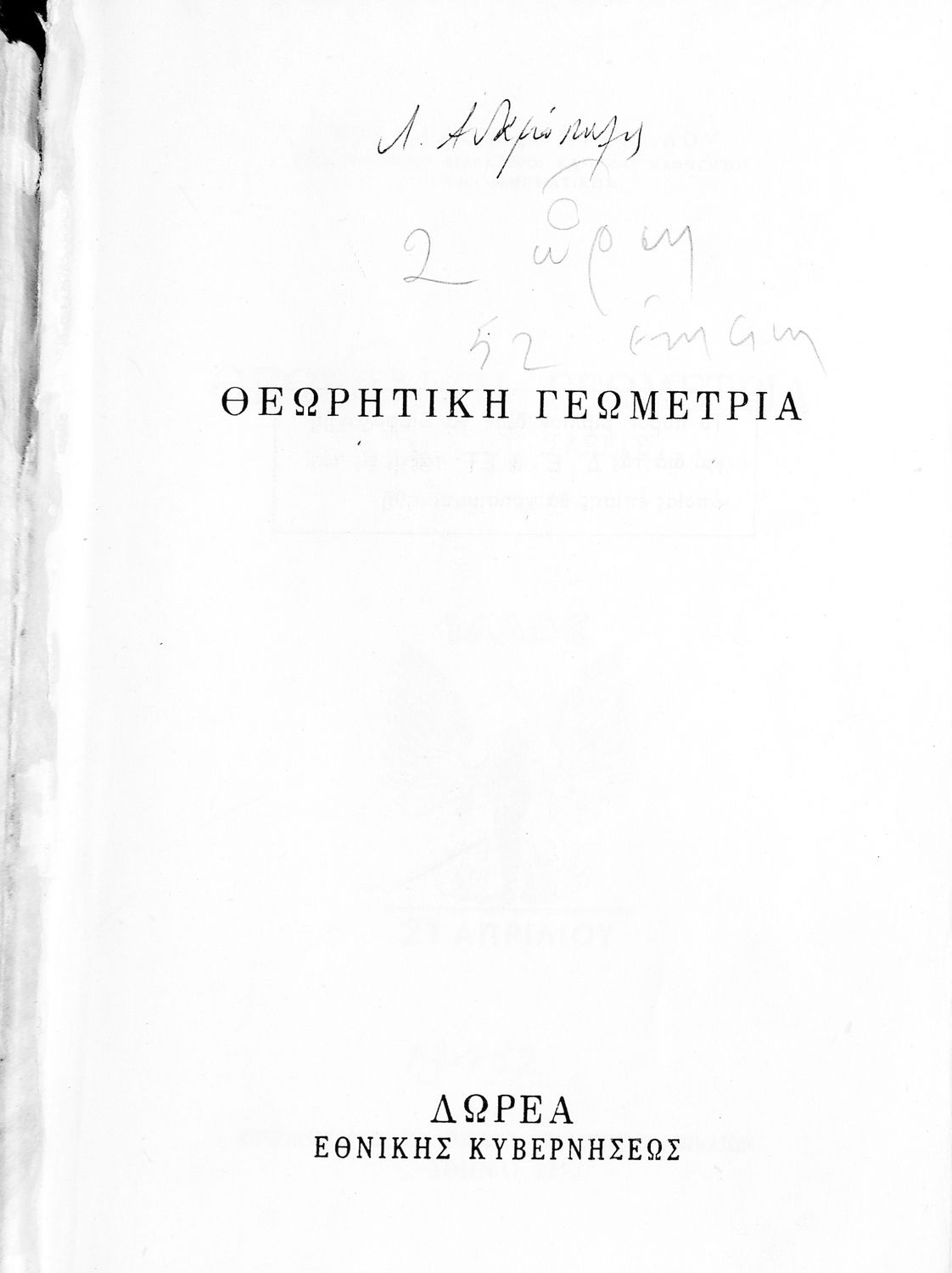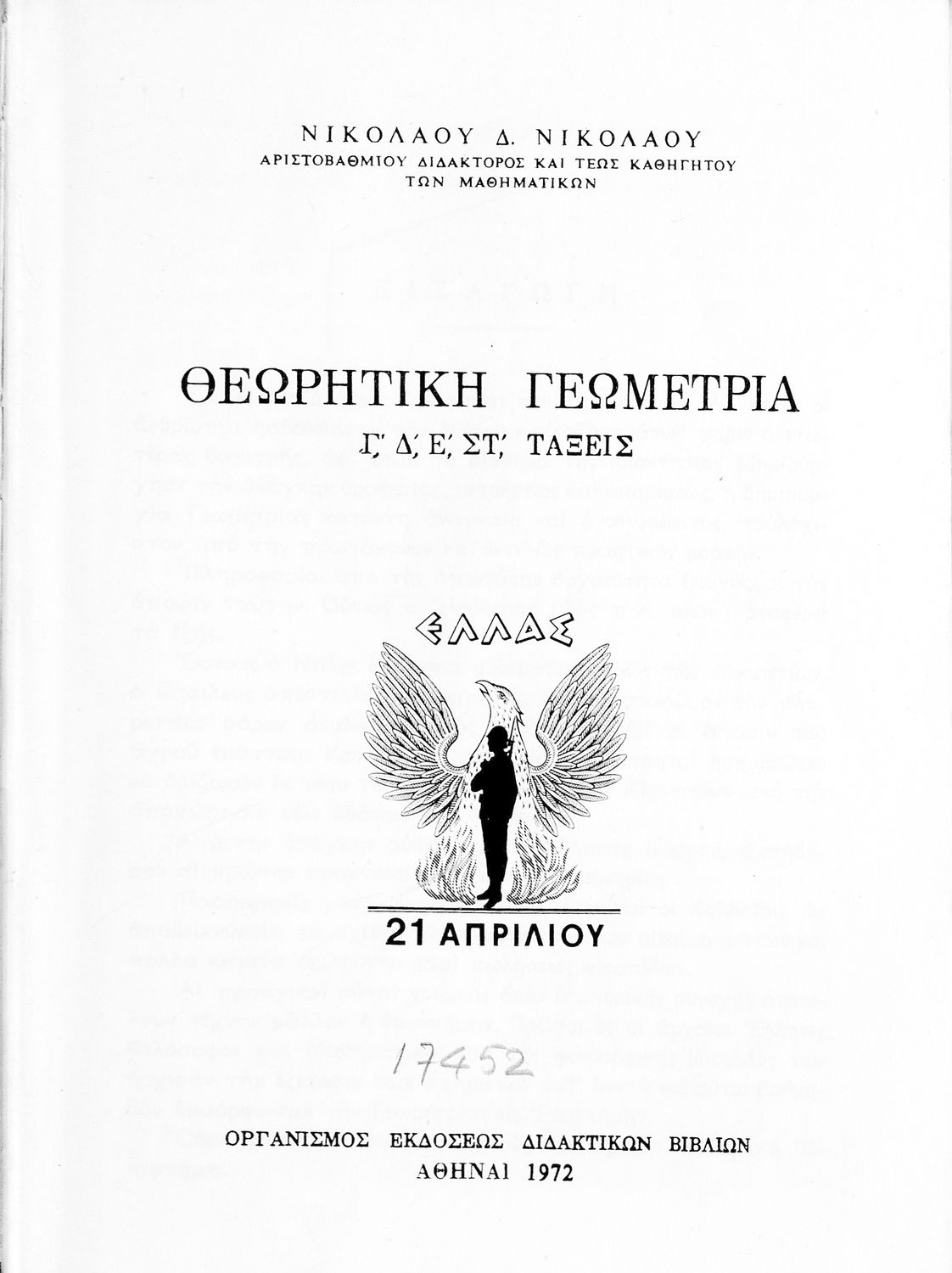 Σχολικό εγχειρίδιο Γεωμετρίας για τις Γ΄, Δ΄, Ε΄, ΣΤ΄ Γυμνασίου που περιλαμβάνει θεωρία και ασκήσεις και είναι χωρισμένο σε Επιπεδομετρία και Στερεομετρία. Φέρει το σύμβολο της δικτατορίας.