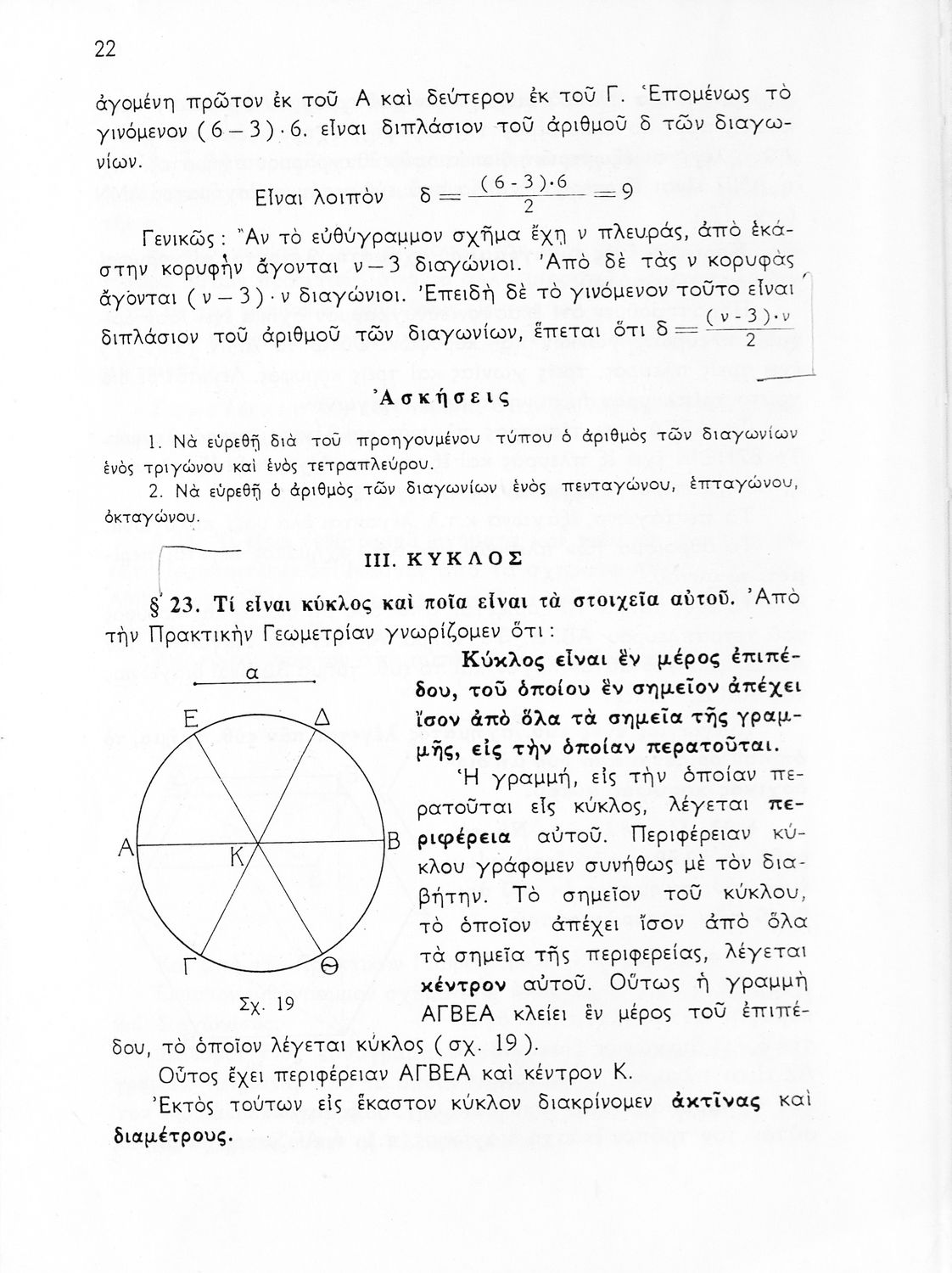 Σχολικό εγχειρίδιο Γεωμετρίας για τις Γ΄, Δ΄, Ε΄, ΣΤ΄ Γυμνασίου που περιλαμβάνει θεωρία και ασκήσεις και είναι χωρισμένο σε Επιπεδομετρία και Στερεομετρία.