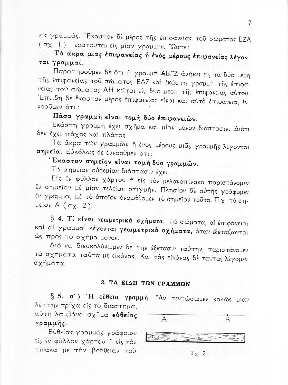 Παρουσίαση περιεχομένου: Σχολικό εγχειρίδιο Γεωμετρίας για τις Γ΄, Δ΄, Ε΄, ΣΤ΄ Γυμνασίου που περιλαμβάνει θεωρία και ασκήσεις και είναι χωρισμένο σε Επιπεδομετρία και Στερεομετρία. Φέρει το σύμβολο της δικτατορίας.