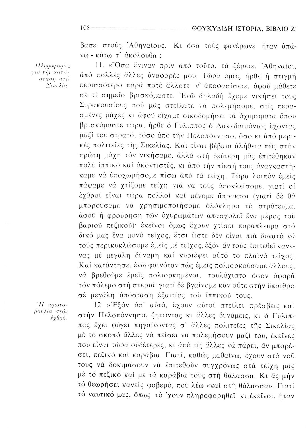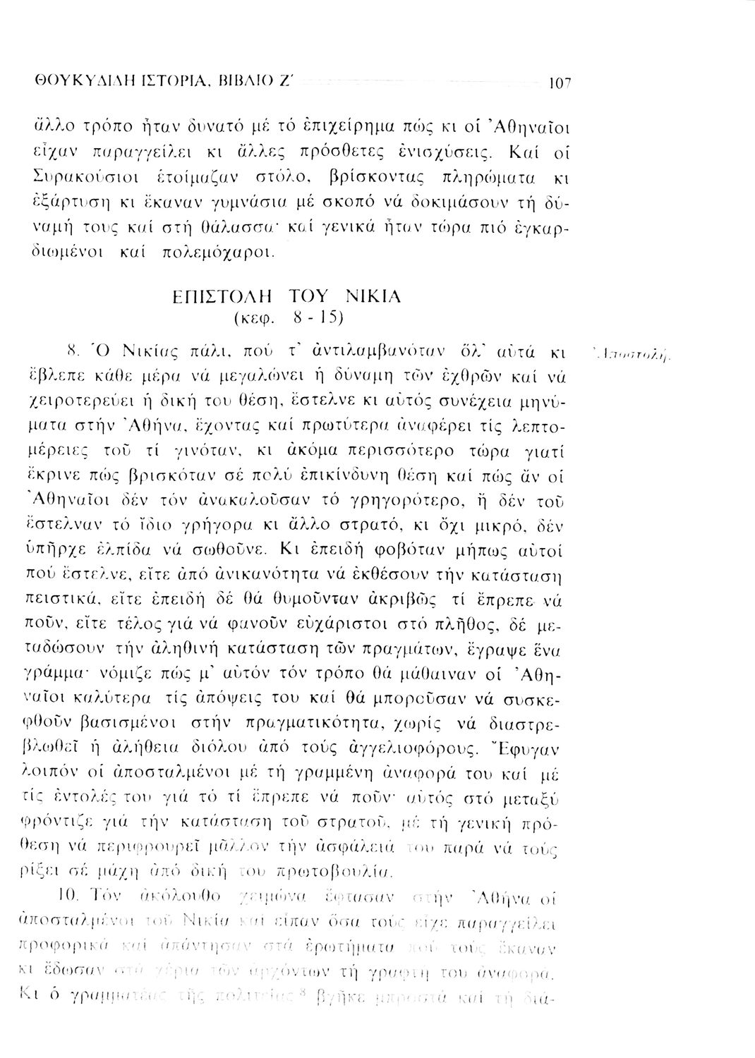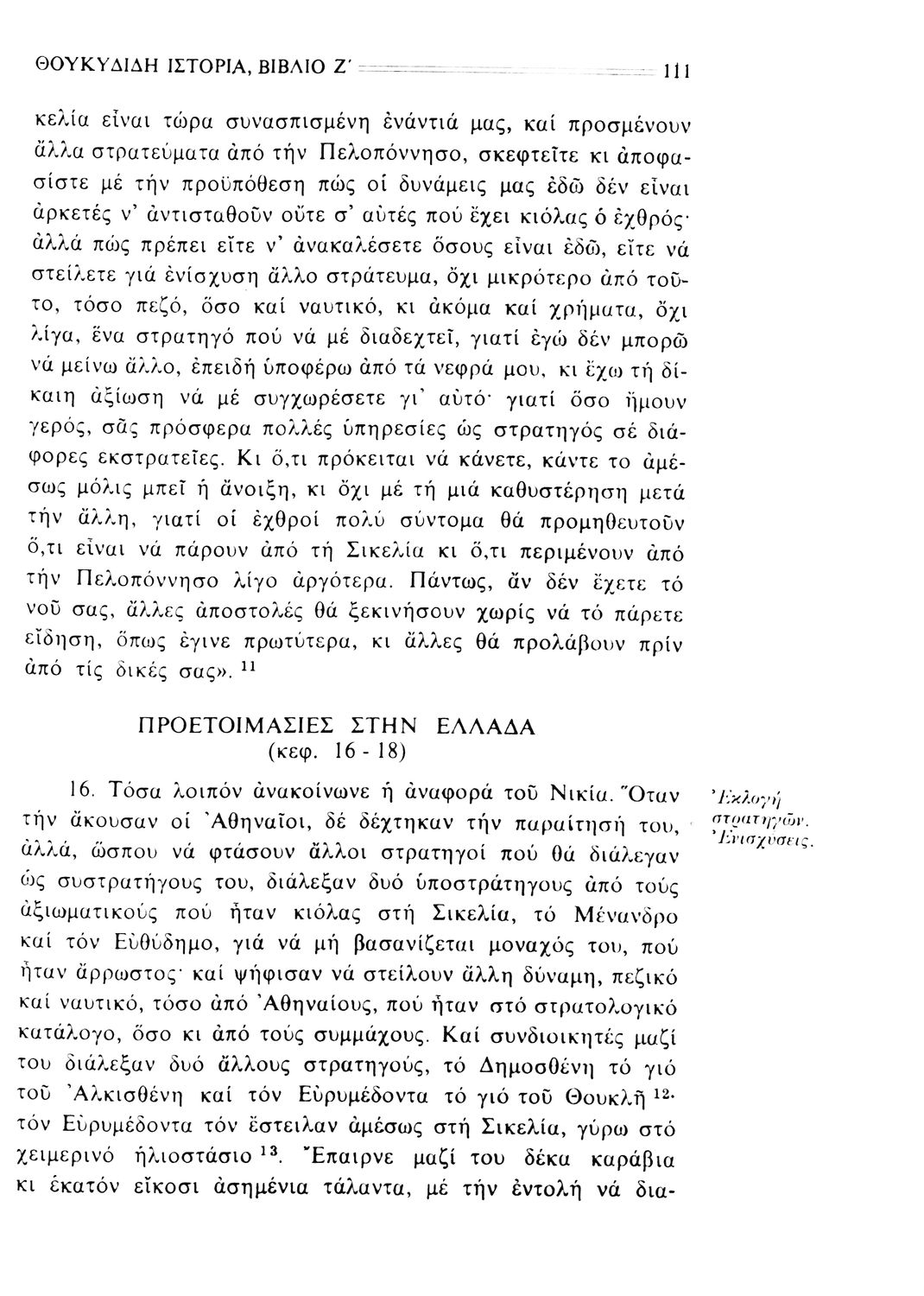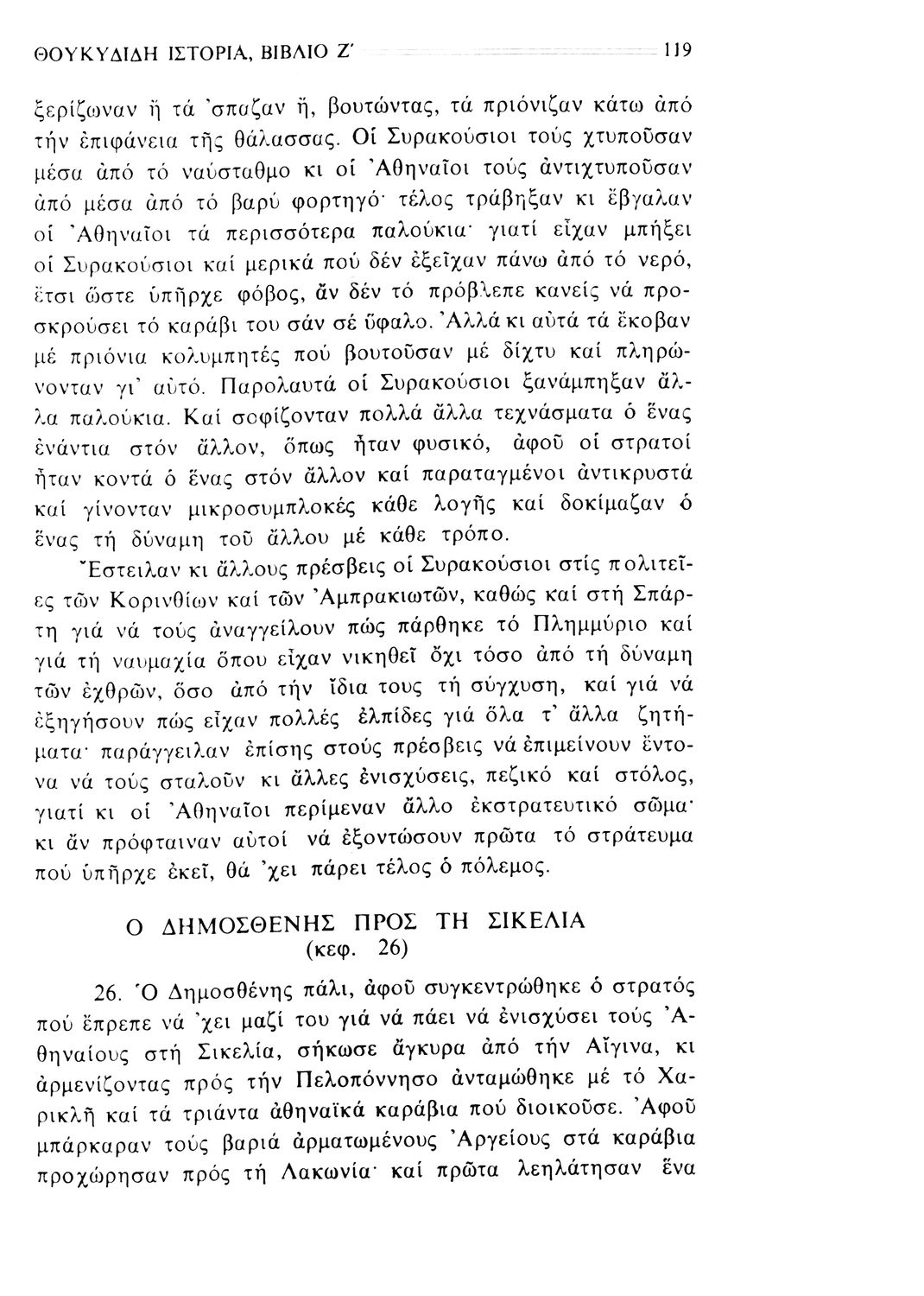 Σχολικό εγχειρίδιο Αρχαίων Ελληνικών Β΄ Γυμνασίου που περιλαμβάνει την μετάφραση των βιβλίων ΣΤ΄ και Ζ΄ της Ιστορίας του Θουκυδίδη, εισαγωγή στη ζωή και το έργο του, και ερμηνευτικά και πραγματολογικά σχόλια.