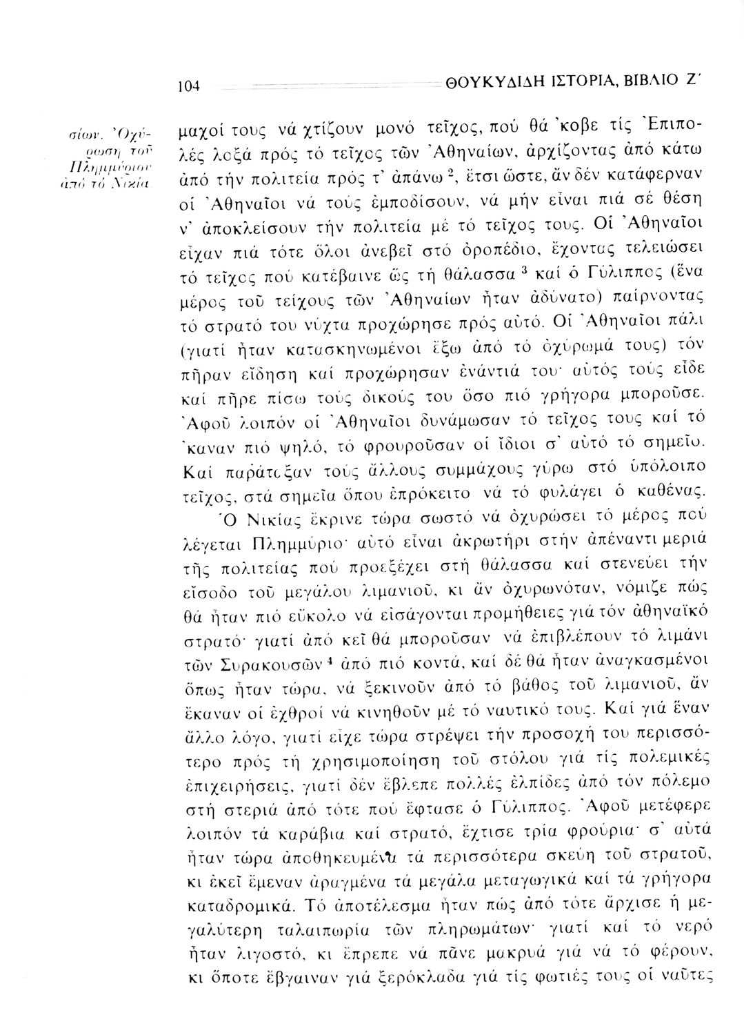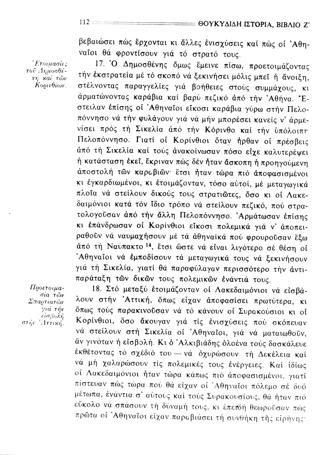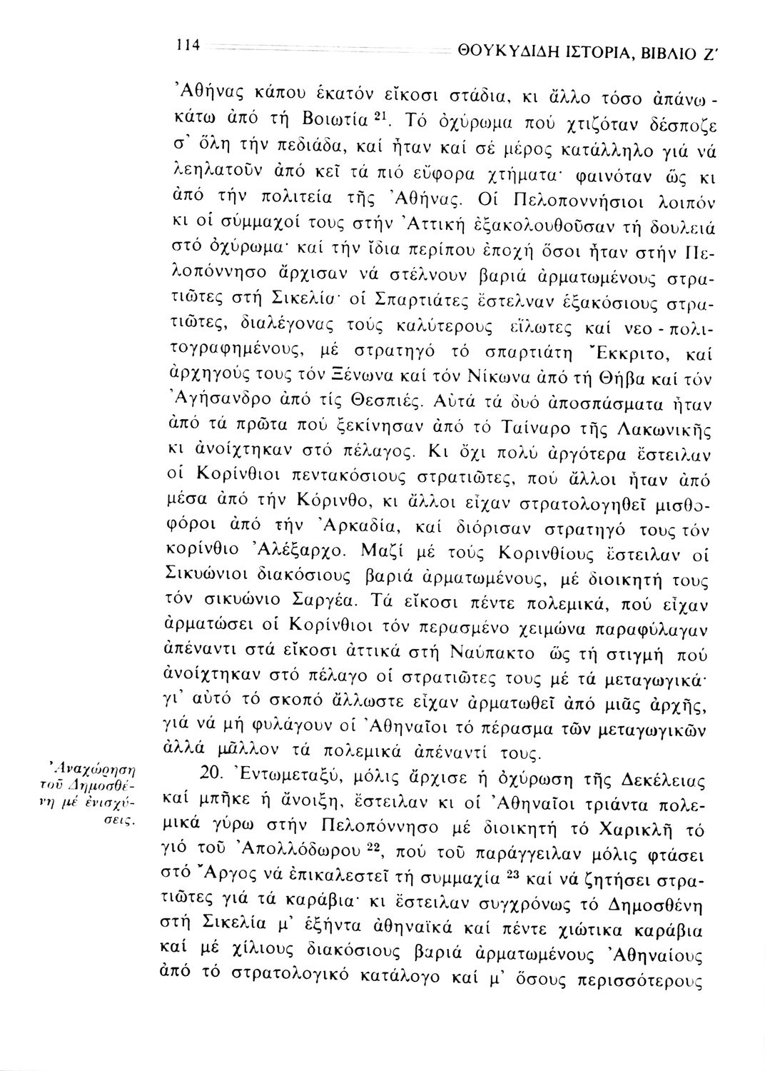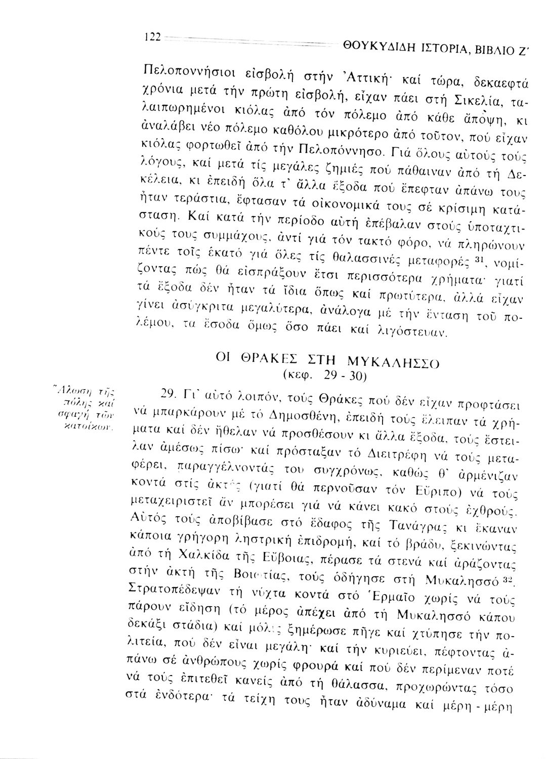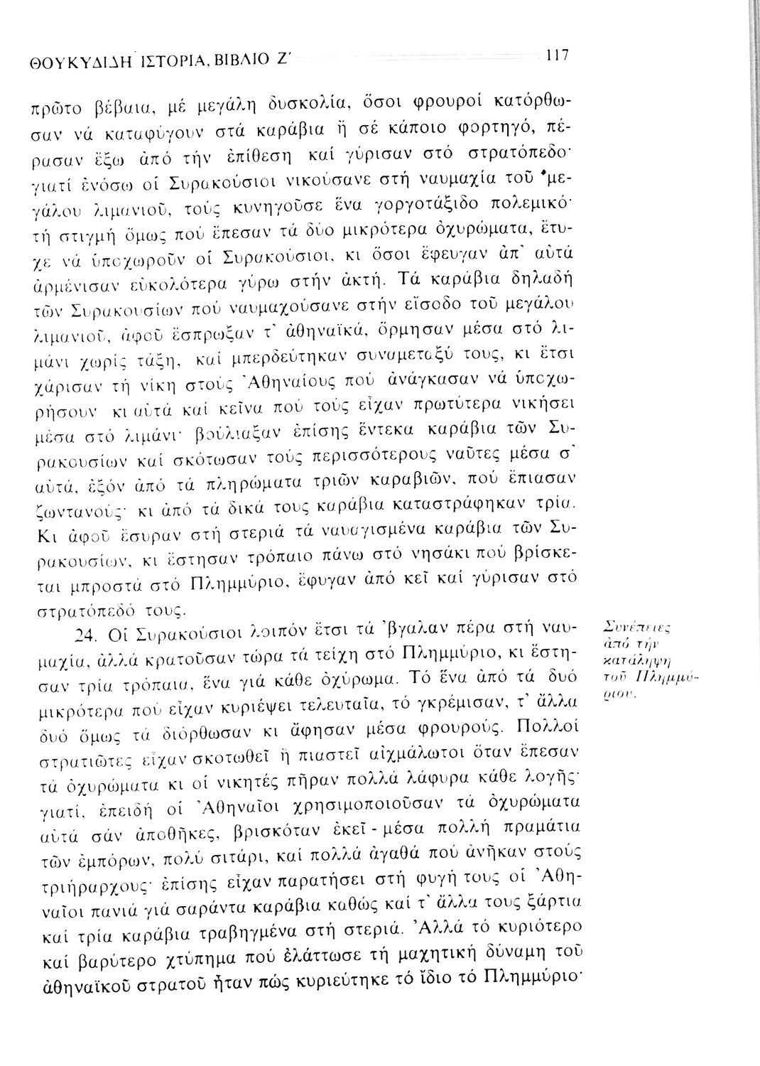 Σχολικό εγχειρίδιο Αρχαίων Ελληνικών Β΄ Γυμνασίου που περιλαμβάνει την μετάφραση των βιβλίων ΣΤ΄ και Ζ΄ της Ιστορίας του Θουκυδίδη, εισαγωγή στη ζωή και το έργο του, και ερμηνευτικά και πραγματολογικά σχόλια.