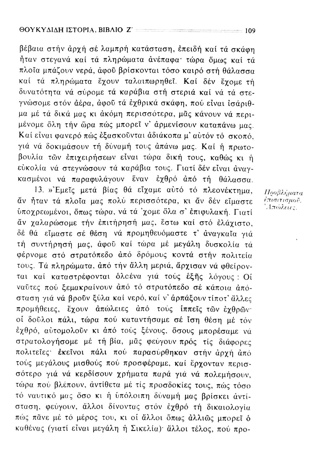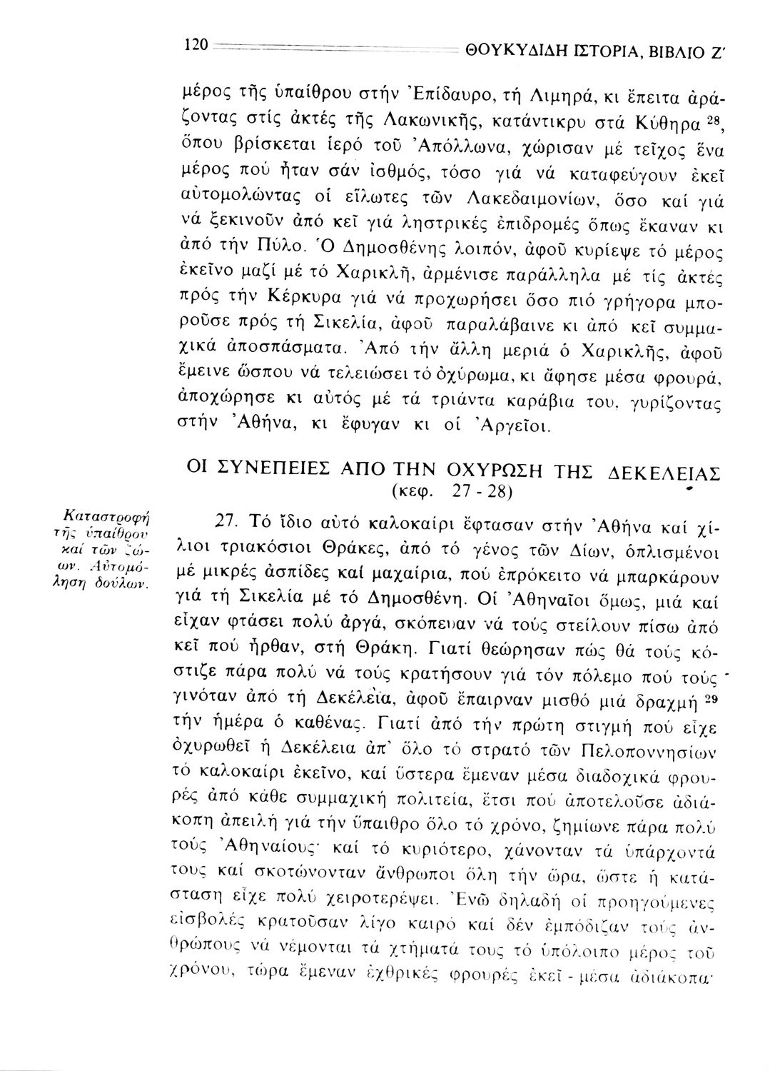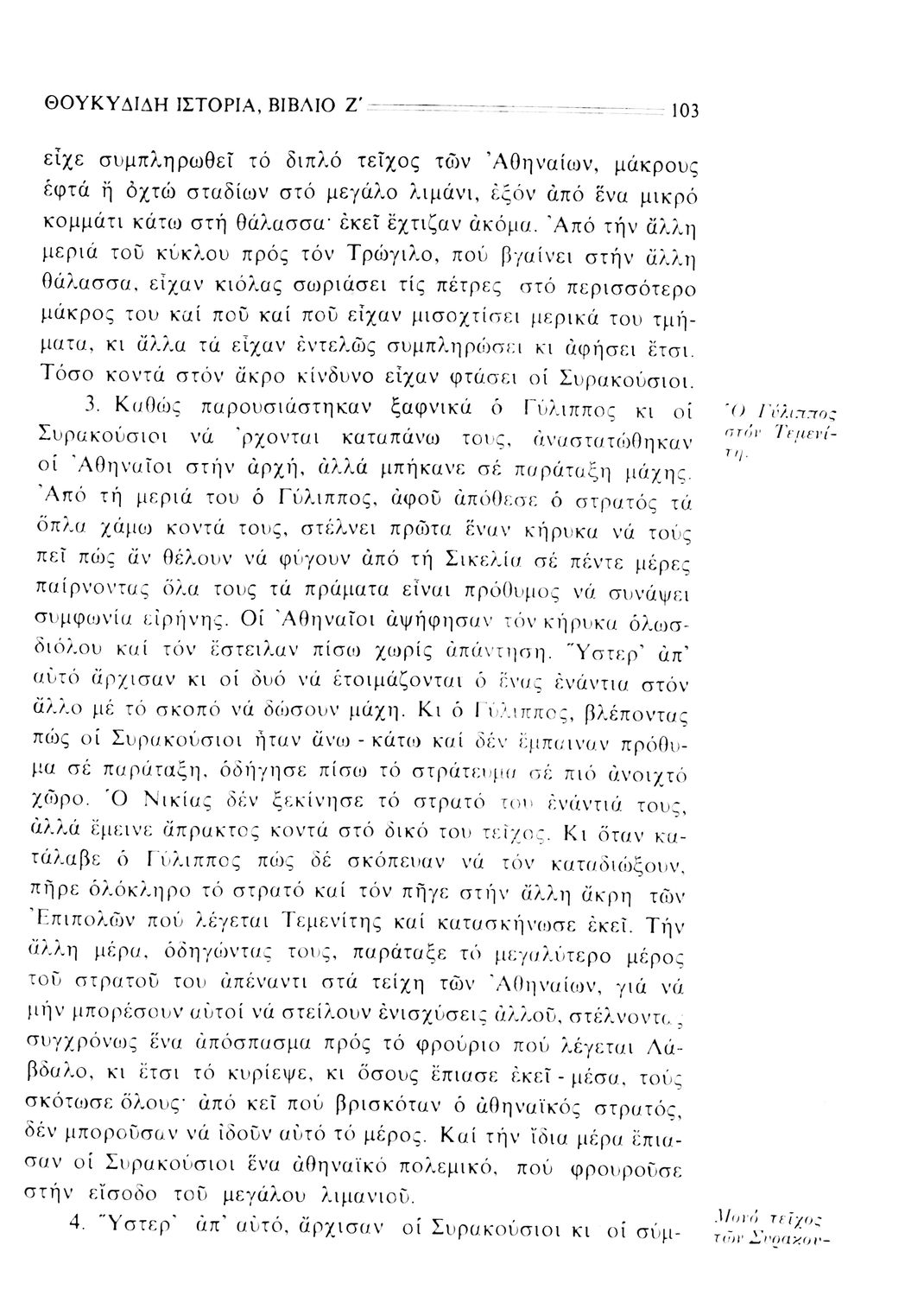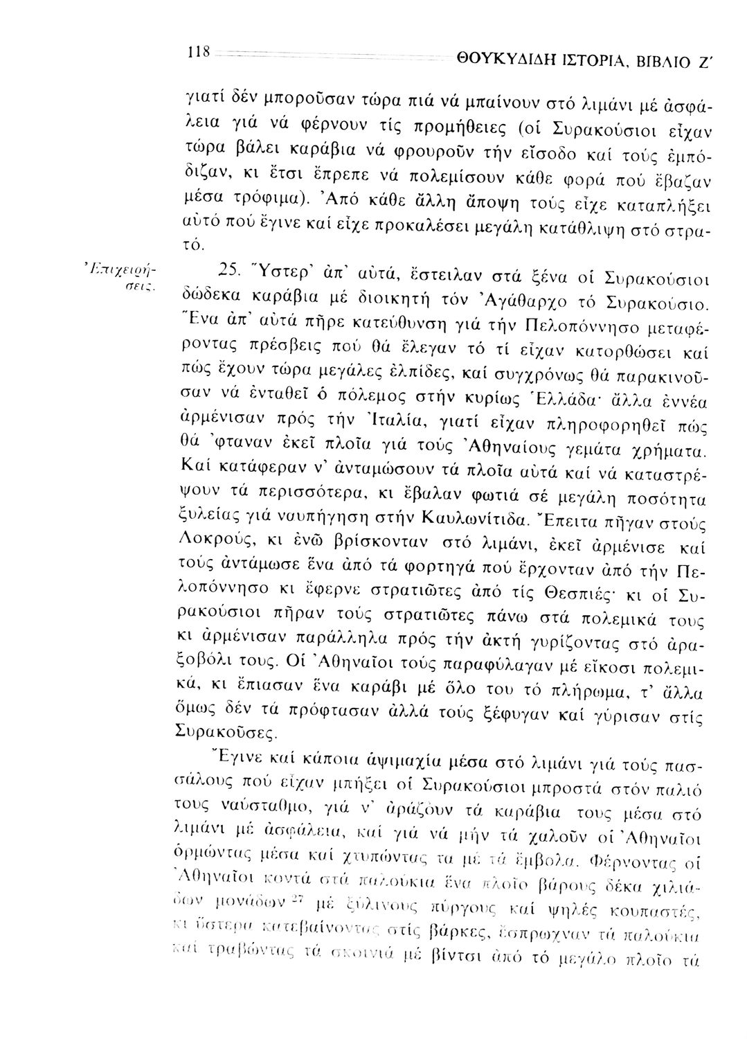 Σχολικό εγχειρίδιο Αρχαίων Ελληνικών Β΄ Γυμνασίου που περιλαμβάνει την μετάφραση των βιβλίων ΣΤ΄ και Ζ΄ της Ιστορίας του Θουκυδίδη, εισαγωγή στη ζωή και το έργο του, και ερμηνευτικά και πραγματολογικά σχόλια.