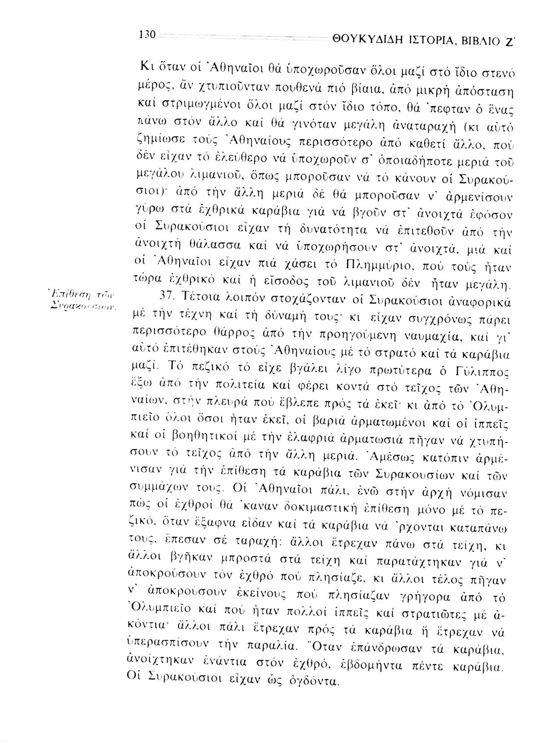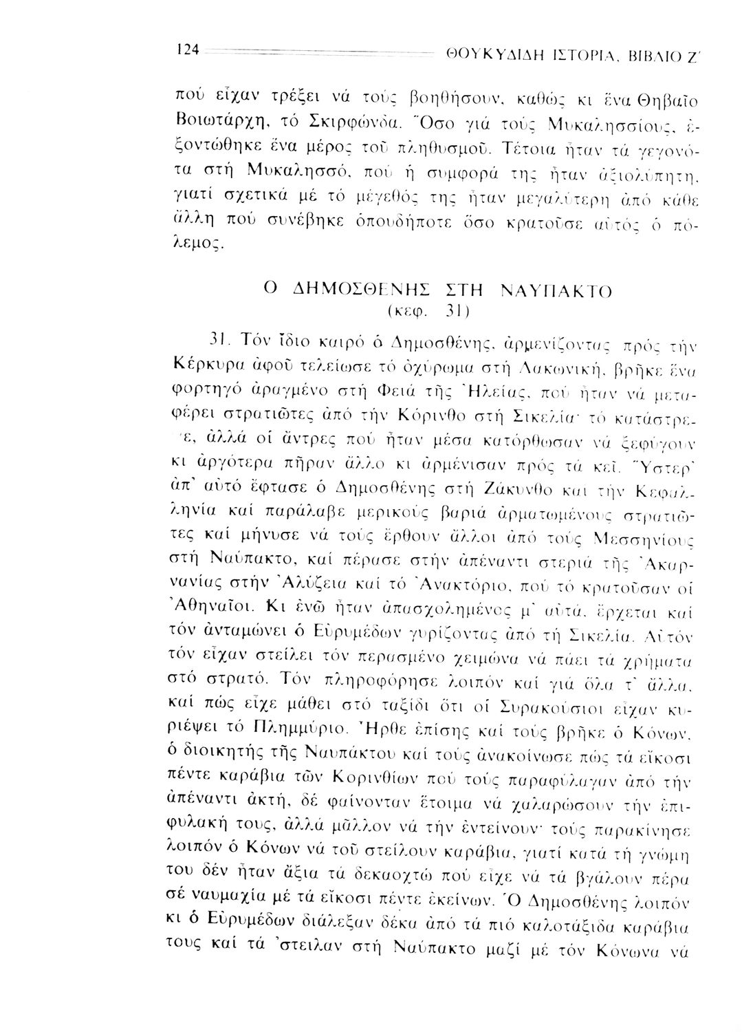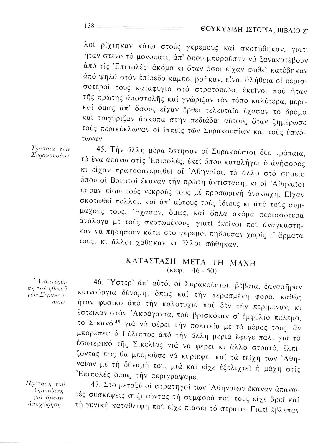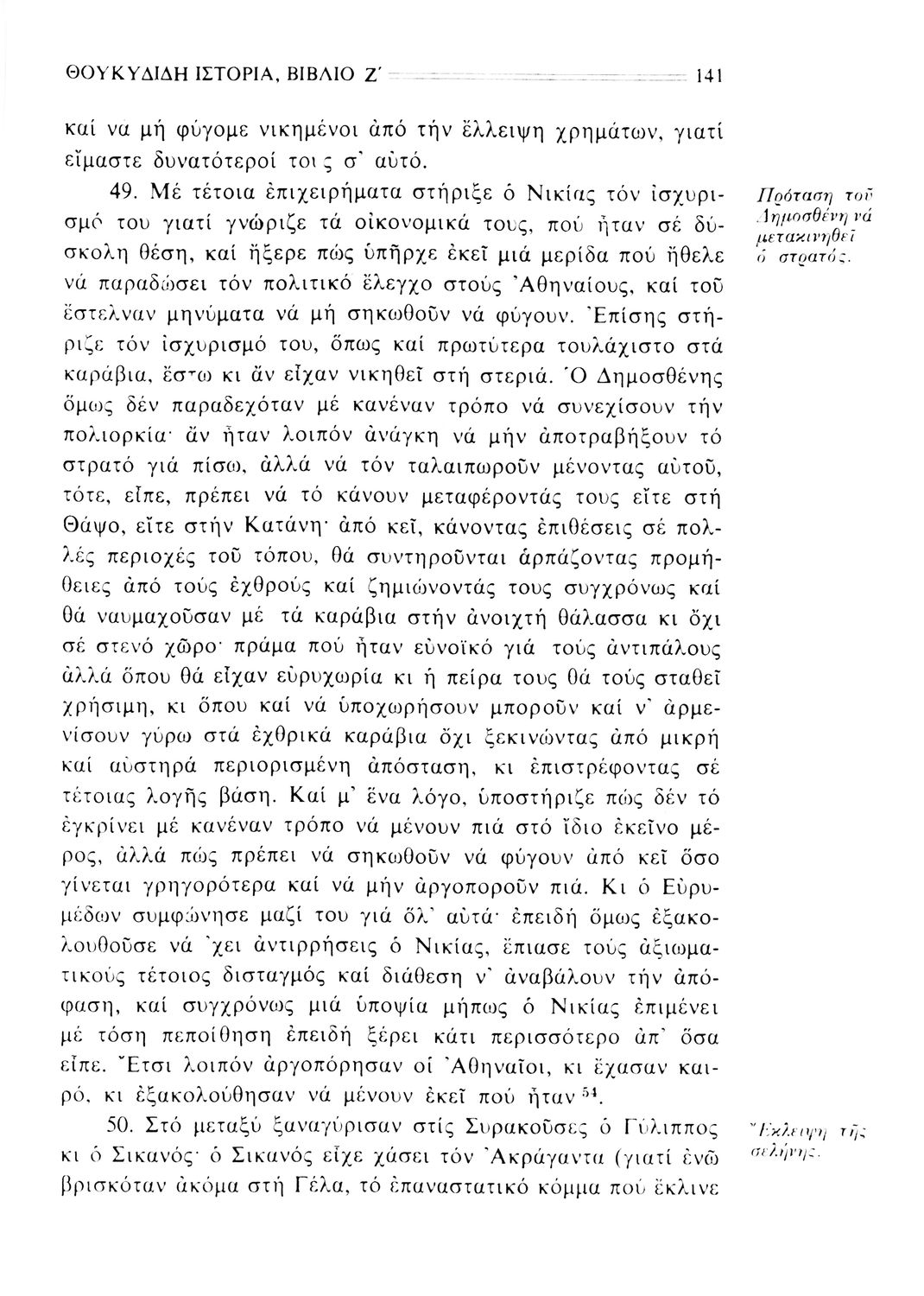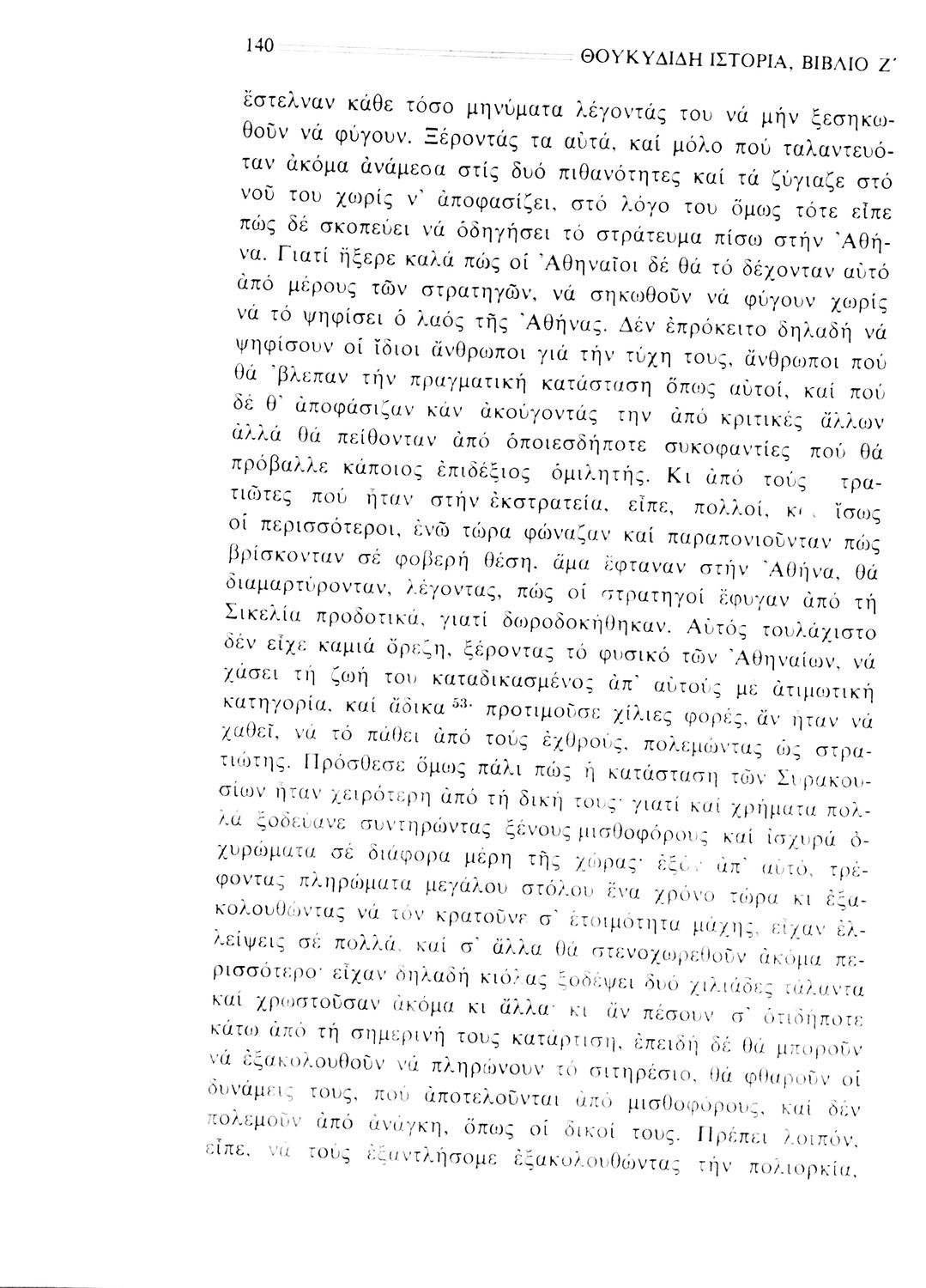 Σχολικό εγχειρίδιο Αρχαίων Ελληνικών Β΄ Γυμνασίου που περιλαμβάνει την μετάφραση των βιβλίων ΣΤ΄ και Ζ΄ της Ιστορίας του Θουκυδίδη, εισαγωγή στη ζωή και το έργο του, και ερμηνευτικά και πραγματολογικά σχόλια.