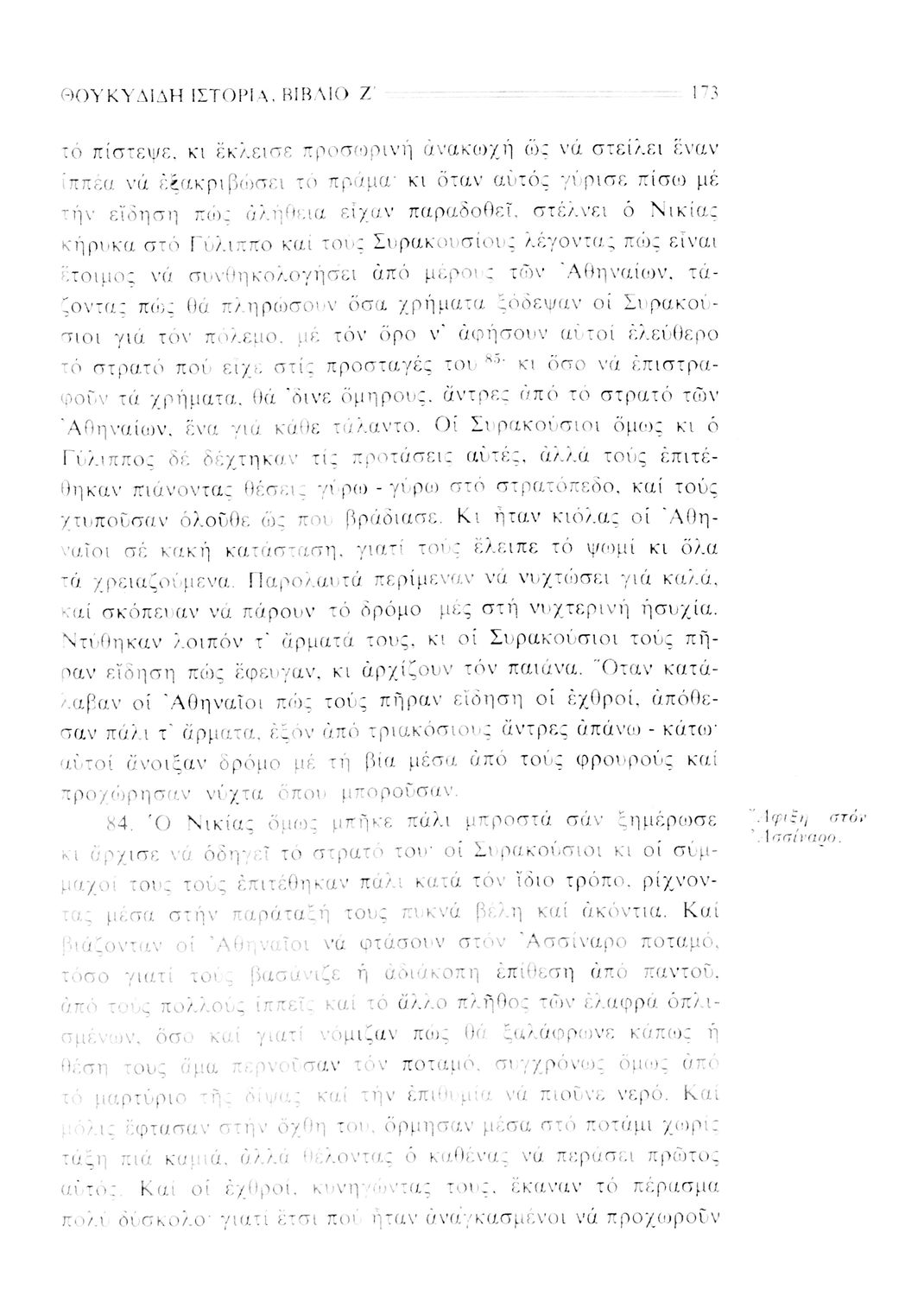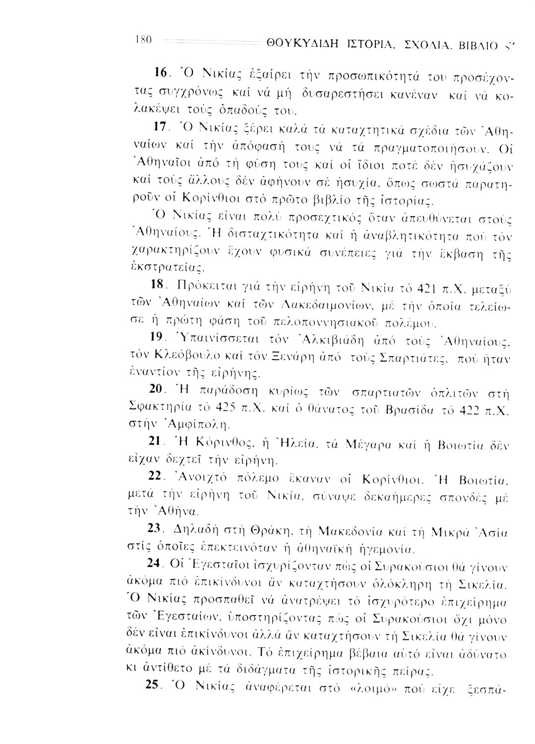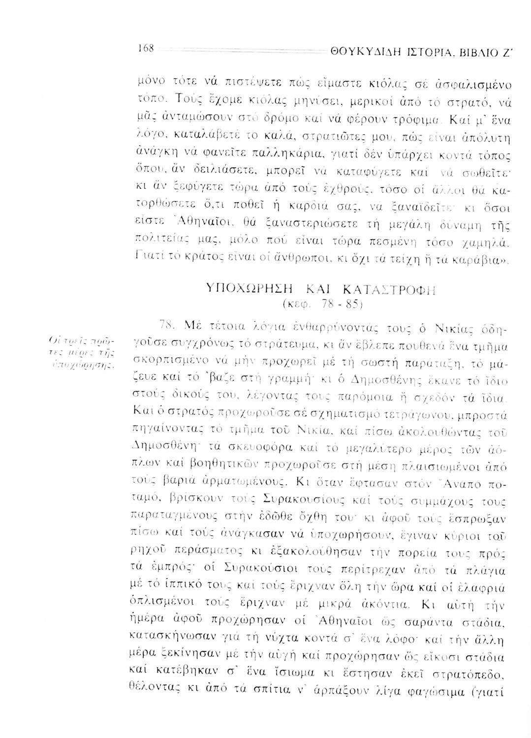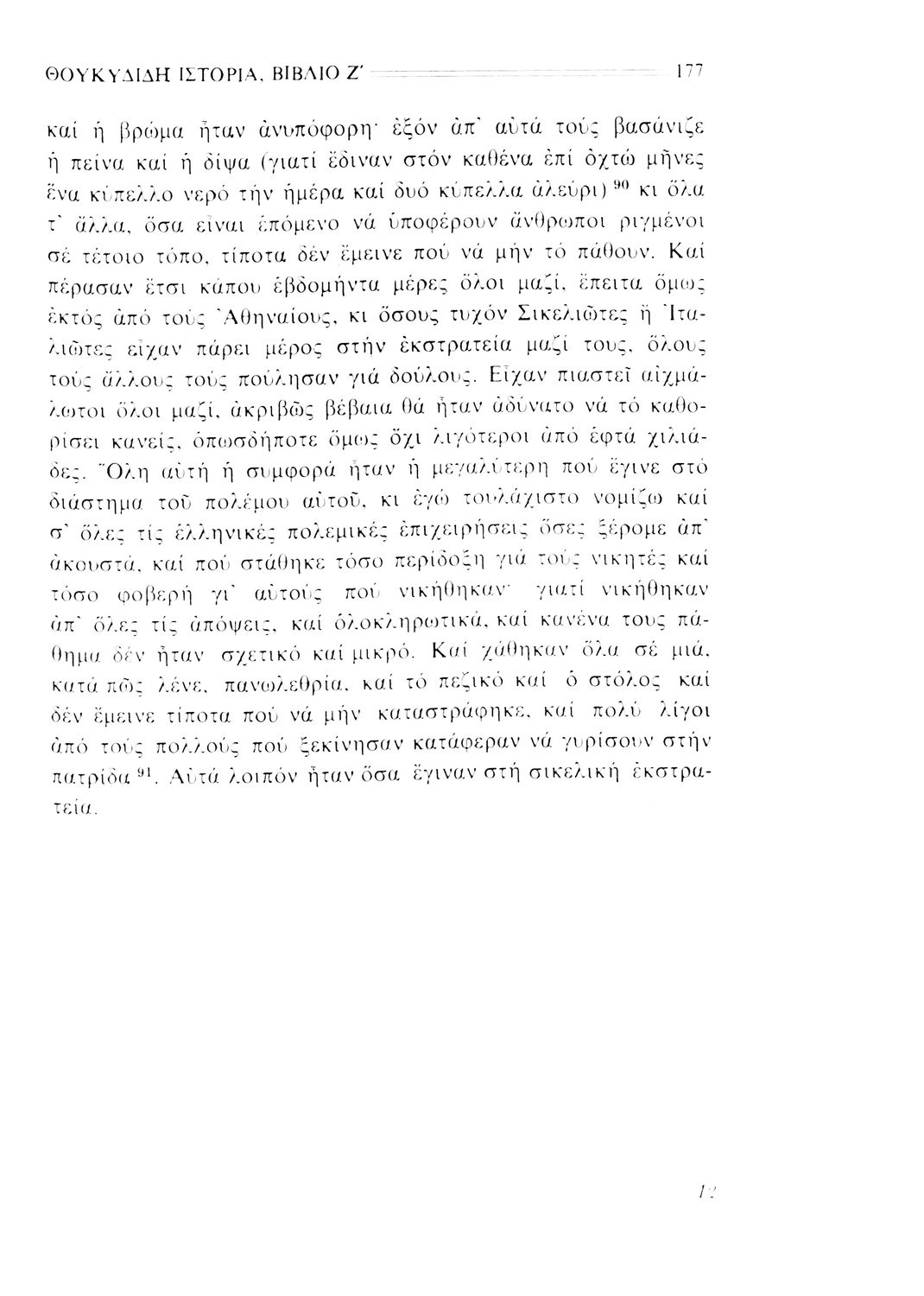 Σχολικό εγχειρίδιο Αρχαίων Ελληνικών Β΄ Γυμνασίου που περιλαμβάνει την μετάφραση των βιβλίων ΣΤ΄ και Ζ΄ της Ιστορίας του Θουκυδίδη, εισαγωγή στη ζωή και το έργο του, και ερμηνευτικά και πραγματολογικά σχόλια.
