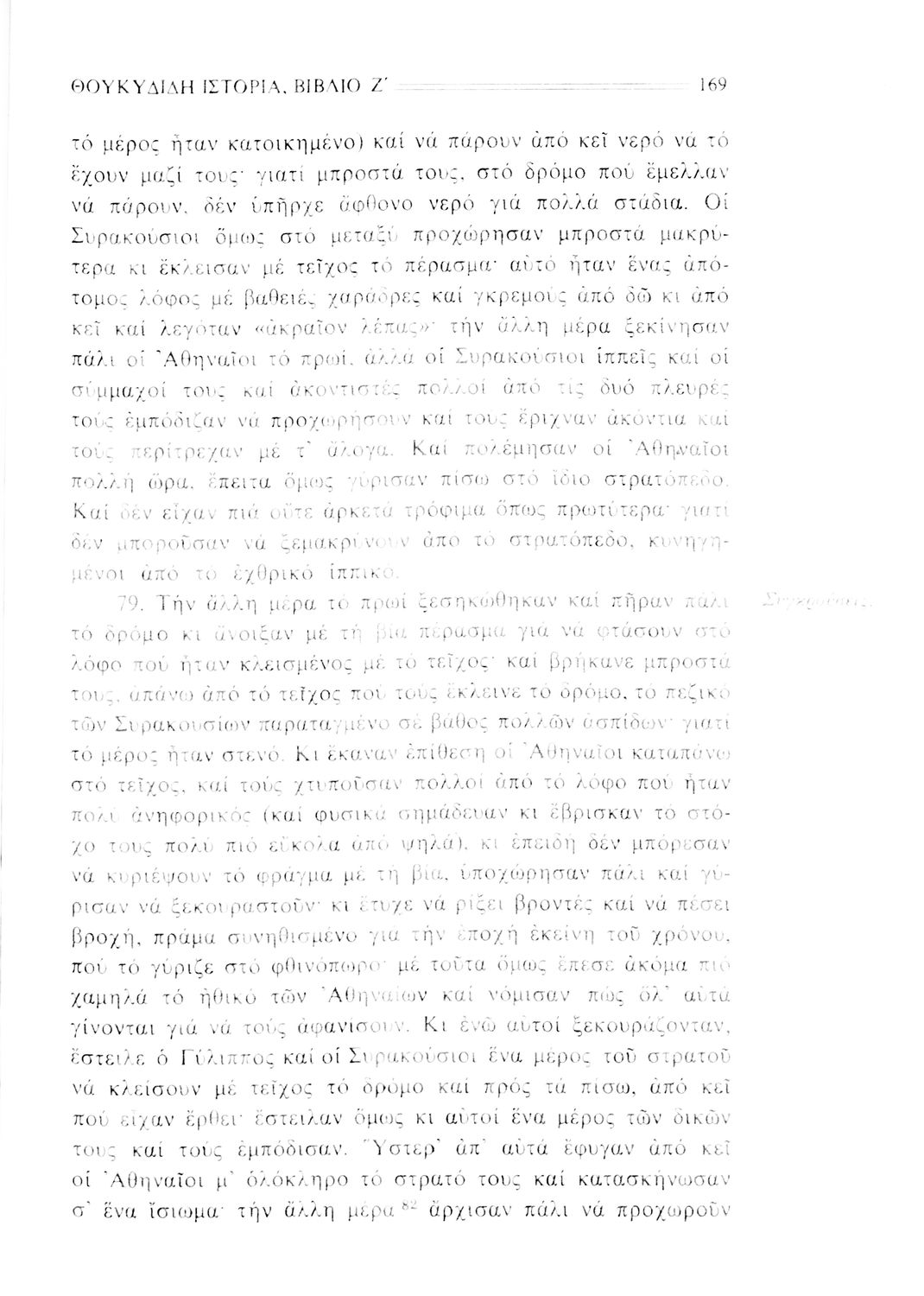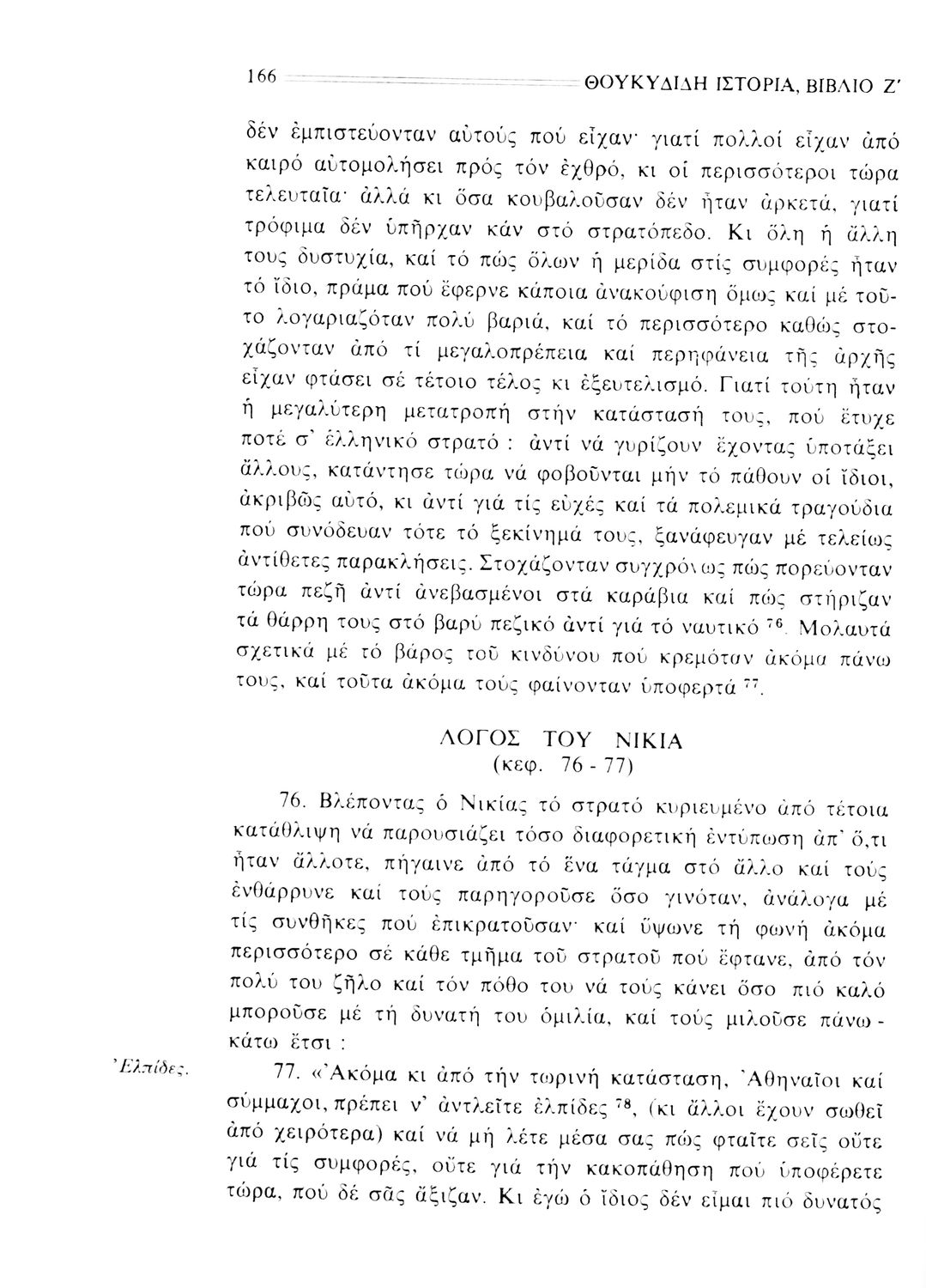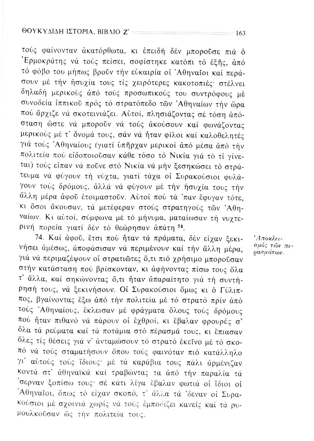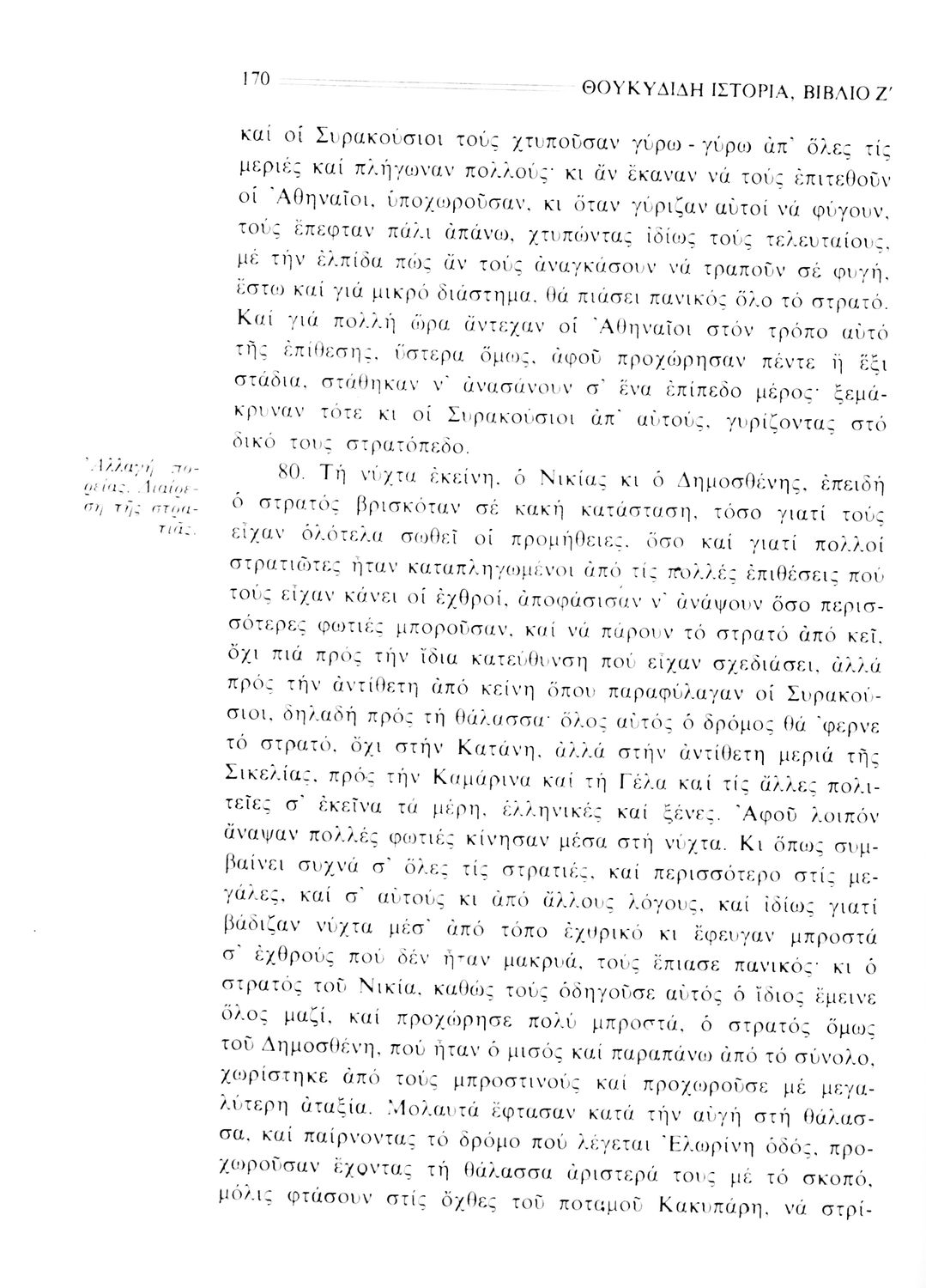 Σχολικό εγχειρίδιο Αρχαίων Ελληνικών Β΄ Γυμνασίου που περιλαμβάνει την μετάφραση των βιβλίων ΣΤ΄ και Ζ΄ της Ιστορίας του Θουκυδίδη, εισαγωγή στη ζωή και το έργο του, και ερμηνευτικά και πραγματολογικά σχόλια.