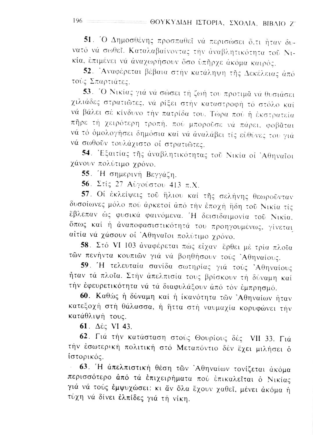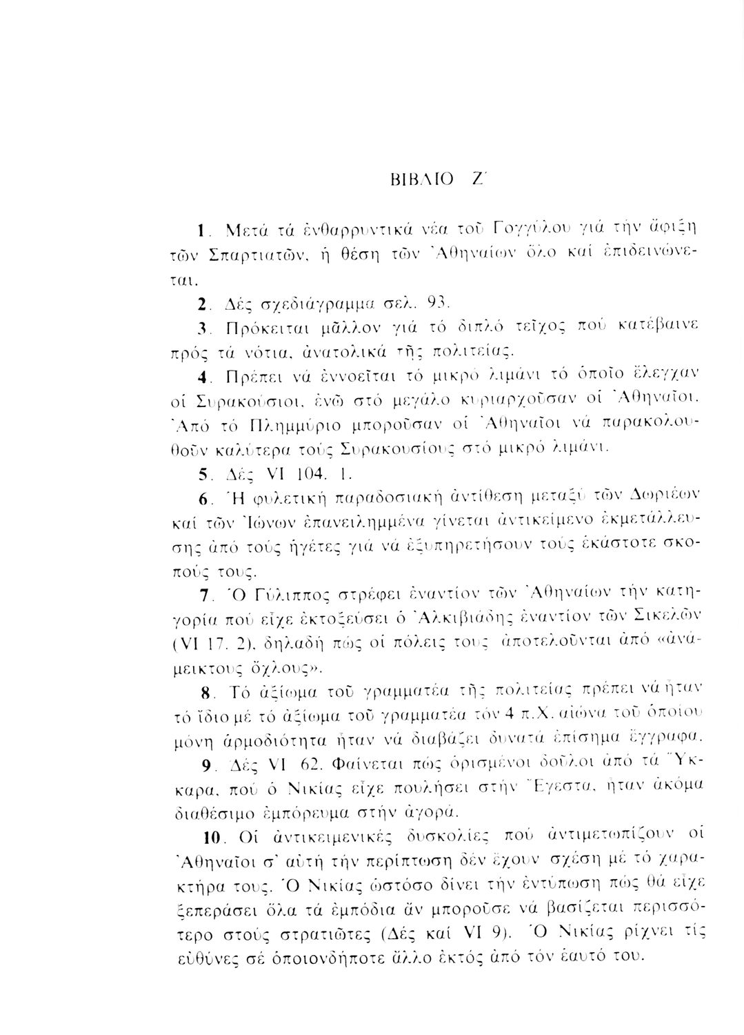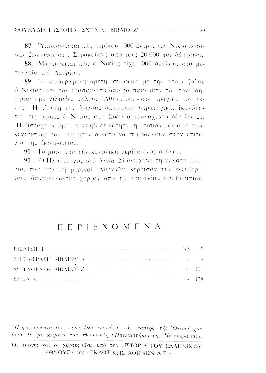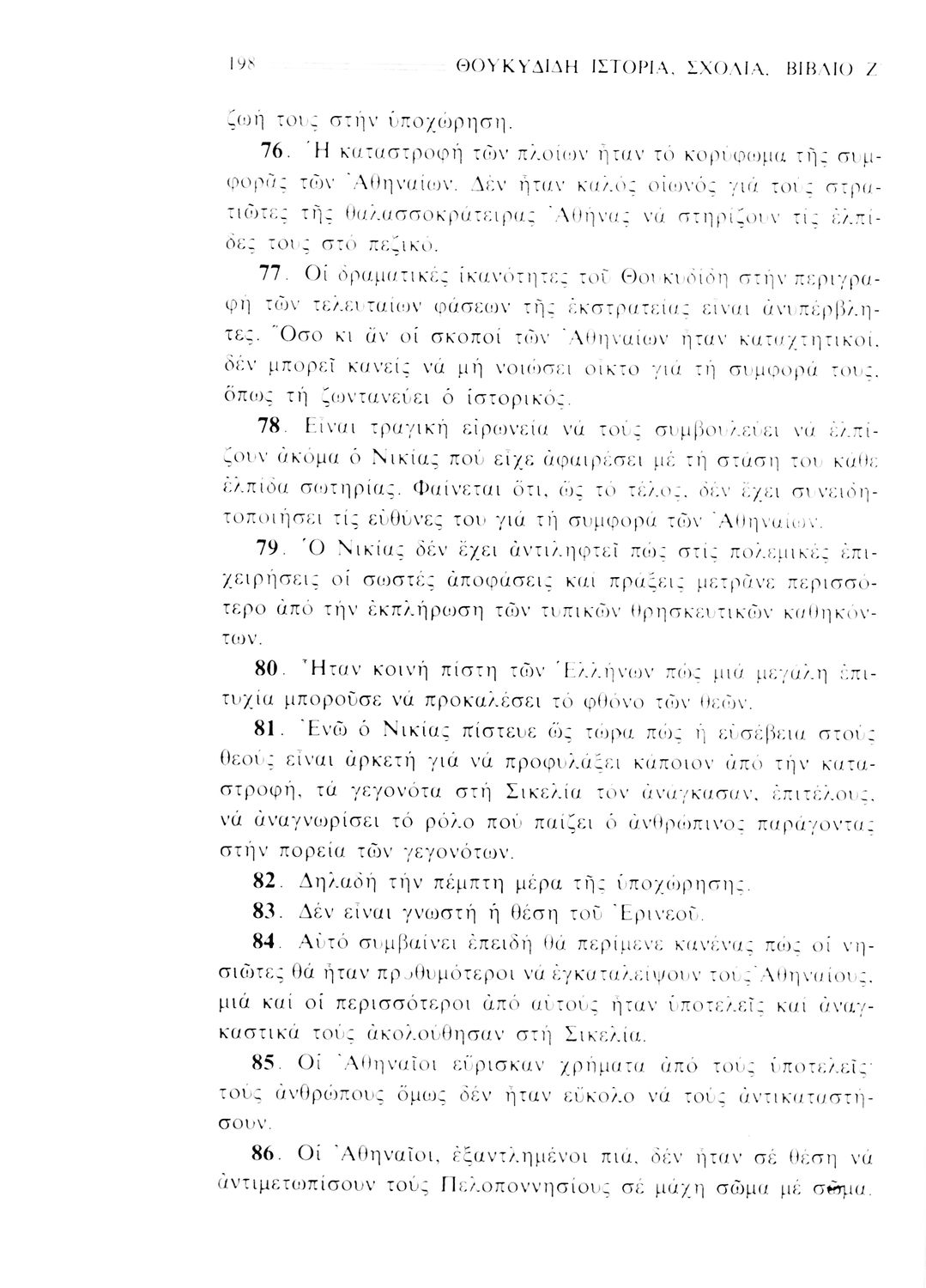 Σχολικό εγχειρίδιο Αρχαίων Ελληνικών Β΄ Γυμνασίου που περιλαμβάνει την μετάφραση των βιβλίων ΣΤ΄ και Ζ΄ της Ιστορίας του Θουκυδίδη, εισαγωγή στη ζωή και το έργο του, και ερμηνευτικά και πραγματολογικά σχόλια.