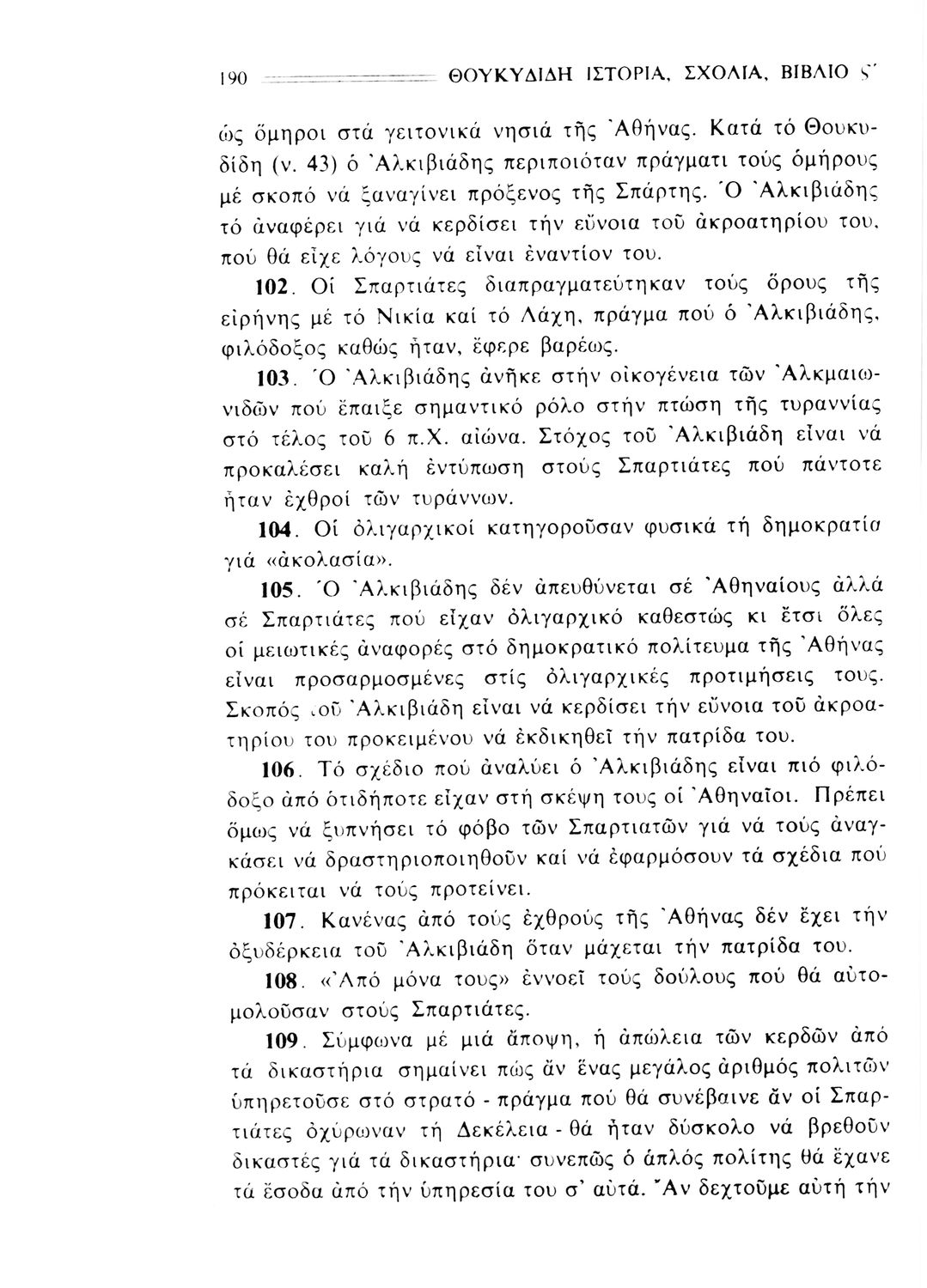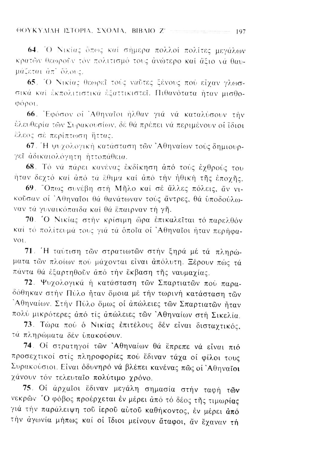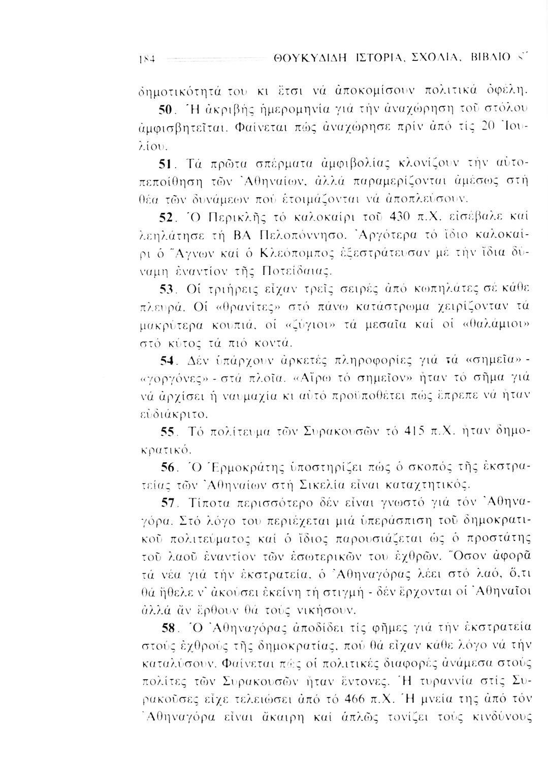 Σχολικό εγχειρίδιο Αρχαίων Ελληνικών Β΄ Γυμνασίου που περιλαμβάνει την μετάφραση των βιβλίων ΣΤ΄ και Ζ΄ της Ιστορίας του Θουκυδίδη, εισαγωγή στη ζωή και το έργο του, και ερμηνευτικά και πραγματολογικά σχόλια.