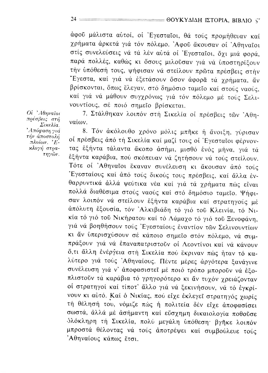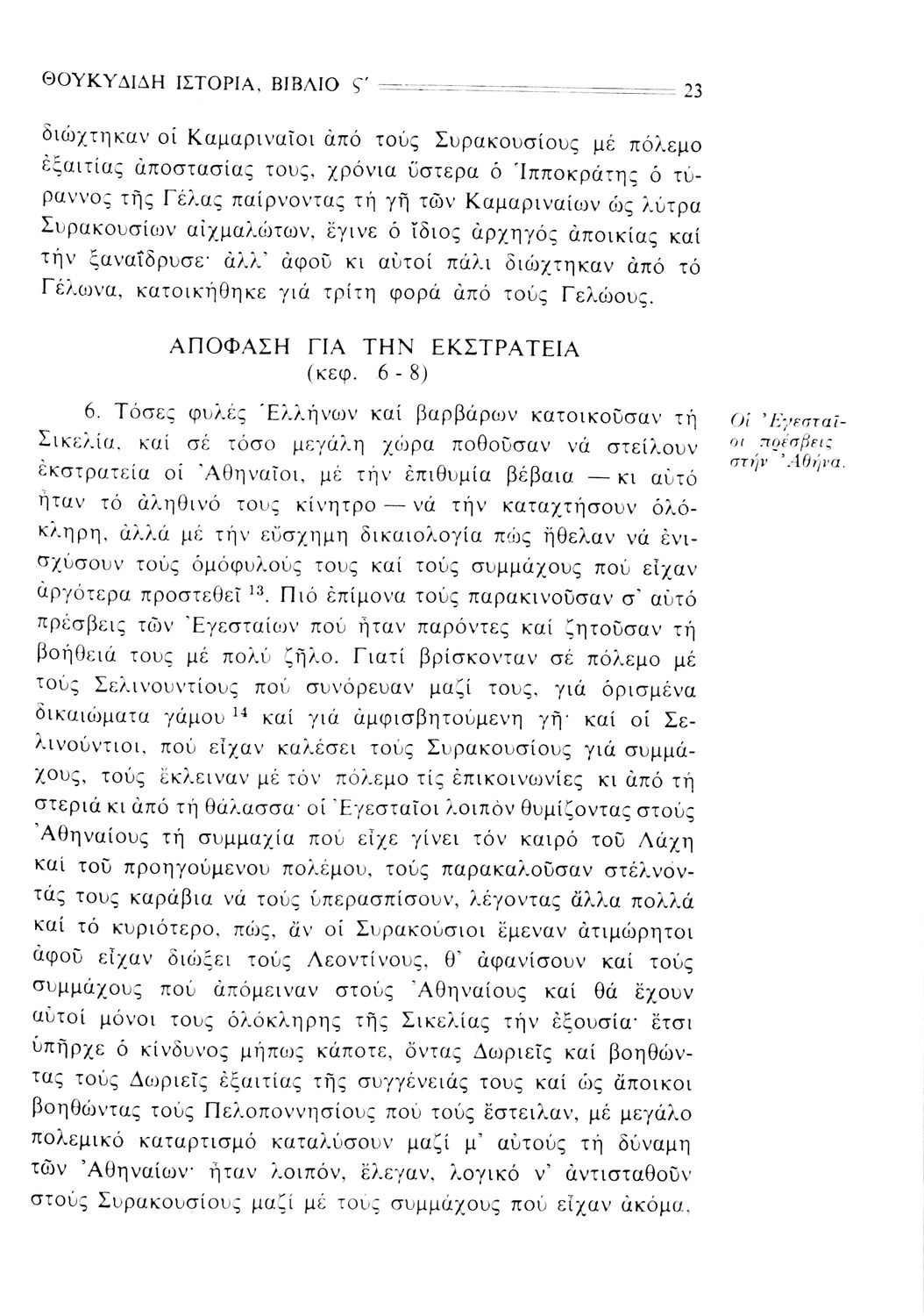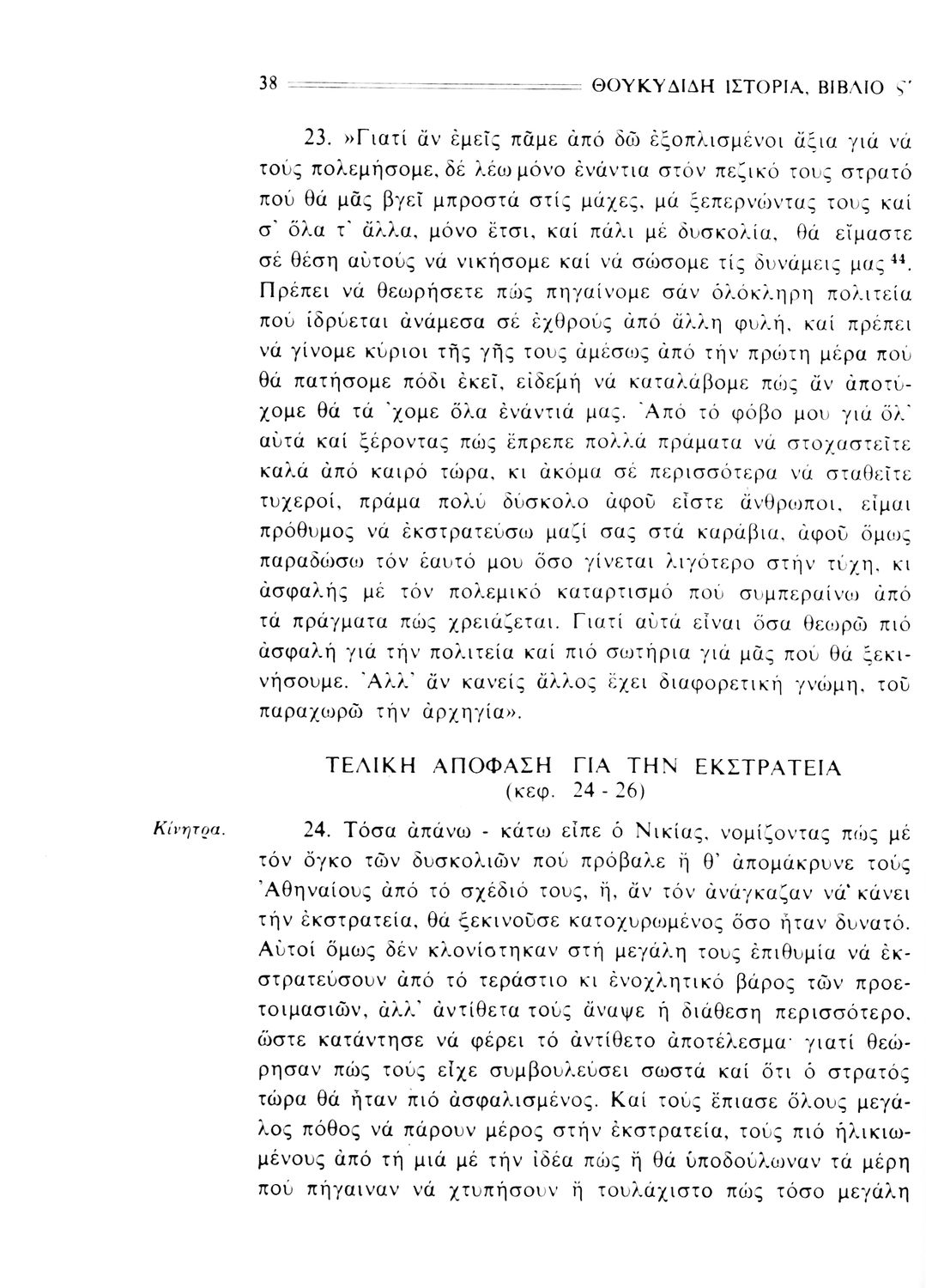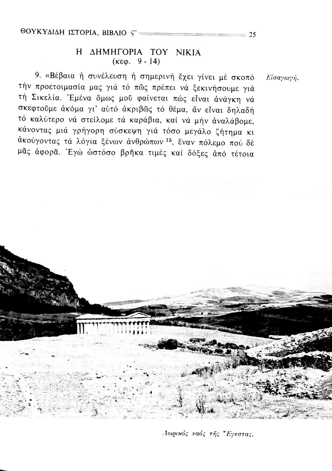 Σχολικό εγχειρίδιο Αρχαίων Ελληνικών Β΄ Γυμνασίου που περιλαμβάνει την μετάφραση των βιβλίων ΣΤ΄ και Ζ΄ της Ιστορίας του Θουκυδίδη, εισαγωγή στη ζωή και το έργο του, και ερμηνευτικά και πραγματολογικά σχόλια.