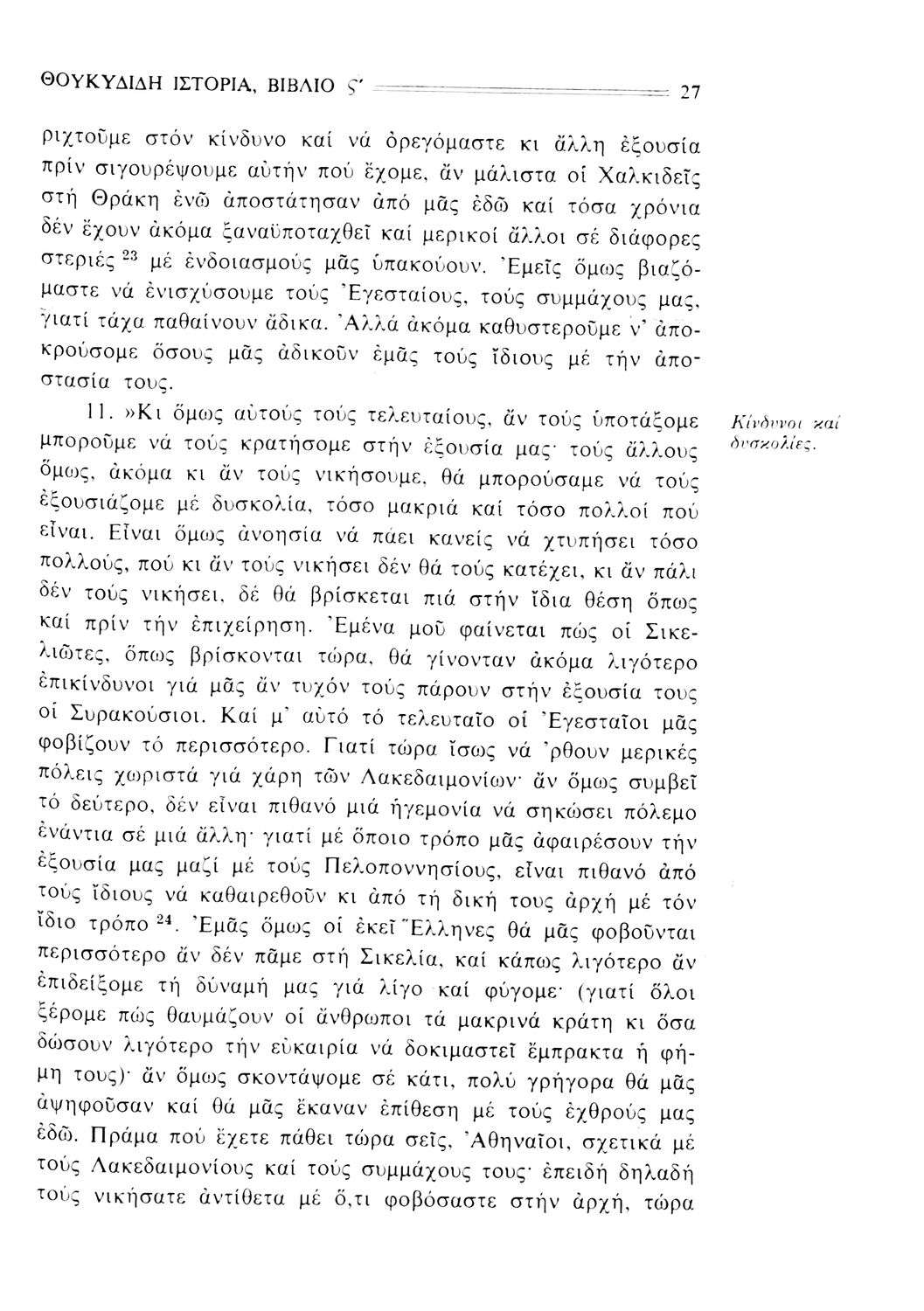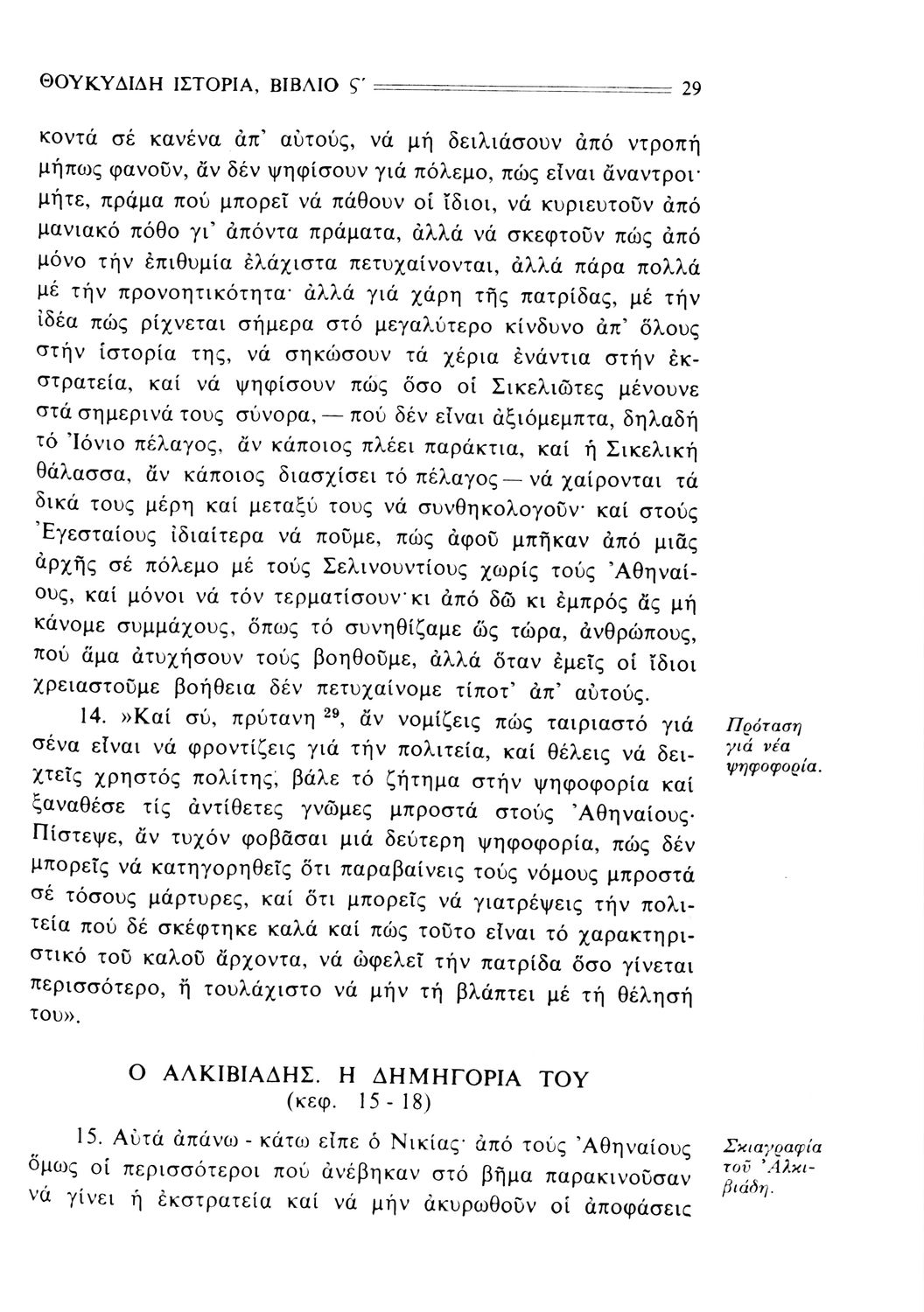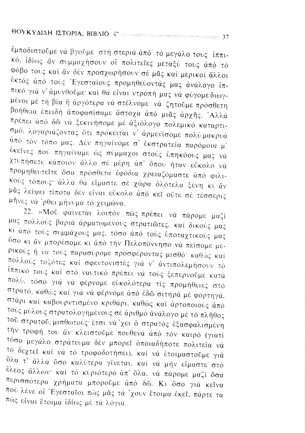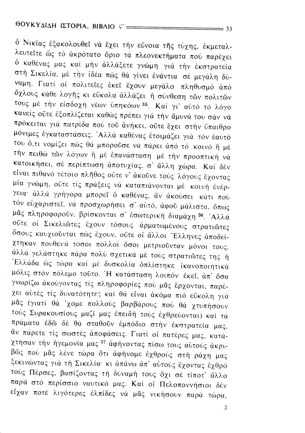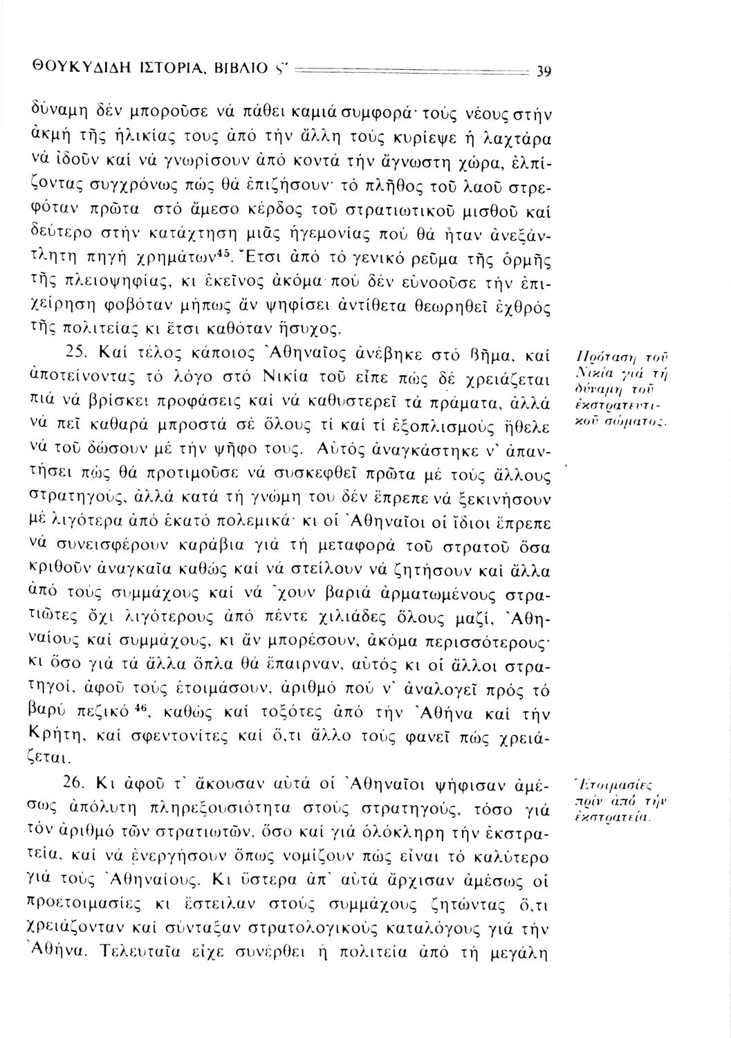 Σχολικό εγχειρίδιο Αρχαίων Ελληνικών Β΄ Γυμνασίου που περιλαμβάνει την μετάφραση των βιβλίων ΣΤ΄ και Ζ΄ της Ιστορίας του Θουκυδίδη, εισαγωγή στη ζωή και το έργο του, και ερμηνευτικά και πραγματολογικά σχόλια.